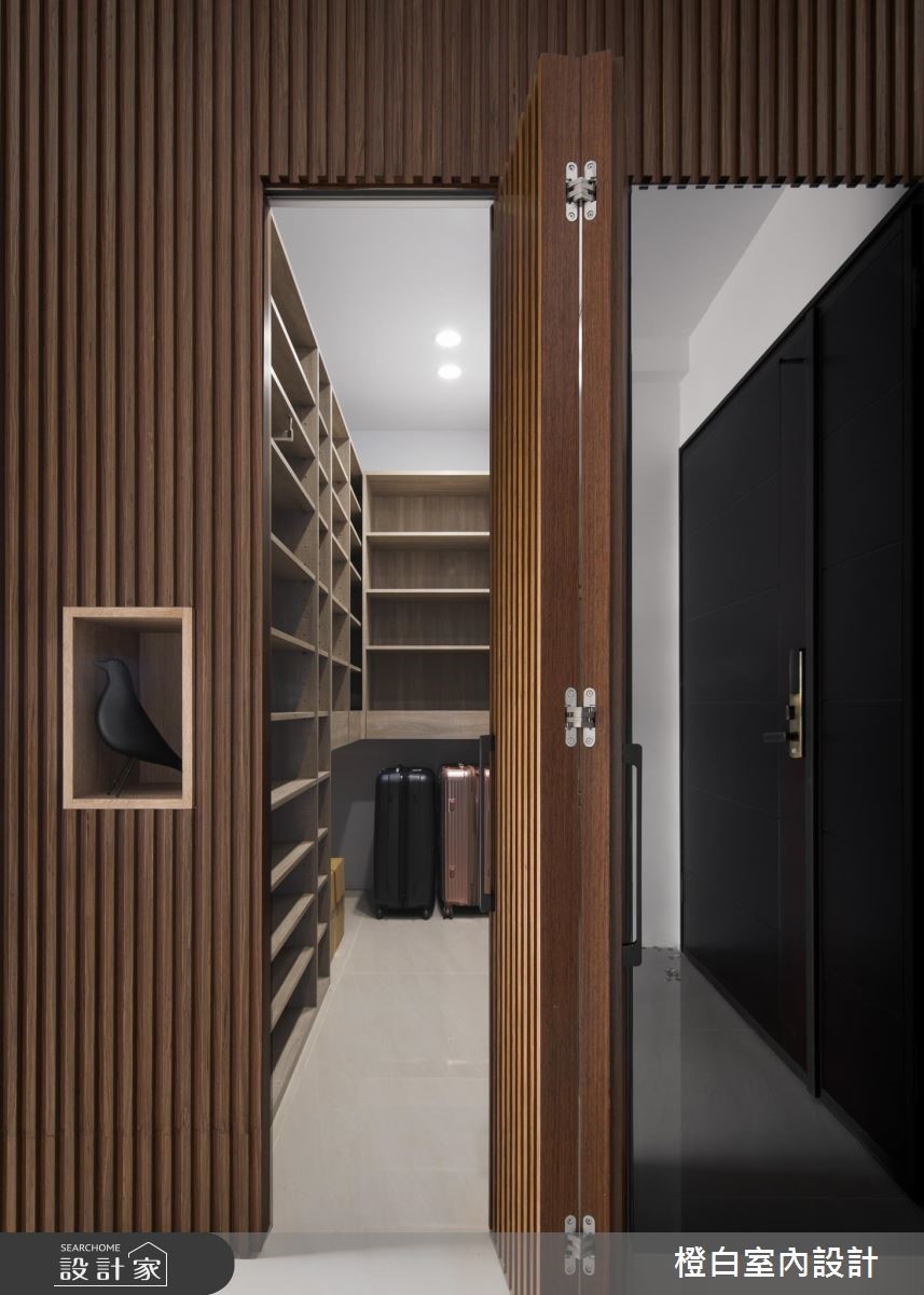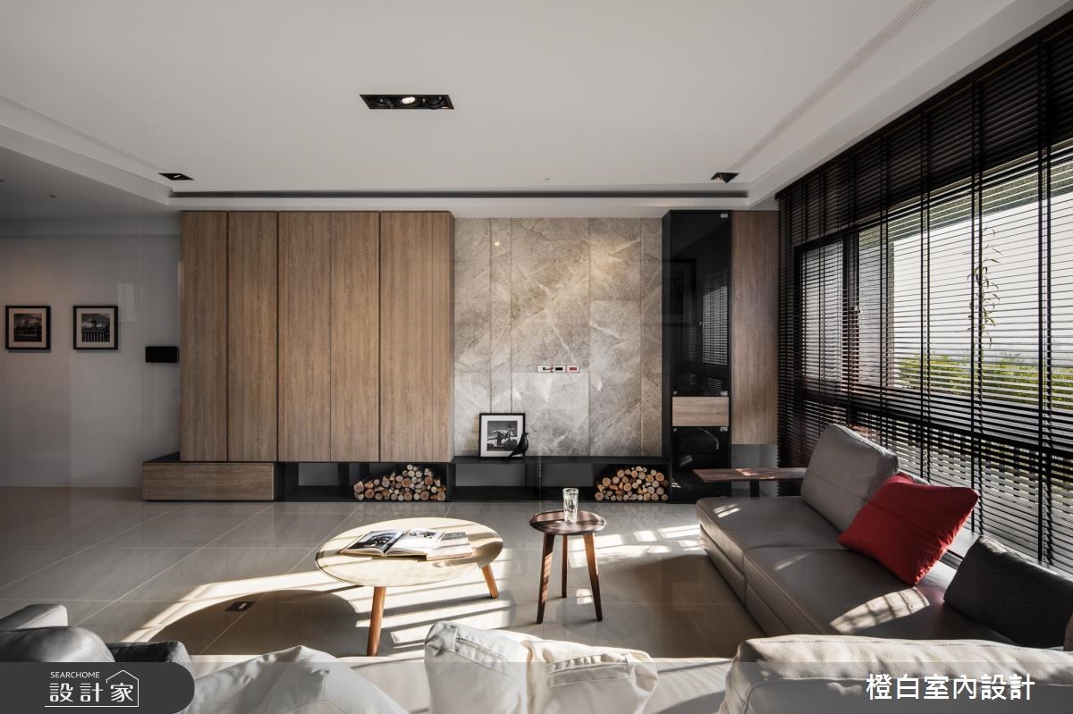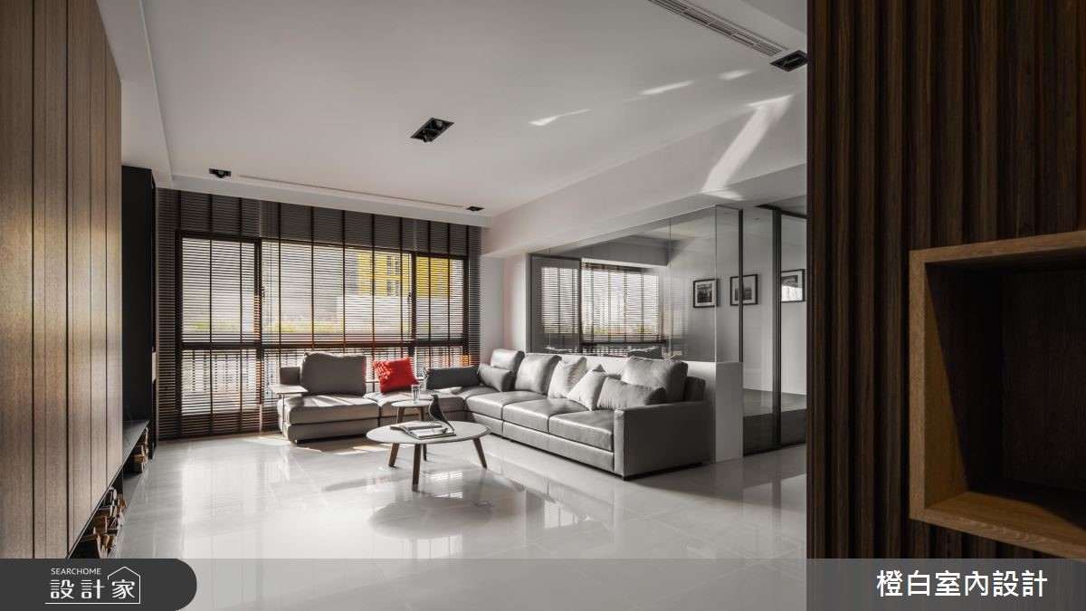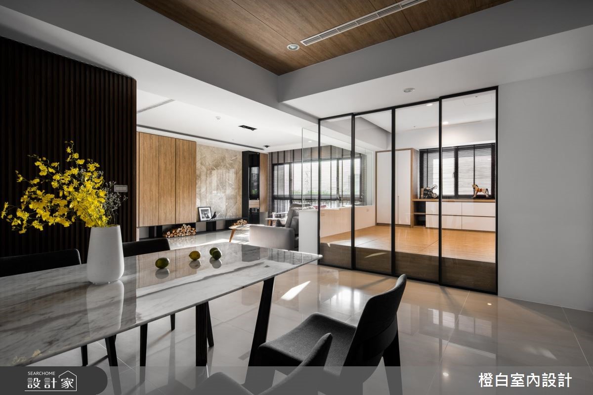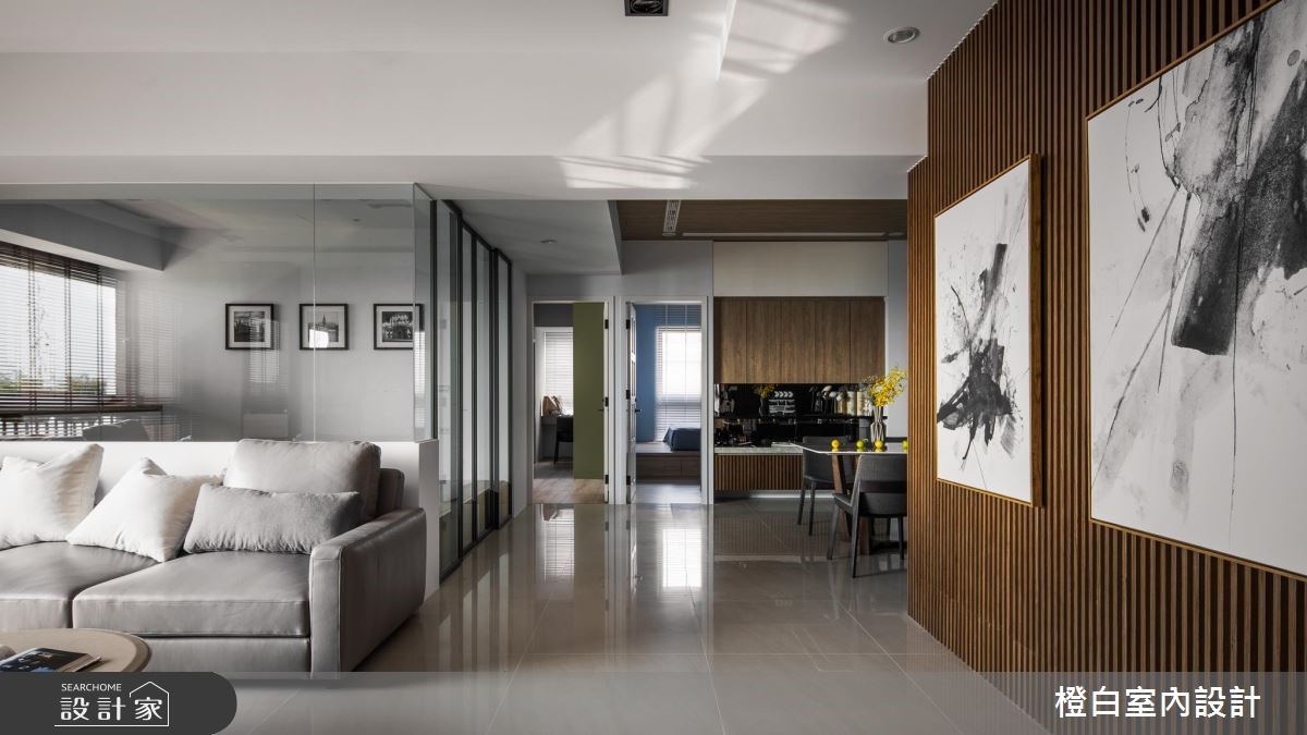 有2名孩子的屋主除了注重公领域的互动性,也希望能有充足收纳,打扫上也要方便容易。且看擅长现代风格营造的橙白设计如何利用隐藏、开放技巧,给予165平方米空间清透好设计 【俐落線條勾勒,加入木石的溫度】在玄关利用格栅隐藏门片打造L型置物间,容纳一家四口的鞋量,更兼具行李箱收纳机能。公共空间利用开放设计串连,巧妙取消隔断,改以通透玻璃区隔客厅和书房,为位于中央无采光的餐厅带来充沛光源,为一家人打造宽阔的领域。电视墙以大理石拼组,展现俐落线条。而一旁的大面积柜体则有效收纳各式物品,都能物归其所,避免空间杂乱。卧室根据家庭成员的喜好设定墙面色彩,次卧皆以架高地坪的方式扩充收纳量、提供各年龄层应用的高度机动性。