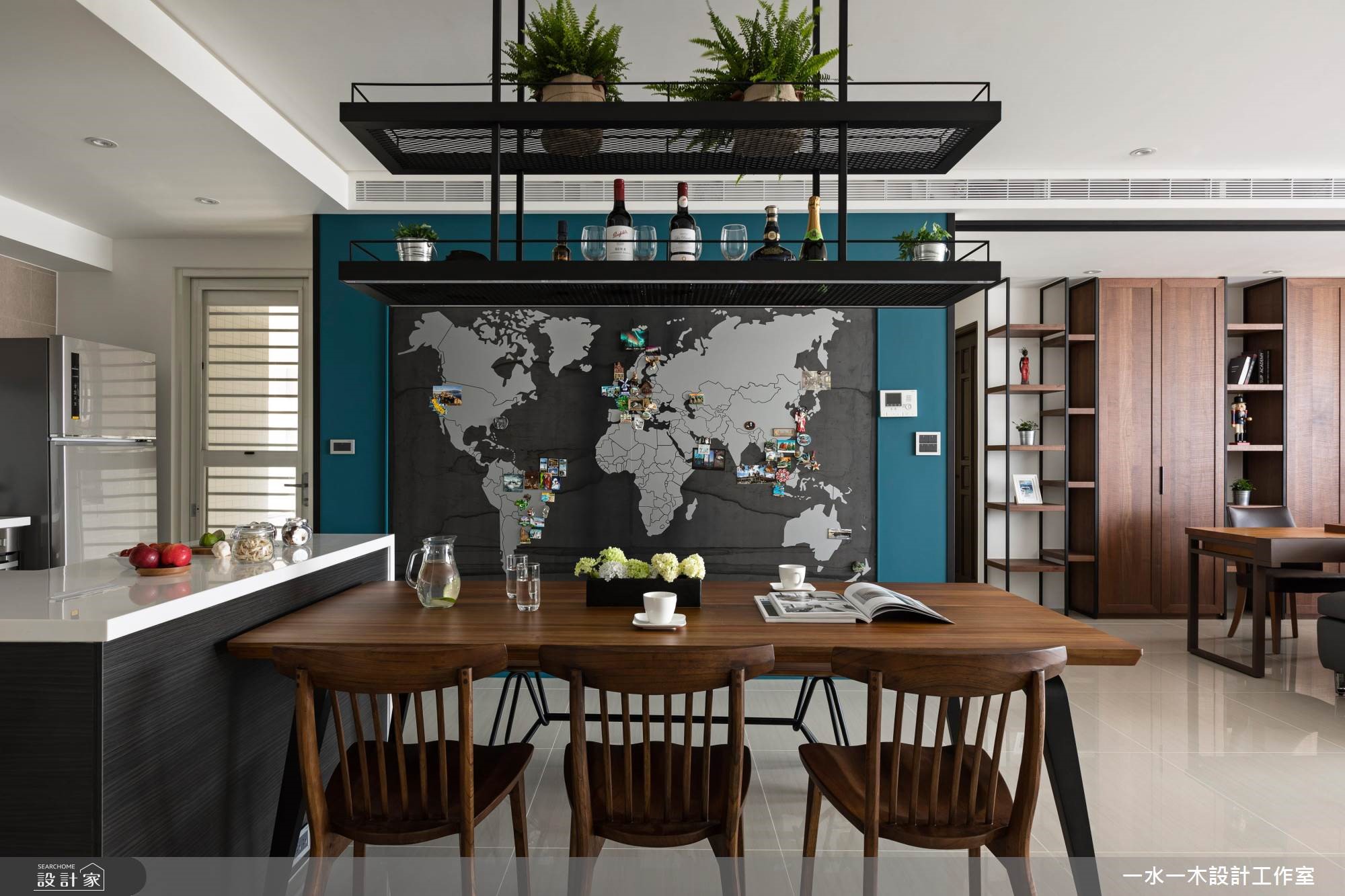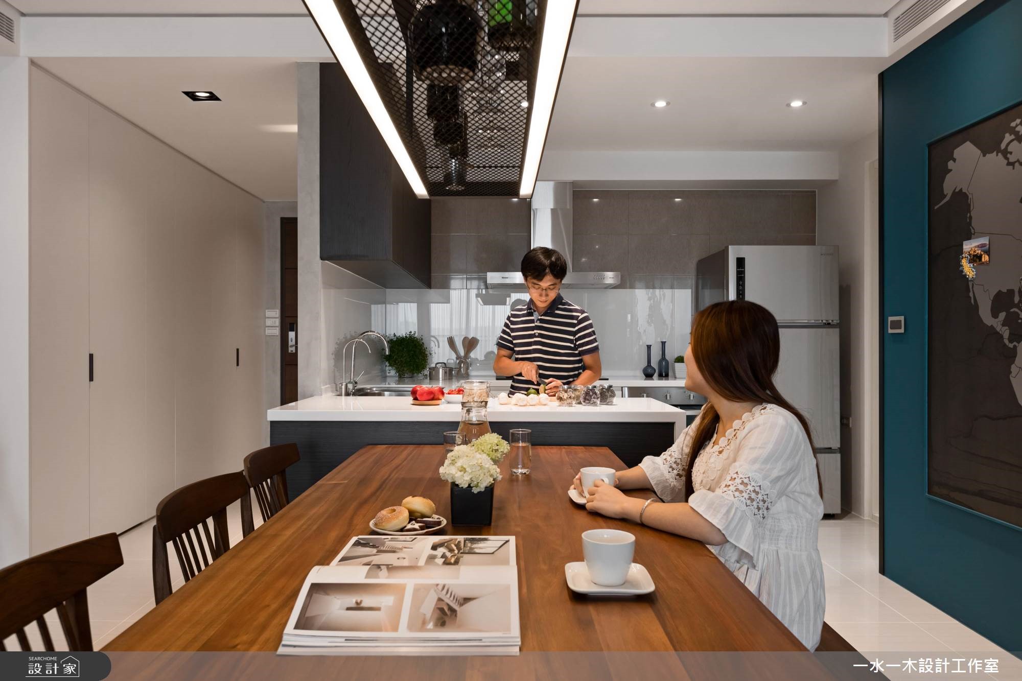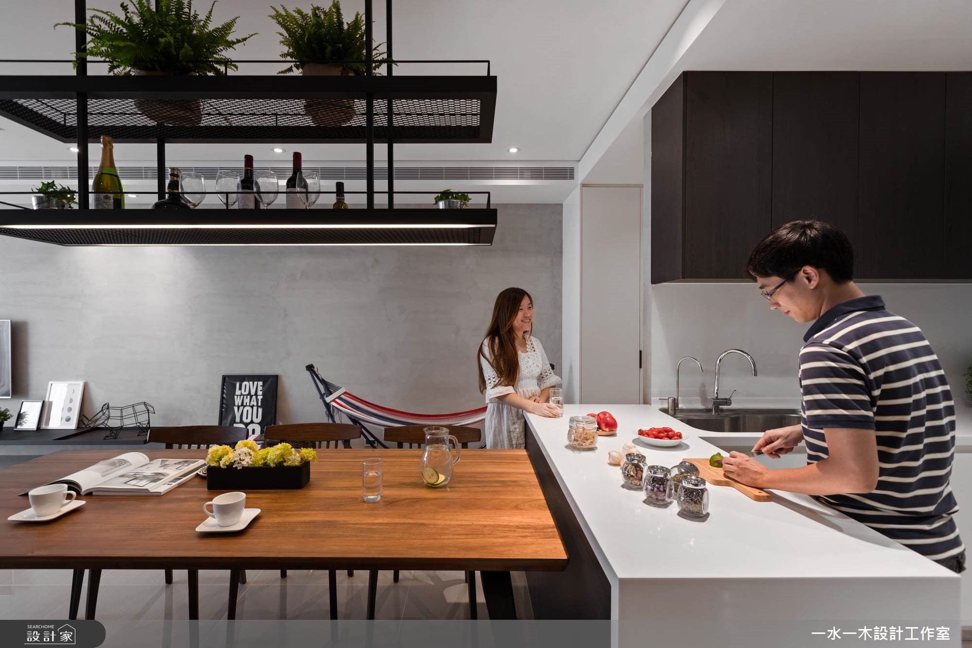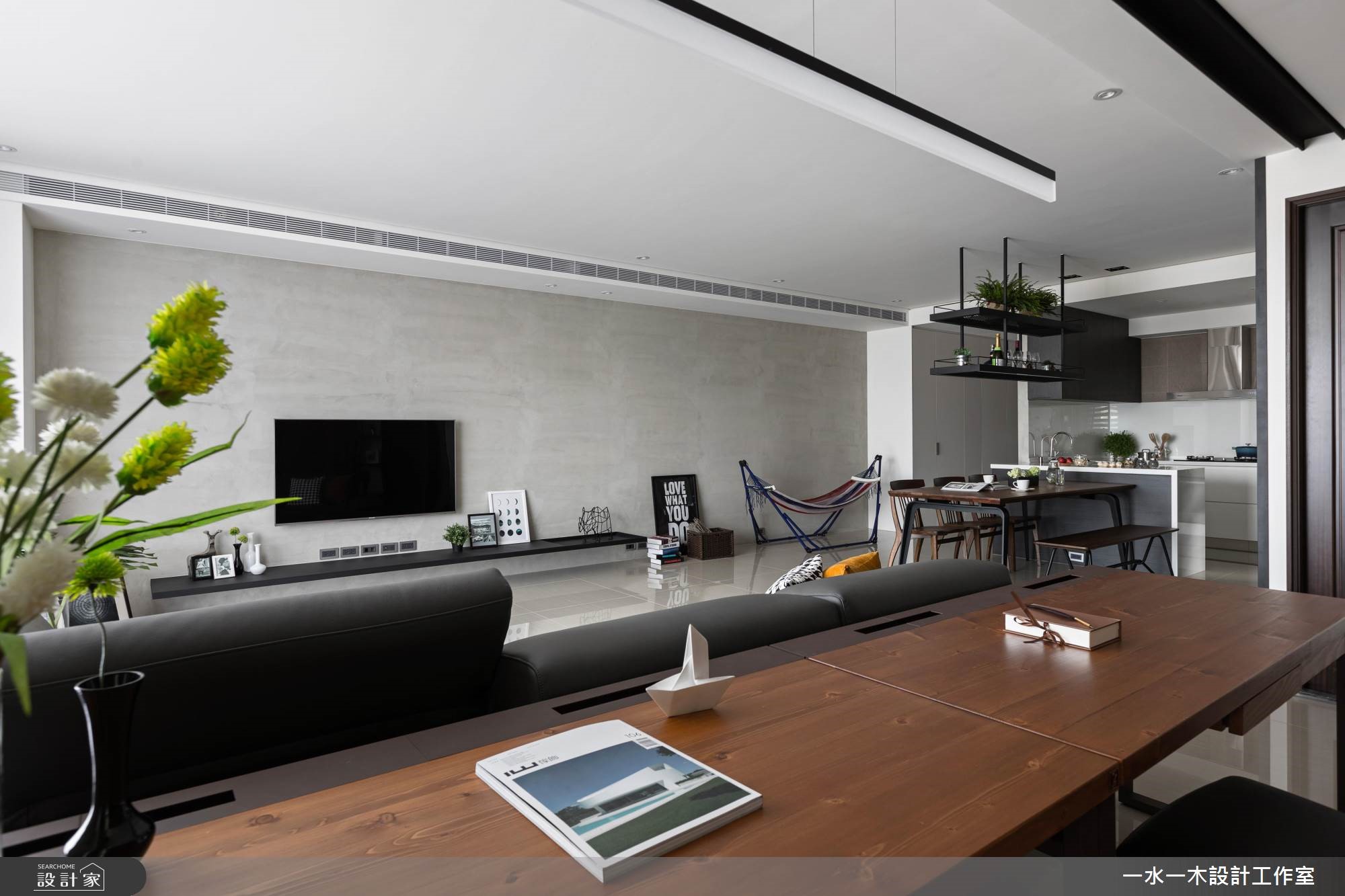 身为工程师的夫妻俩,渴望拥有专属一家人的居住空间。因此,透过简约朴实的灰色壁面拉出整片公领域范围,在木纹与铁件的元素安排,替空间注入人文温度。餐厅黑板墙上创造一面世界地图,夫妻俩标示出到访过的国度,纪录着旅行时的美丽足迹与回忆。【清水模混搭木纹,空间更沉稳】旋开大门走进室内,先是半开放式的厨房映入眼帘,接着是宽阔明亮的公领域。整体空间无刻意装修,大量的留白下,让收纳柜与主体墙设计演绎出屋主的性格,同时创造出渐层的视觉风貌。清水模质感的电视墙面调和出清新纾压的氛围,沙发后方的书房区设置深色木纹柜体,巧妙界定出主次领域,型塑安定清静的阅读环境。中岛与餐桌串连出餐厨空间的核心地带,上方垂挂一座铁件层架强化收纳主卧室以白及灰紫色系配搭,延续公领域的清爽无压。次卧则作为多功能空间,安排钢管支柱,并贴覆镜面,一方面让空间更显放大,另一方面当女屋主跳钢管舞时,还能自我欣赏动人的舞姿。