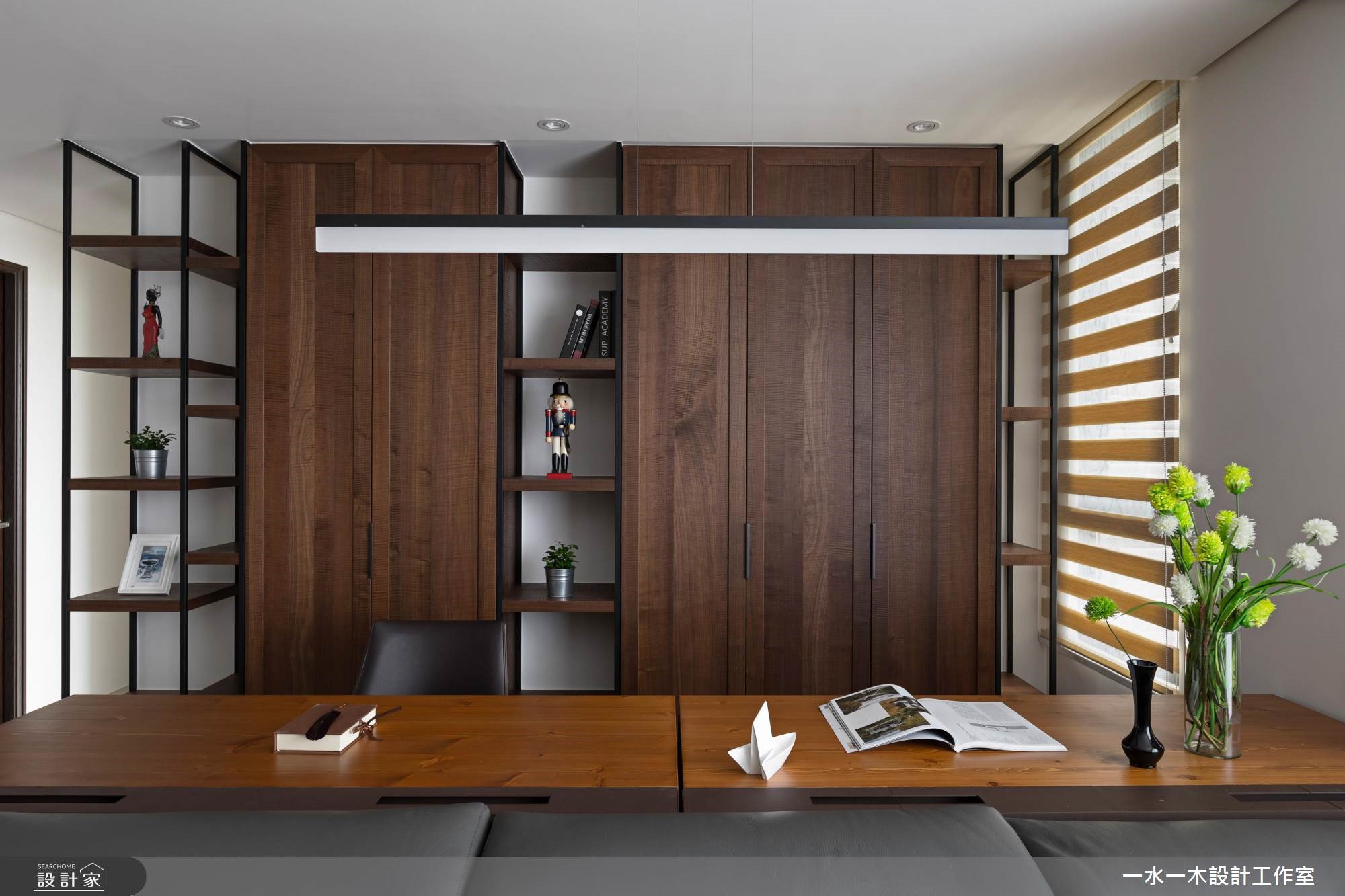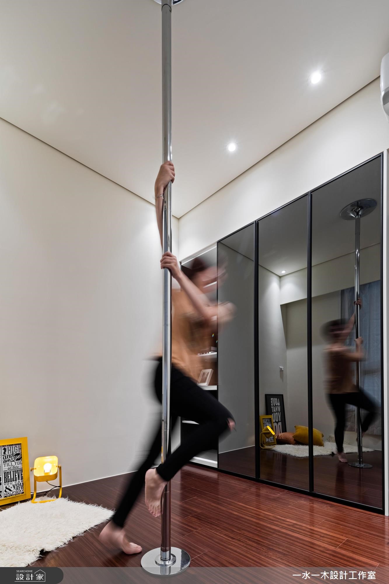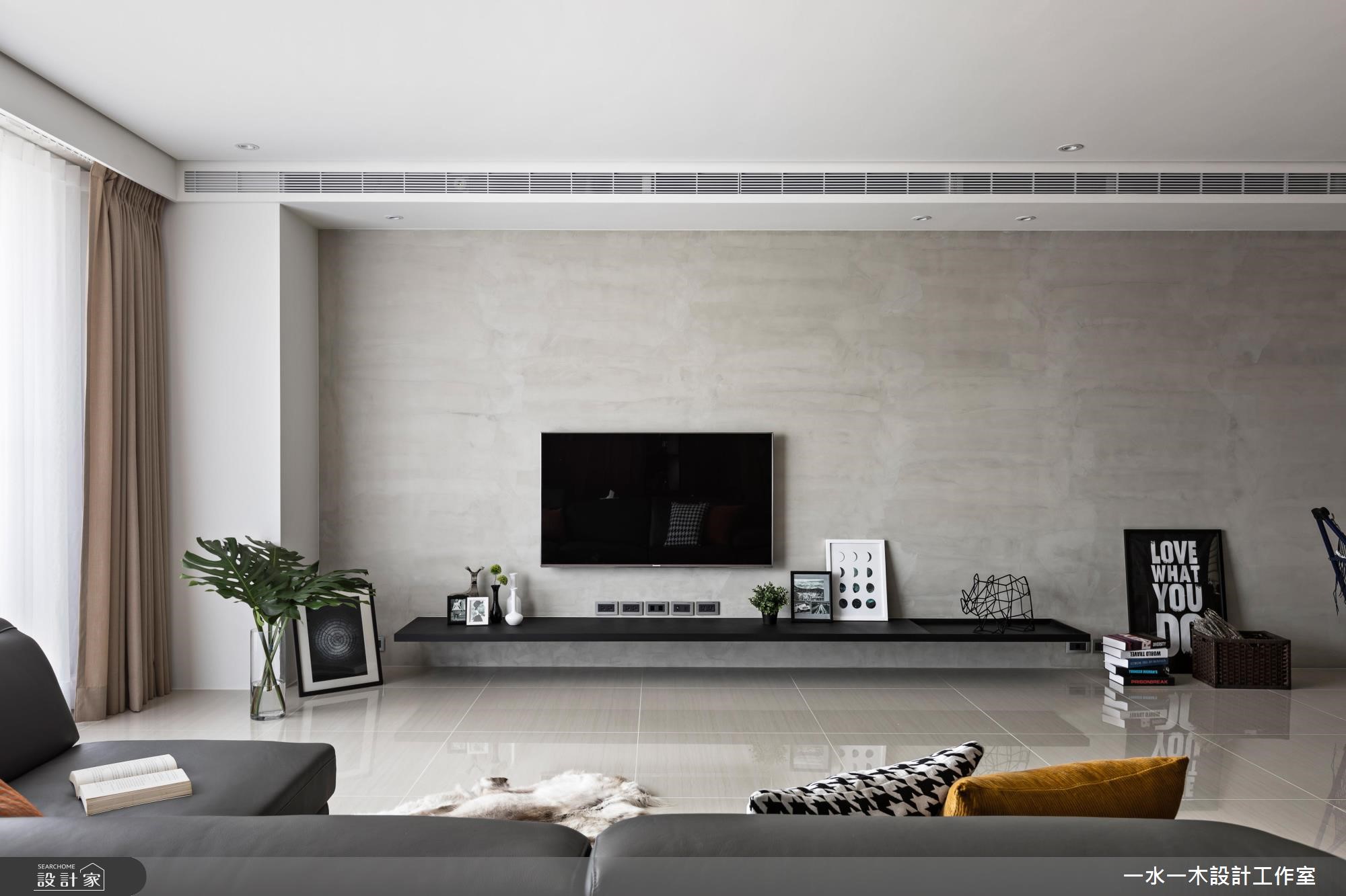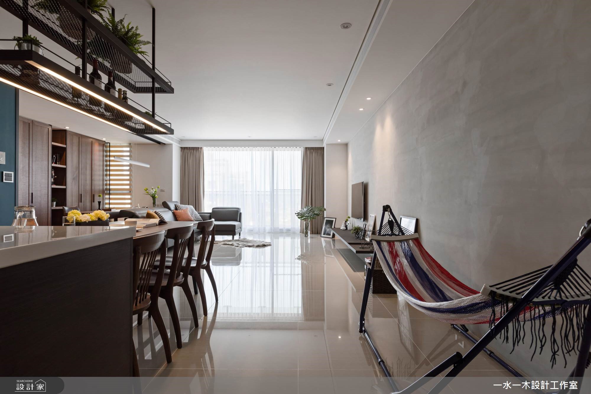 身为工程师的夫妻俩,渴望拥有专属一家人的居住空间。因此,透过简约朴实的灰色壁面拉出整片公领域范围,在木纹与铁件的元素安排,替空间注入人文温度。餐厅黑板墙上创造一面世界地图,夫妻俩标示出到访过的国度,纪录着旅行时的美丽足迹与回忆。【清水模混搭木纹,空间更沉稳】旋开大门走进室内,先是半开放式的厨房映入眼帘,接着是宽阔明亮的公领域。整体空间无刻意装修,大量的留白下,让收纳柜与主体墙设计演绎出屋主的性格,同时创造出渐层的视觉风貌。清水模质感的电视墙面调和出清新纾压的氛围,沙发后方的书房区设置深色木纹柜体,巧妙界定出主次领域,型塑安定清静的阅读环境。中岛与餐桌串连出餐厨空间的核心地带,上方垂挂一座铁件层架强化收纳主卧室以白及灰紫色系配搭,延续公领域的清爽无压。次卧则作为多功能空间,安排钢管支柱,并贴覆镜面,一方面让空间更显放大,另一方面当女屋主跳钢管舞时,还能自我欣赏动人的舞姿。