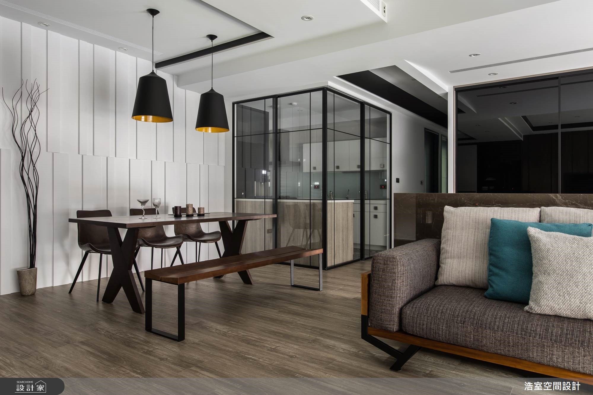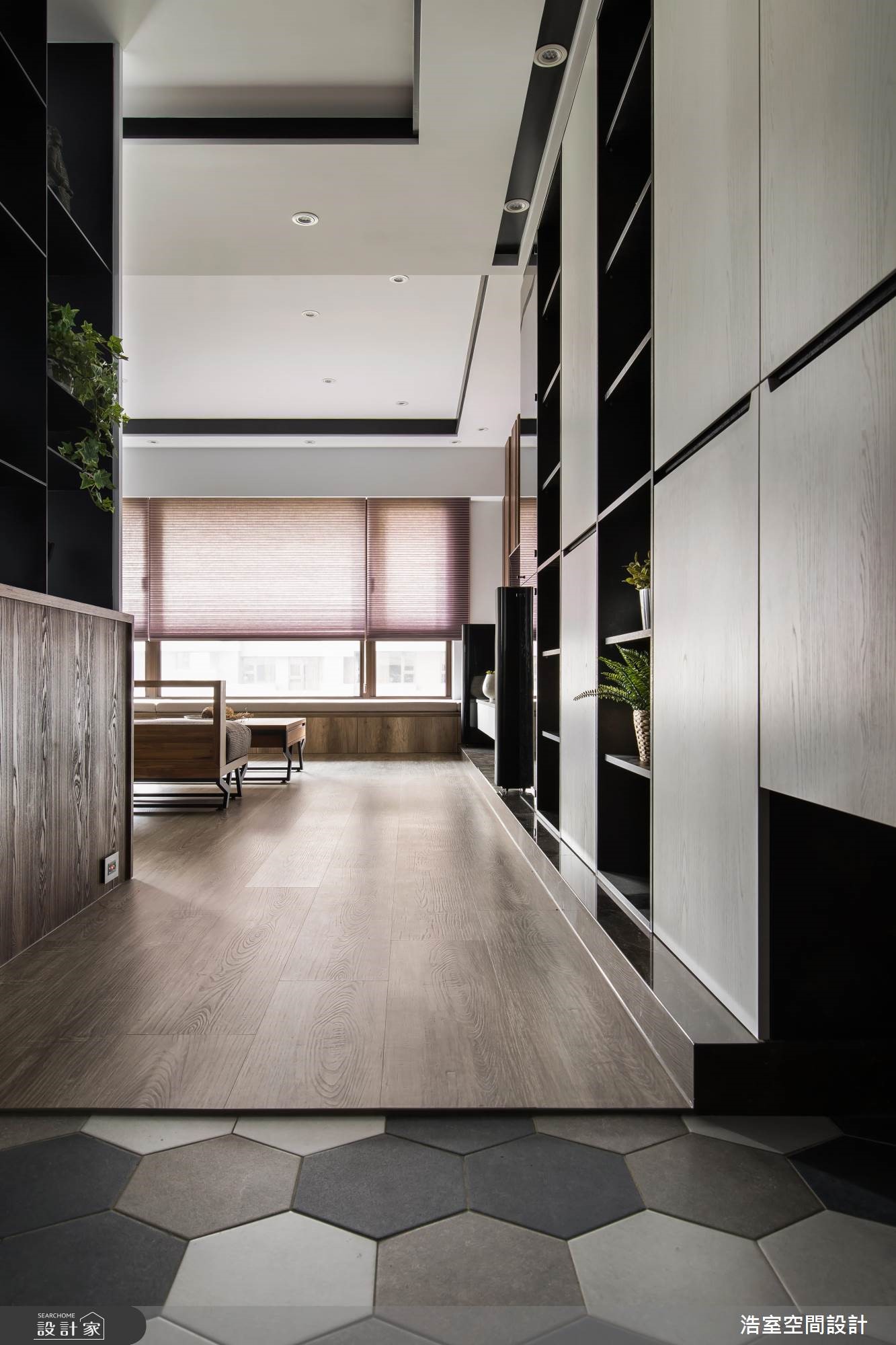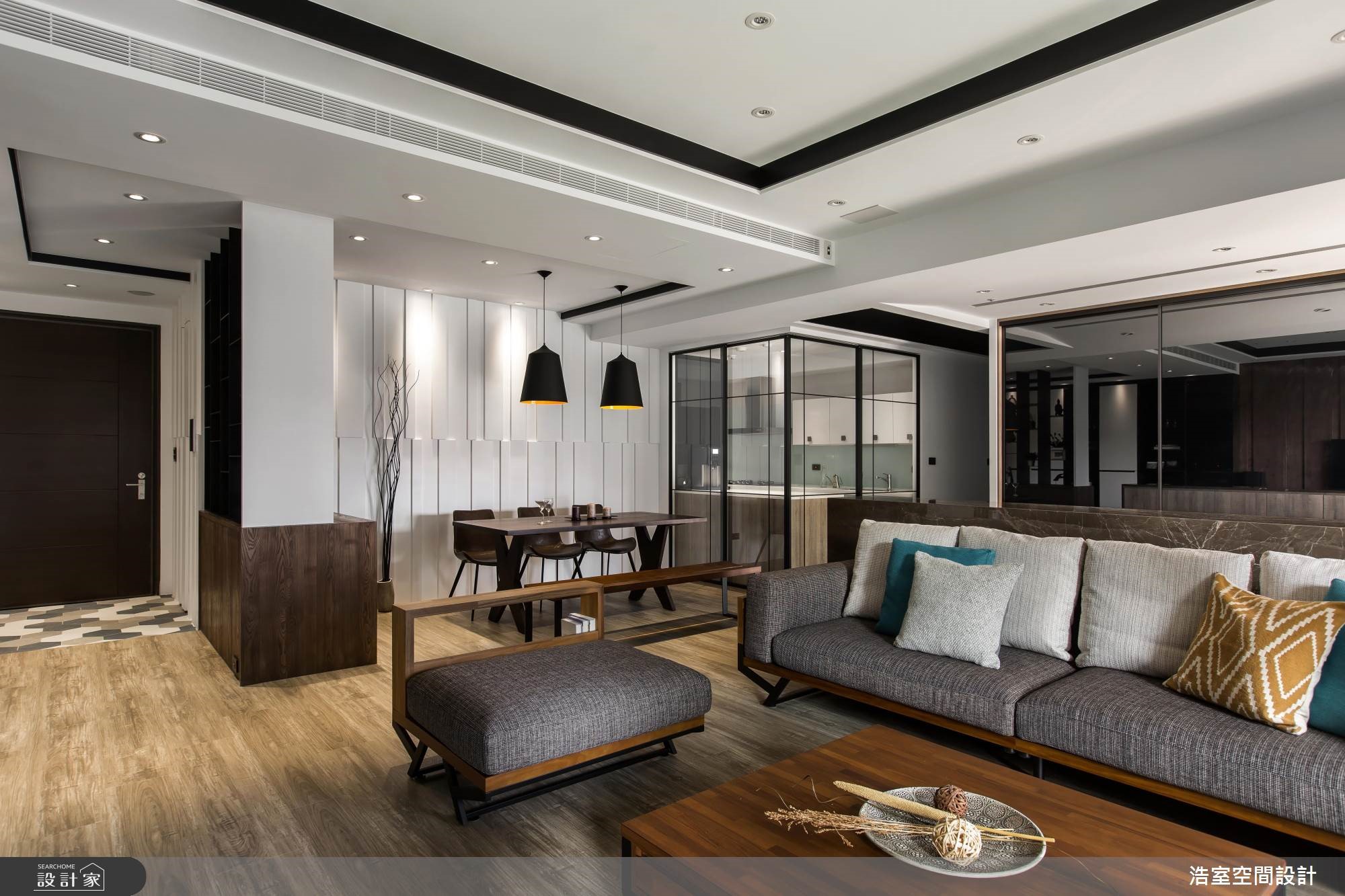 拥有良好采光的264平大宅,设计师刻意降低家具重心,让空间大梁得以弱化,且刻划黑色的腰线,框塑出丰富的层次感,成功拉长空间景深,搭配着收纳机能的合宜分布,以及温润大器的建材使用,深具丰厚人文质感的生活视野。【采光与通透格局,缔造人文氛围】玄关区,于地坪铺陈复古六角砖,形成与室内场域的落差,达成界定里外与落尘功能,并规划穿透式屏风,既美化入口的视觉,也塑造视线与光线的流动;厅区内,为了减少大梁的压迫感,采以黑色腰线修饰天花造型,并刻意将家具高度降低,成功达成抬升空间感的作用。餐厨领域则采开放规划,并巧妙将中岛包进玻璃拉门范围内,延展公共区域的方正性,一旁白色墙面更做出立体进出面造型,不只型塑活泼的墙面表情,也替用餐区添入精致气息。位于客厅后的游戏室,加入黑色烤漆安全玻璃,映衬着采光照映,形成通透的视觉感受,而沙发后刻意保留的留白区块,除了制造空间感之外,更让此区可作出弹性的机能运用。