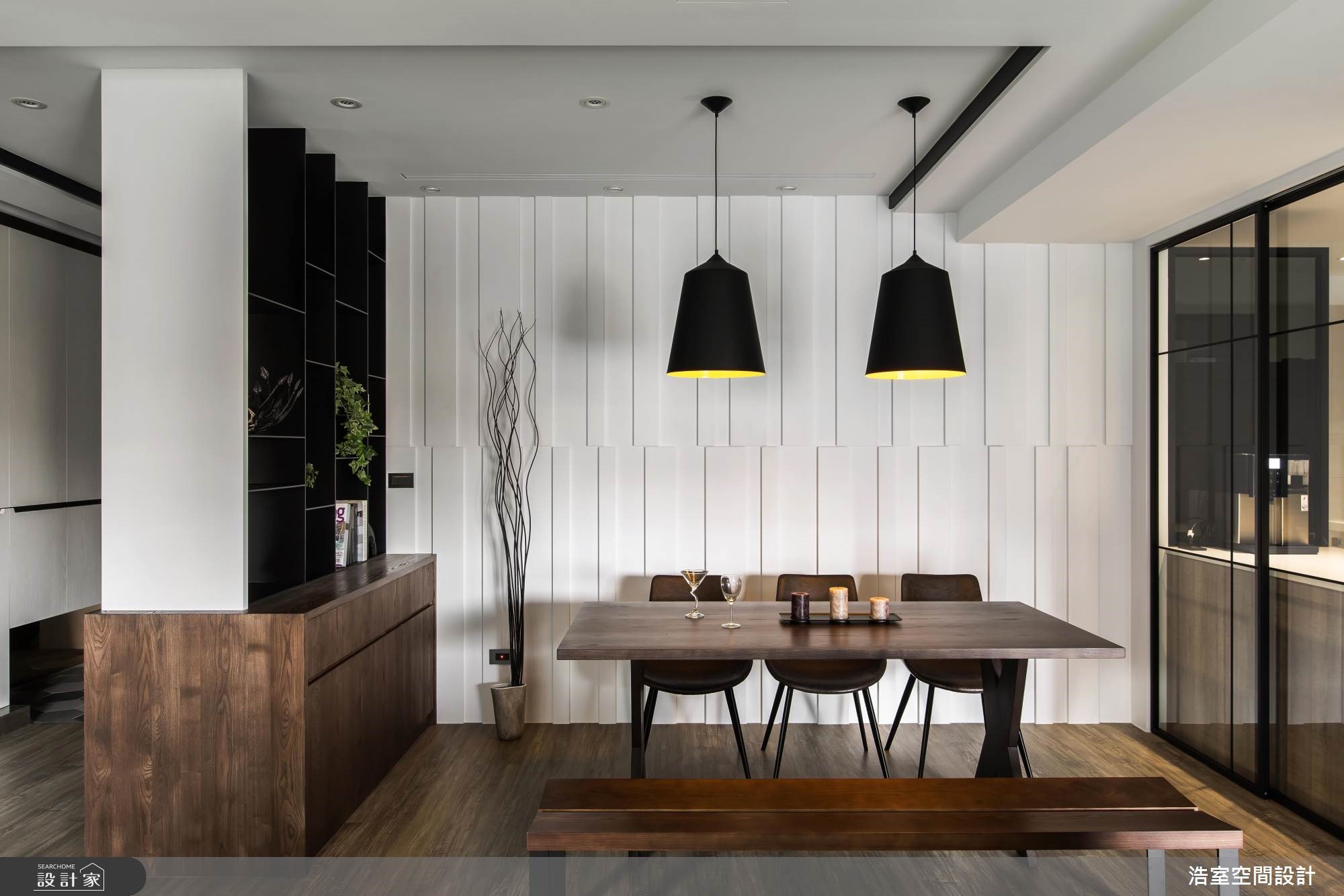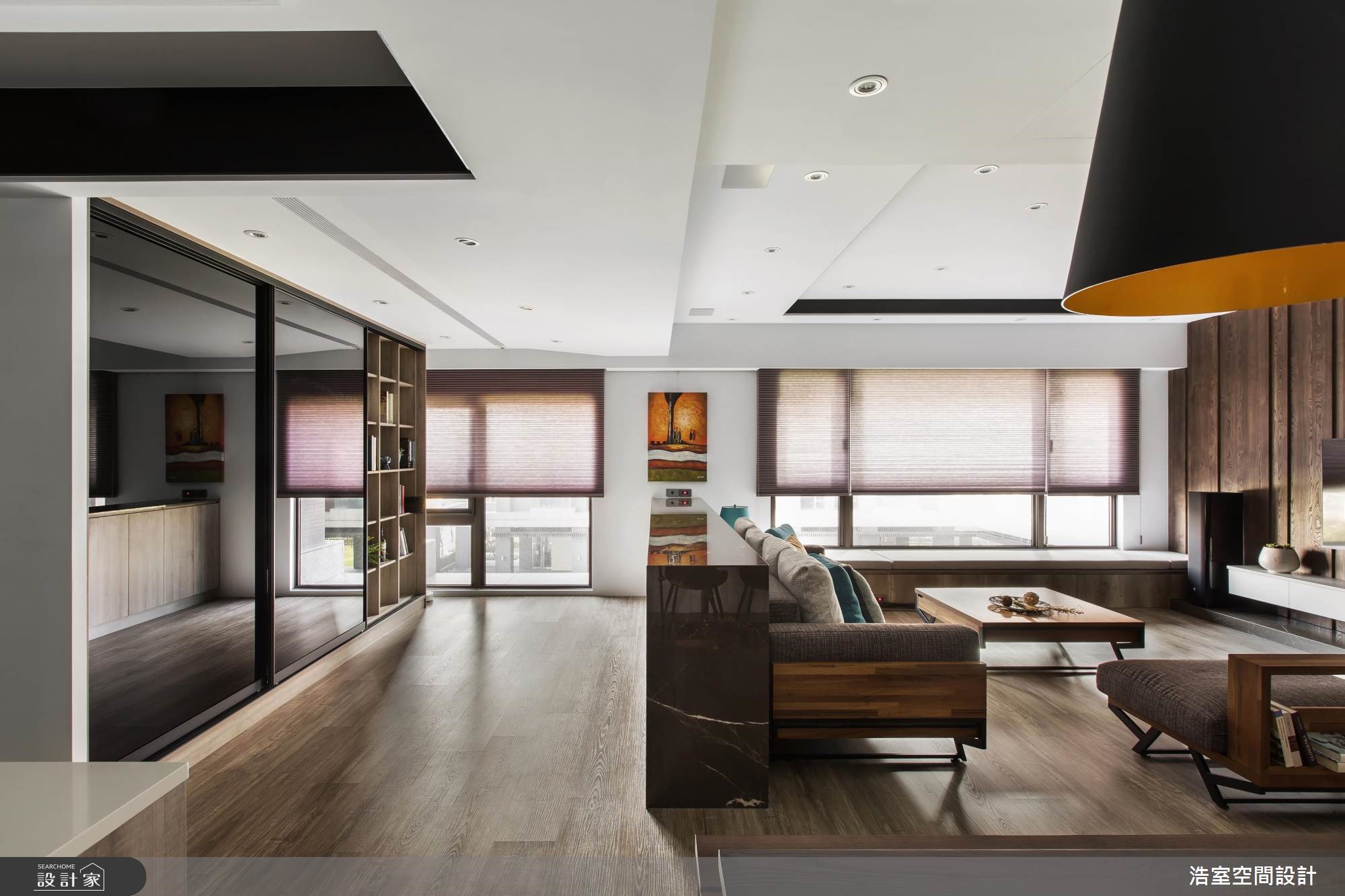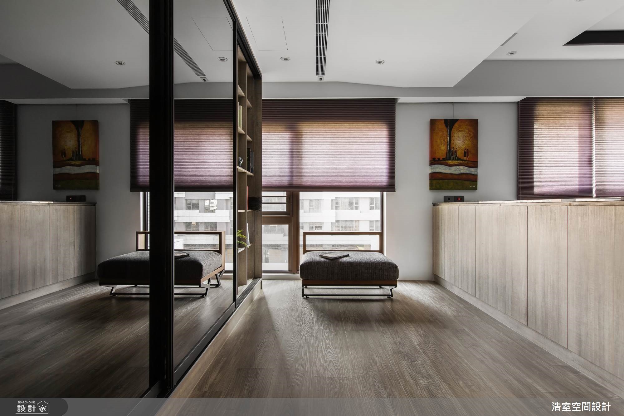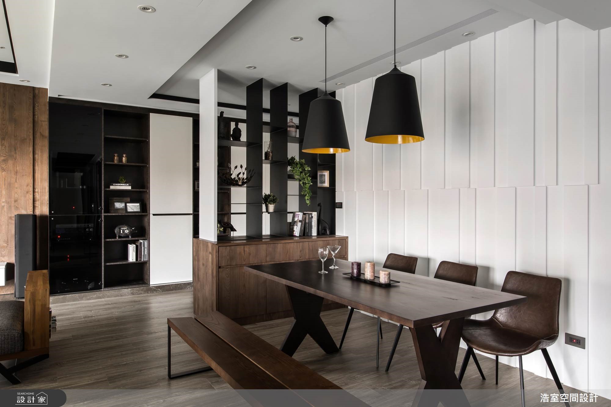 拥有良好采光的264平大宅,设计师刻意降低家具重心,让空间大梁得以弱化,且刻划黑色的腰线,框塑出丰富的层次感,成功拉长空间景深,搭配着收纳机能的合宜分布,以及温润大器的建材使用,深具丰厚人文质感的生活视野。【采光与通透格局,缔造人文氛围】玄关区,于地坪铺陈复古六角砖,形成与室内场域的落差,达成界定里外与落尘功能,并规划穿透式屏风,既美化入口的视觉,也塑造视线与光线的流动;厅区内,为了减少大梁的压迫感,采以黑色腰线修饰天花造型,并刻意将家具高度降低,成功达成抬升空间感的作用。餐厨领域则采开放规划,并巧妙将中岛包进玻璃拉门范围内,延展公共区域的方正性,一旁白色墙面更做出立体进出面造型,不只型塑活泼的墙面表情,也替用餐区添入精致气息。位于客厅后的游戏室,加入黑色烤漆安全玻璃,映衬着采光照映,形成通透的视觉感受,而沙发后刻意保留的留白区块,除了制造空间感之外,更让此区可作出弹性的机能运用。