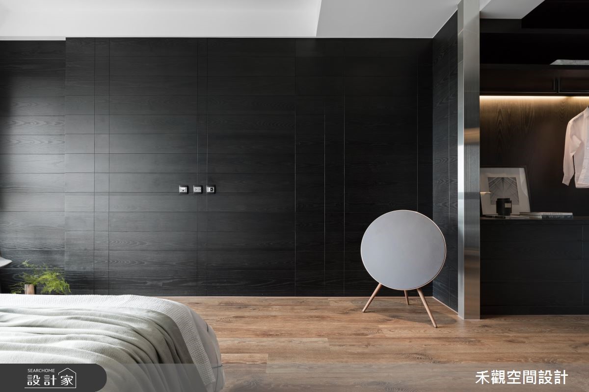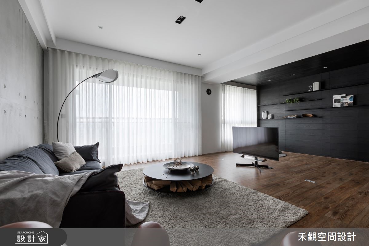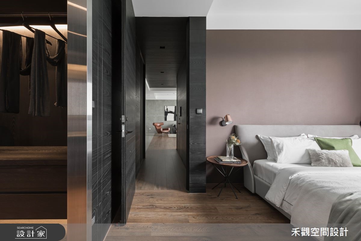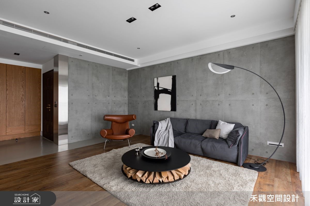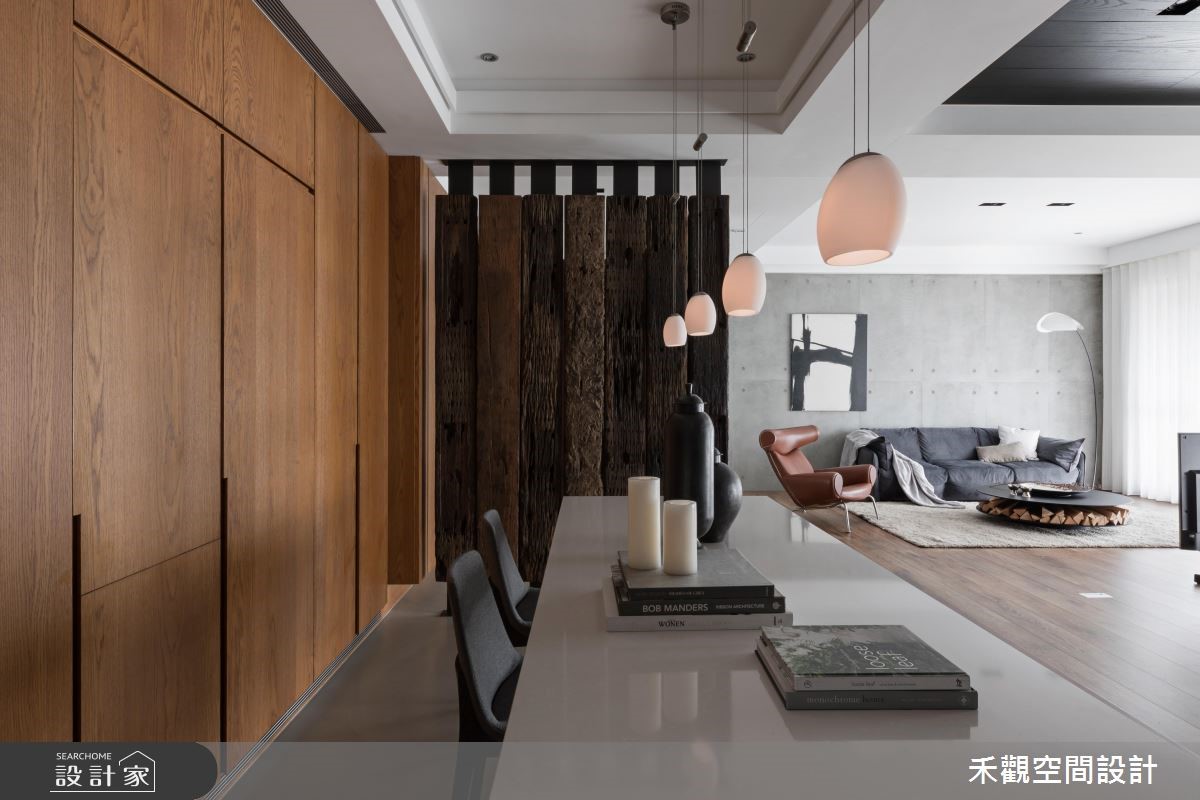 因应屋主需求所做的设计,就是好设计。因此设计师迎合屋主需求,舍弃过多隔断的拘束感,打造简约和工业风的质感。整体空间以开放式设计为主,并加入大量木元素和灰质色系清水模,让生活充满人文品味。【屏除隔断,打造开阔视觉】客厅与餐厅部分采用开放式设计,轻盈的金属架构取代了厚重的实体电视墙,后方则可做为休闲区或书房使用。开阔通透的设计,扩大空间视觉。以清水模作为沙发背墙,加上大量的自然木纹、深邃的木皮染色,在简约现代和工业风的朴质自然之间,达到了微妙的平衡。餐厅运用无接缝水泥地板划分领域,清洁上也较为便利。大面积的人造石餐桌下方加强收纳设计,成为屋主的专属置酒区。卧室延伸了客厅的沉稳木色系,并额外配置了独立的更衣区,入口处加入金属门框,注入了现代时尚质感。