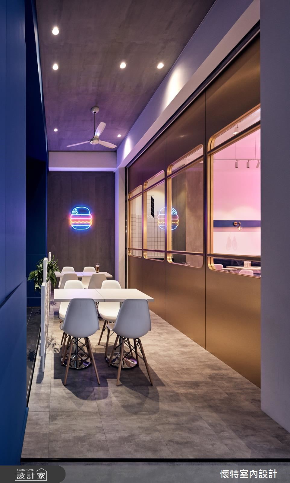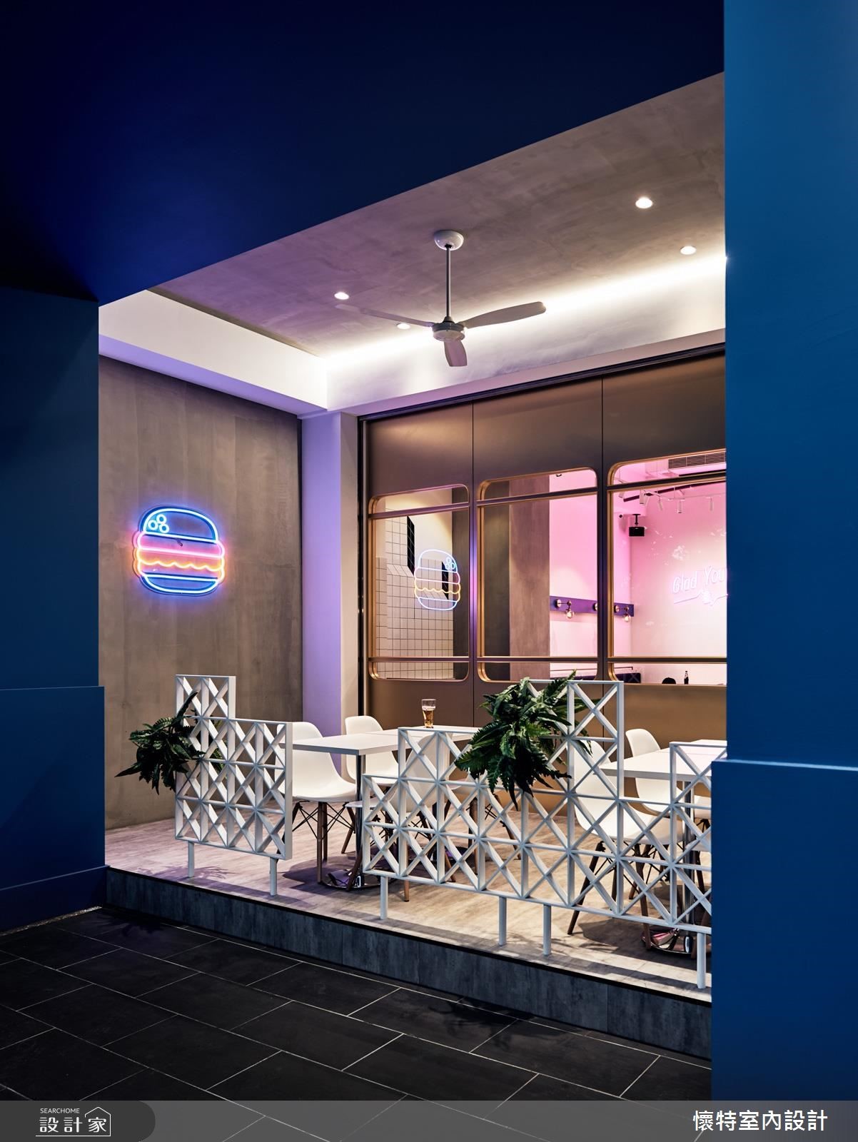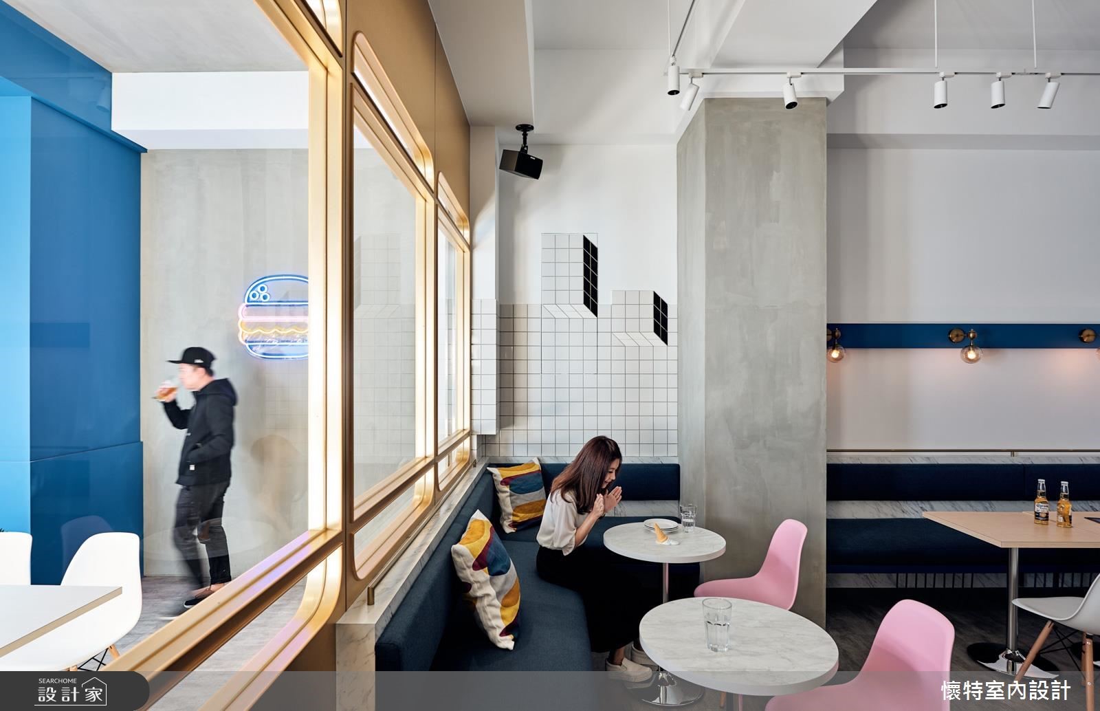 谁说享受美式快餐,一定是在粗犷的美式空间里豪迈吃着汉堡?怀特设计颠覆既定印象,以柔美的粉、蓝色系融入美式汉堡的空间里,激起女性们潜在的少女情怀,成为拍照上传、打卡的热门景点。 【白、粉、金配色,掳获少女心】门口规划一处户外用餐区,木纹壁面挂上一个巨型的荧光汉堡,面向马路区的栏杆以几何造型围塑出座位区,内侧以车厢窗框为设计,让人有走进纽约地铁月台的临场感受。踏入室内,从入口到吧台地面皆铺陈蓝色的环氧树脂晕染,彷佛冰淇淋融化的感受。室内以白色为基调,天花板无刻意装修,轨道灯串连空间,木纹塑胶地板为地面植入温暖氛围,湛蓝色系的座位贯穿整体空间,粉白相间的座椅擦亮视觉新意。壁面透过灯泡装饰,移植工业风精髓;粉红、香槟金的色泽轻轻点缀,更调合出甜美、漾彩的视觉变化。吧台区则藉由利落感的石材打造,诠释出质感的现代风尚,香槟金色泽的管子造型贯穿其中,与窗框颜色相互呼应,其流畅的曲线更带来画龙点睛之效。