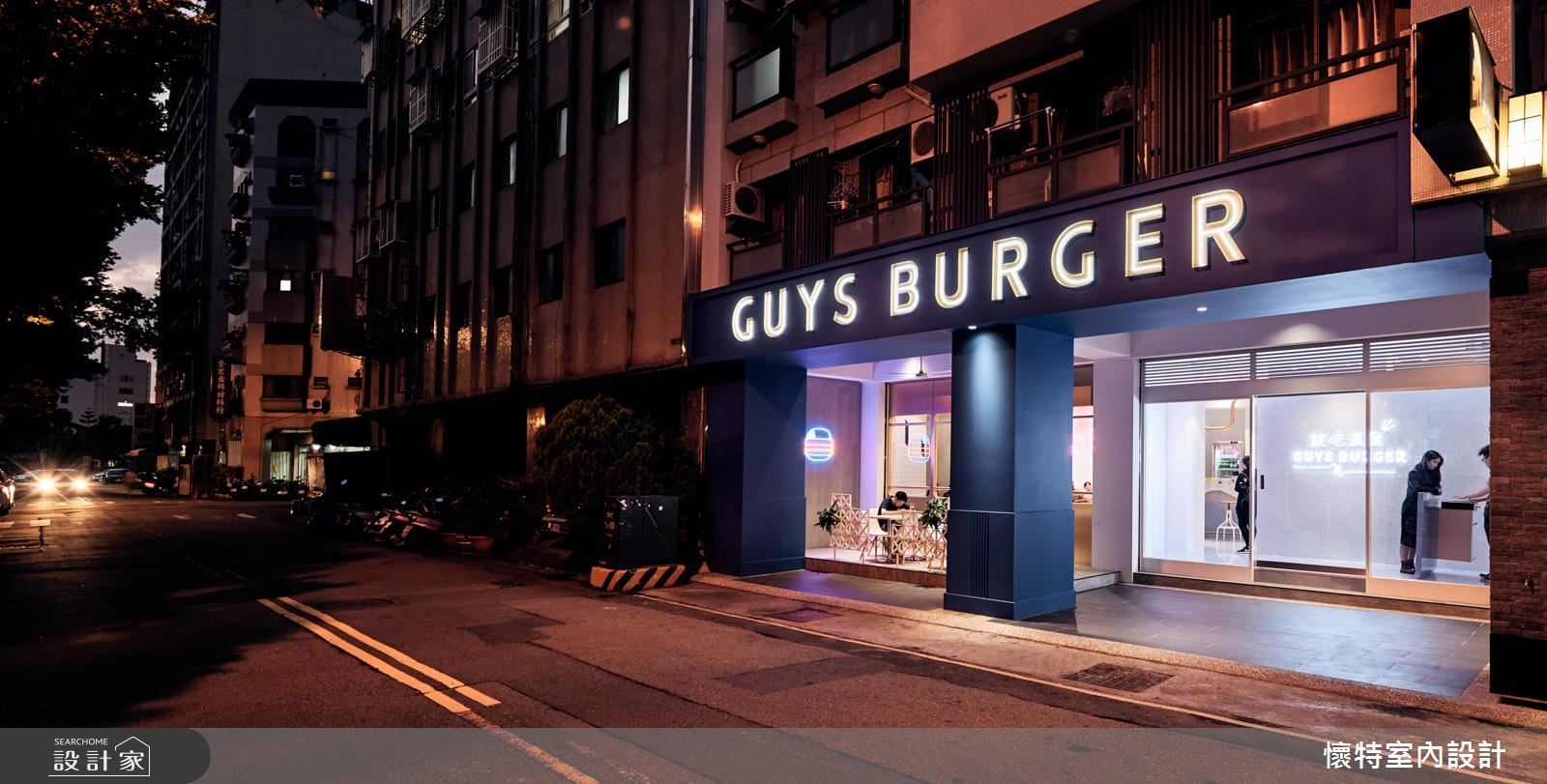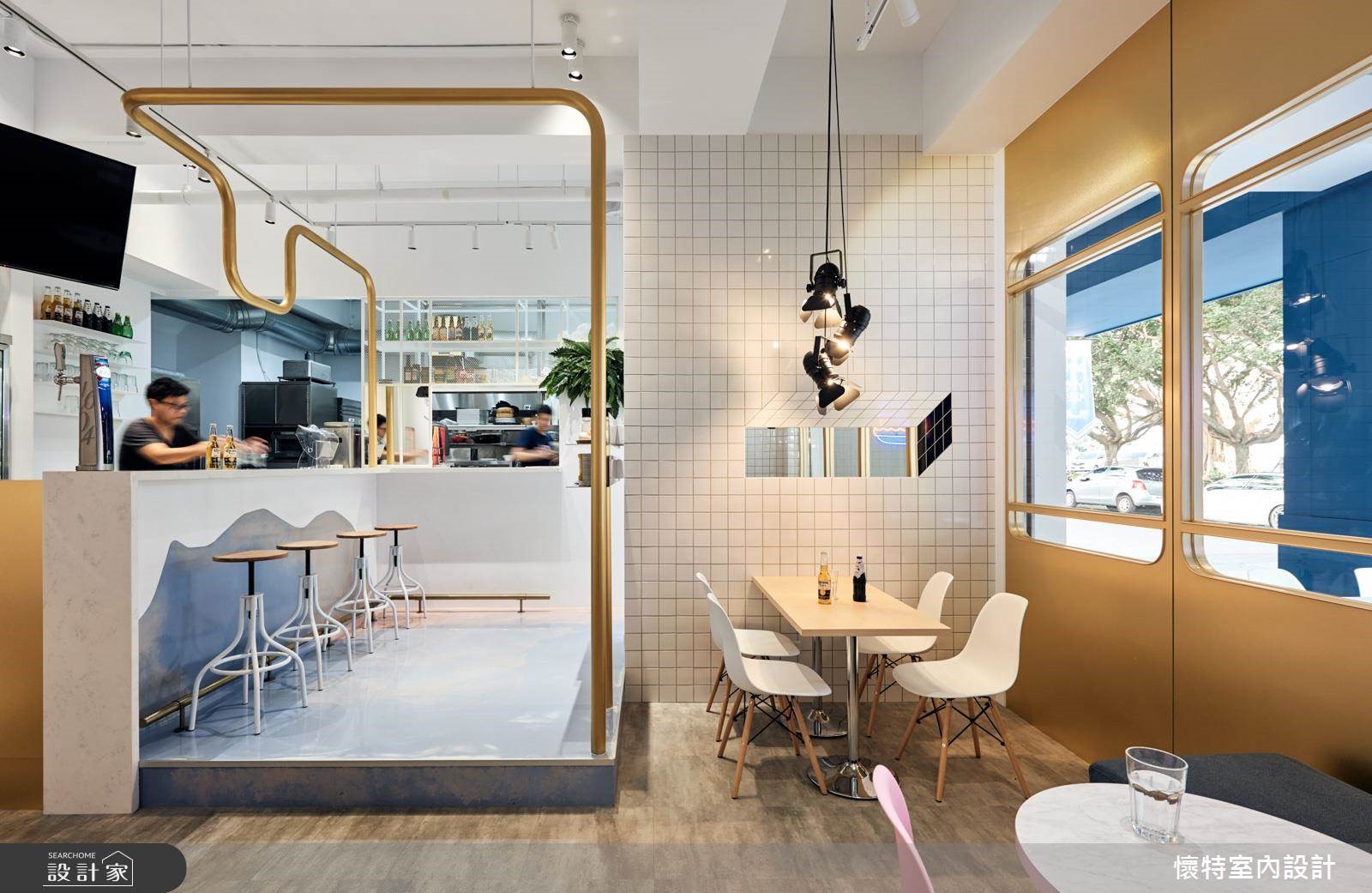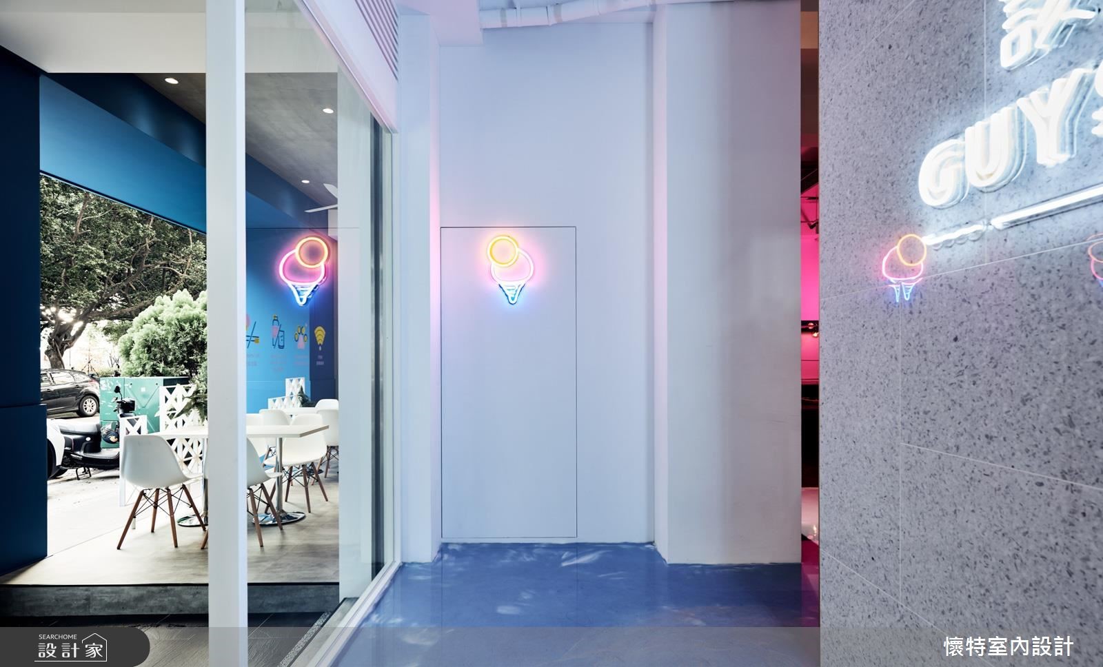 谁说享受美式快餐,一定是在粗犷的美式空间里豪迈吃着汉堡?怀特设计颠覆既定印象,以柔美的粉、蓝色系融入美式汉堡的空间里,激起女性们潜在的少女情怀,成为拍照上传、打卡的热门景点。 【白、粉、金配色,掳获少女心】门口规划一处户外用餐区,木纹壁面挂上一个巨型的荧光汉堡,面向马路区的栏杆以几何造型围塑出座位区,内侧以车厢窗框为设计,让人有走进纽约地铁月台的临场感受。踏入室内,从入口到吧台地面皆铺陈蓝色的环氧树脂晕染,彷佛冰淇淋融化的感受。室内以白色为基调,天花板无刻意装修,轨道灯串连空间,木纹塑胶地板为地面植入温暖氛围,湛蓝色系的座位贯穿整体空间,粉白相间的座椅擦亮视觉新意。壁面透过灯泡装饰,移植工业风精髓;粉红、香槟金的色泽轻轻点缀,更调合出甜美、漾彩的视觉变化。吧台区则藉由利落感的石材打造,诠释出质感的现代风尚,香槟金色泽的管子造型贯穿其中,与窗框颜色相互呼应,其流畅的曲线更带来画龙点睛之效。
