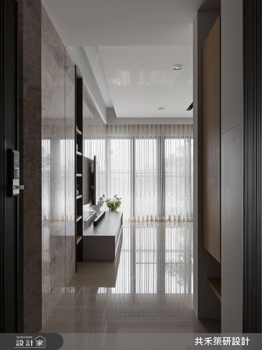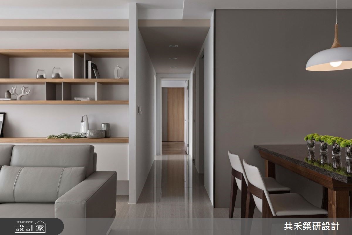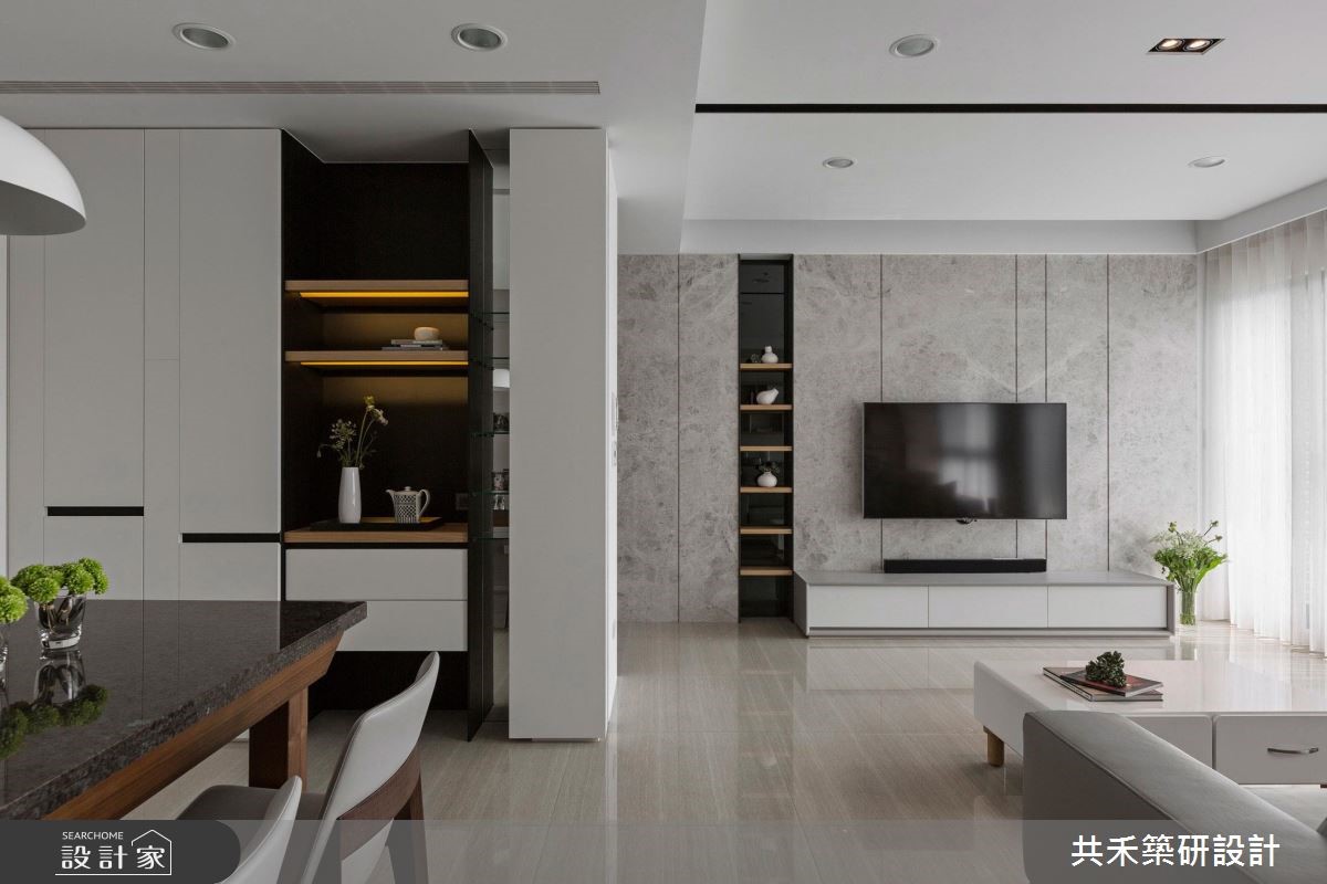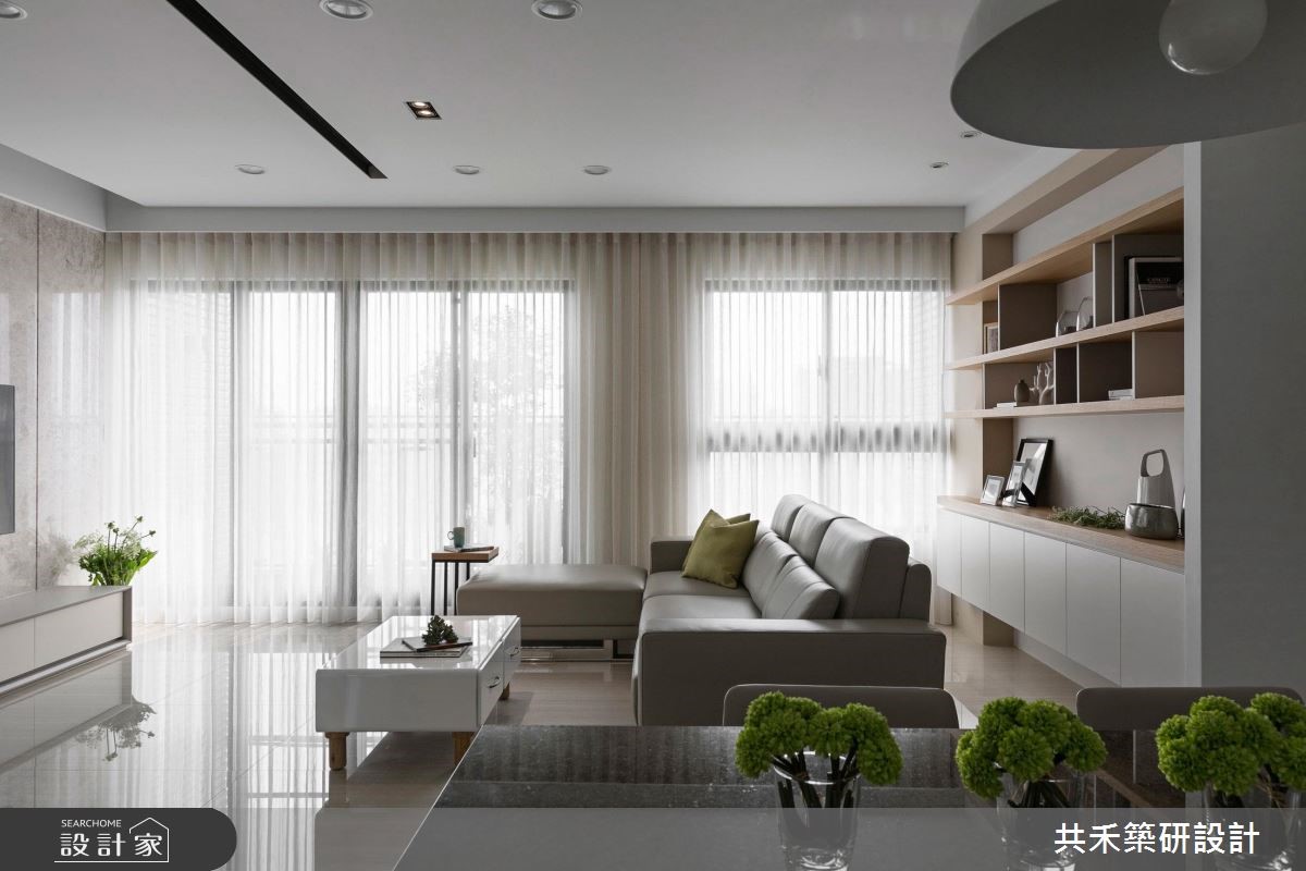 这户空间以轻透纯净的视觉为主调,随着自然光洒落在石材铺陈的地面,仿佛被刷洗般闪耀着透亮光泽;留白的壁面以温润木纹妆点,倾注暖调的人文氛围,而细致的沟缝切割空间立面,交织出动人的日常节奏。【注入纯白与绿意,调和恬静魅力】旋开大门走进室内,立即感受宽敞舒心的空间气度,大理石材铺陈地面且成为电视主墙,一展俐落干净的现代质感,加上隔板切割而成的展示空间,与后方的开放书柜相互呼应,并赋予壁面生动的表情。客厅摆设L型灰色的皮革沙发,形塑开放、流动的行走动线;以大量白色铺陈的空间里,透过绿意植栽、花艺设计的摆设与安排,将自然的生命力引入室内,调和出淡雅恬静的家屋魅力,能够住在这样的家,真的好惬意!