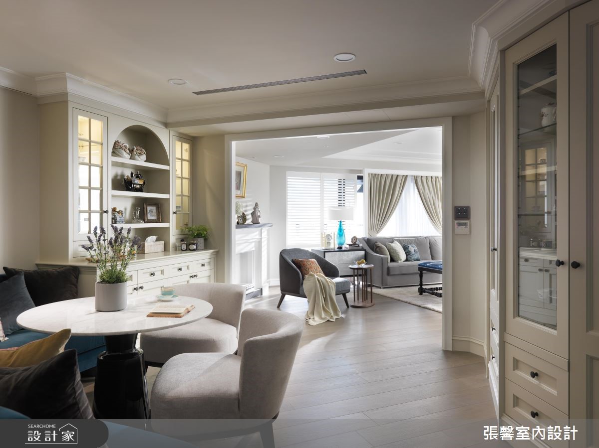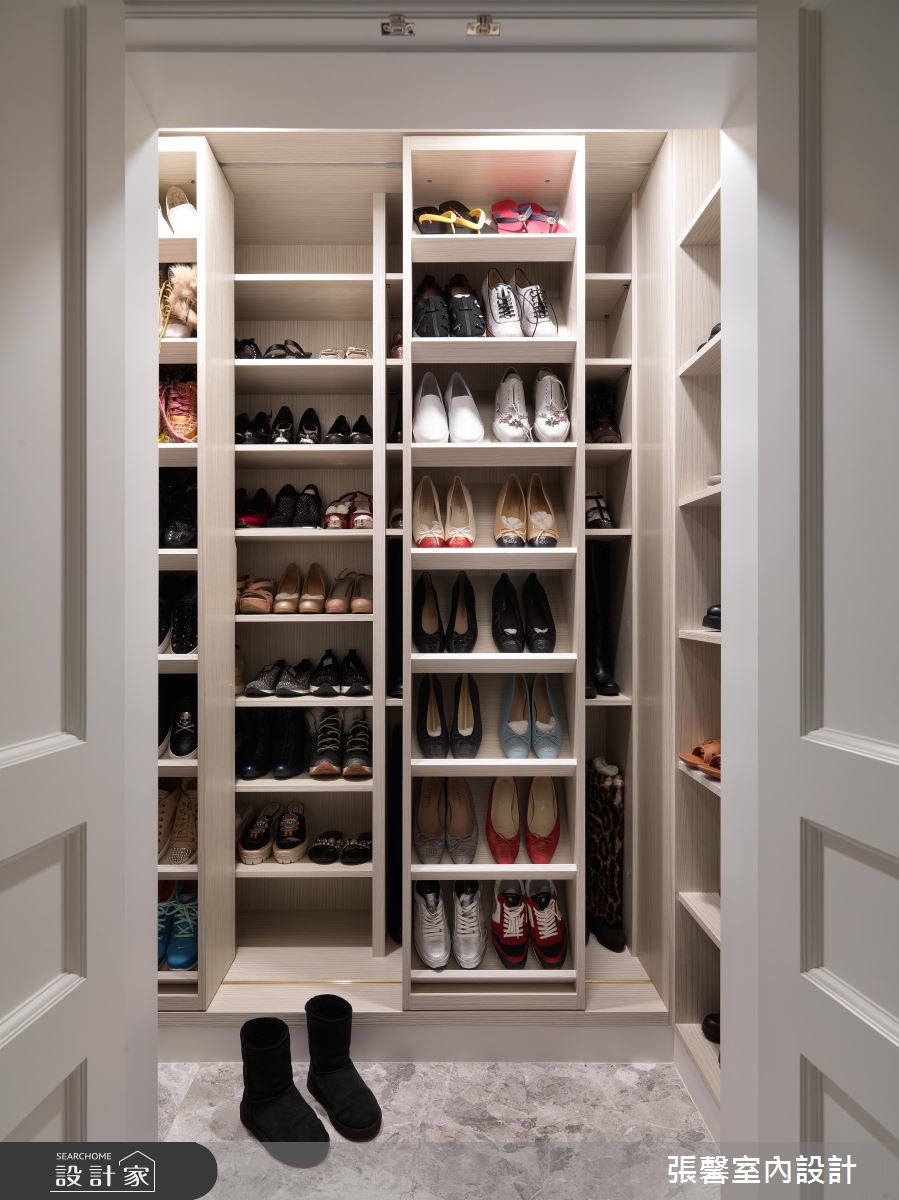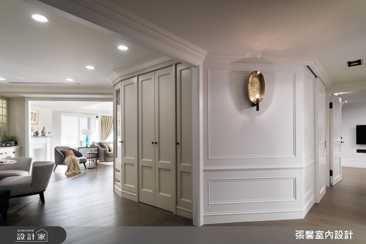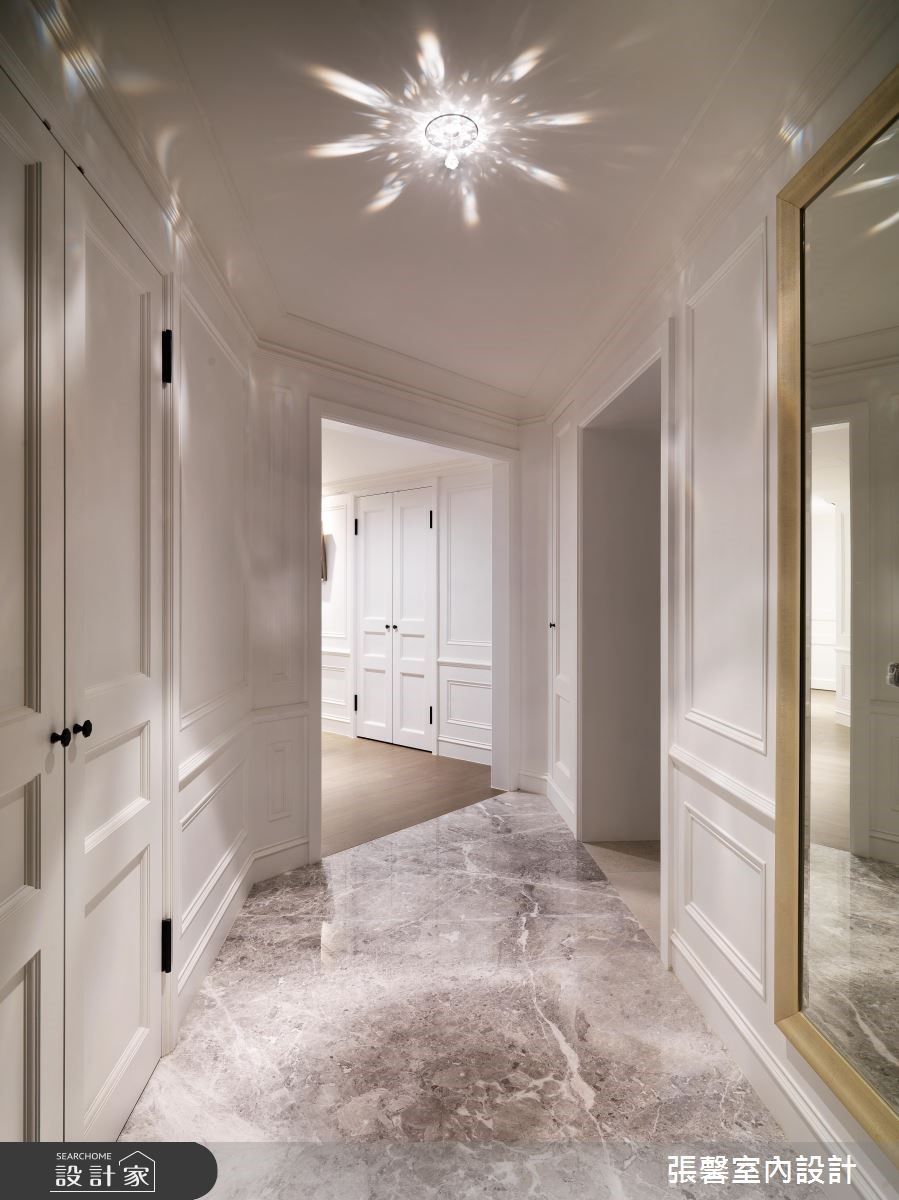 208平米欧式古典风家居,设计师完美切割钻石型格局,因应着多边型的畸零地,打造强大的收纳机能,无论是玄关的过道,或特为屋主规划的更衣室、精品鞋柜,都完美体现了女人们的梦幻想望,快跟着小编一起来看看吧!设计师透过收框方式串联每个场域,运用白色线板的延伸,导引渐进式的生活动线,并架构出不同的场域範围,且在轻盈浅色基地中,穿插着隐约的色彩差异,如淡灰、白色、米白等,在扩容感之馀,也带出细緻的层次变化,同时引用「582设计概念」,留有5成的设计轮廓,再搭配家具、软件等8分布置,最后将2分空白留给居住者,成就最具舒适感、呼吸度的视野,同时突破既有的设计思维,将沙发背墙与窗景结合,佐以浅灰的窗帘陪衬,加深整体的明亮氛围;餐厨则依循既有架构,沿着墙面配置 L 型吧檯,底下更加入强大的置物空间,在有限条件下创造最大的使用效益!小编的最爱无论是收纳可观的鞋柜,或量身打造的更衣间,甚至每个转角令人惊喜的展示风景,从公领域到私领域,设计师皆充分瓦解格局逆境,让不规则住宅发挥空间最大价值,重新坐拥动人新风貌!