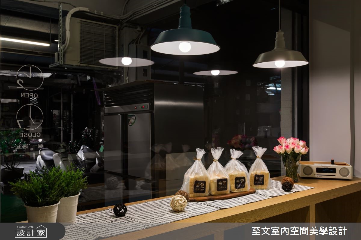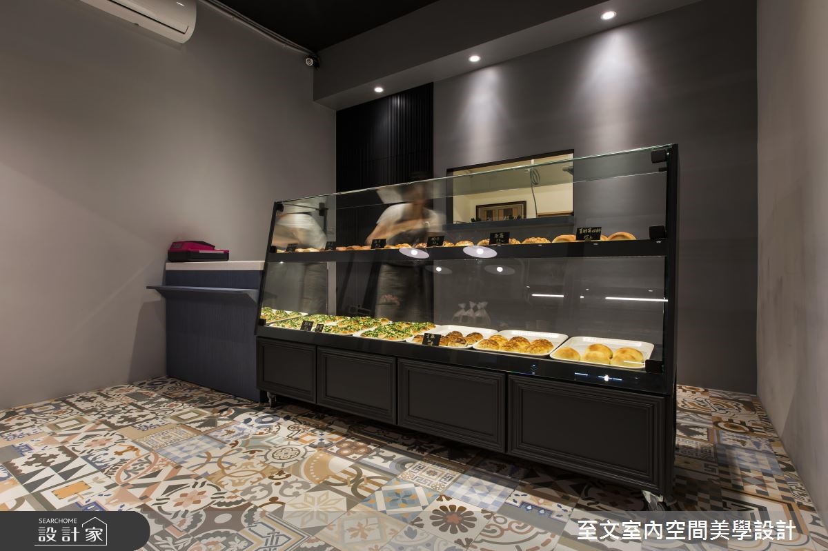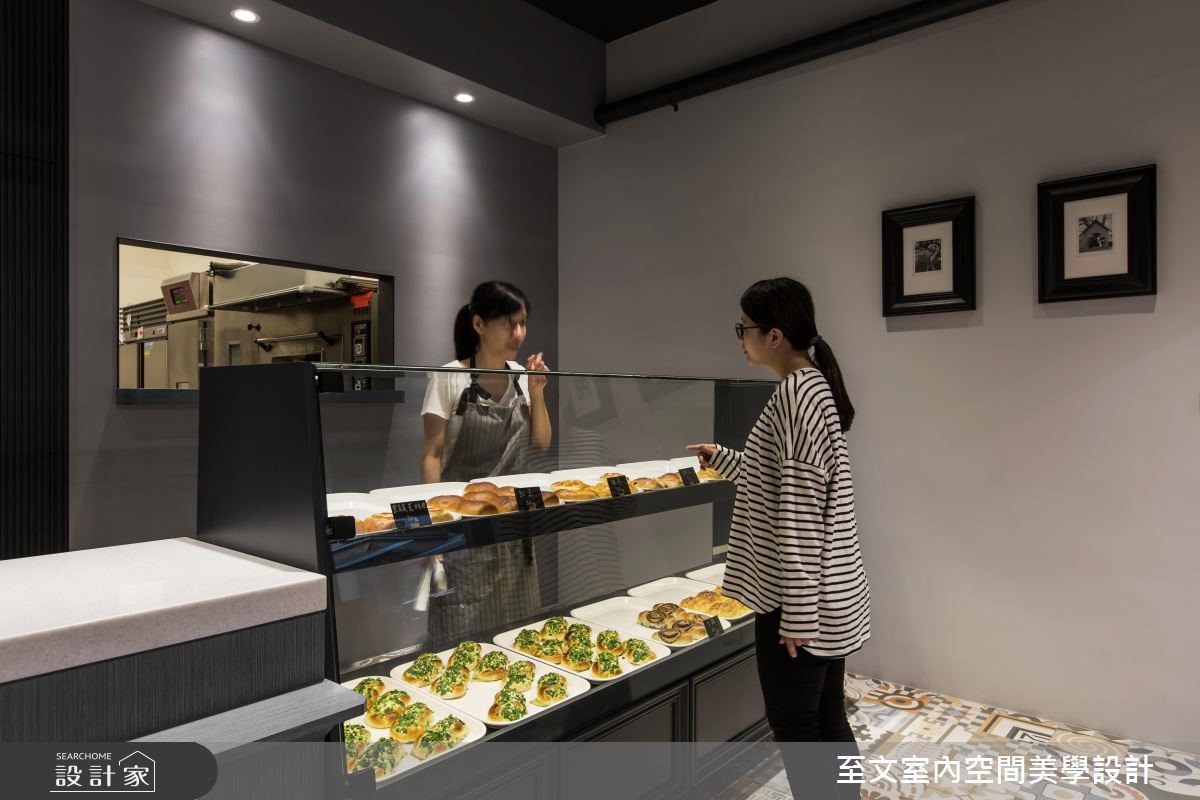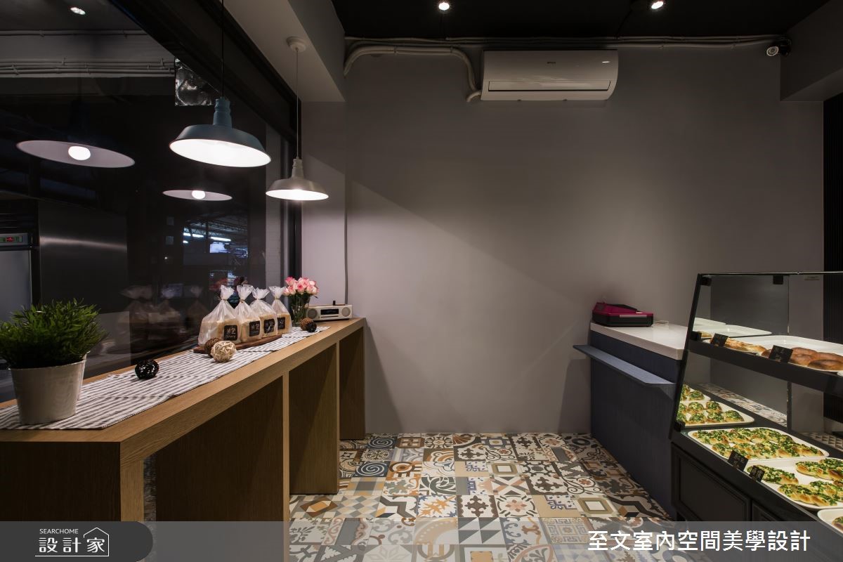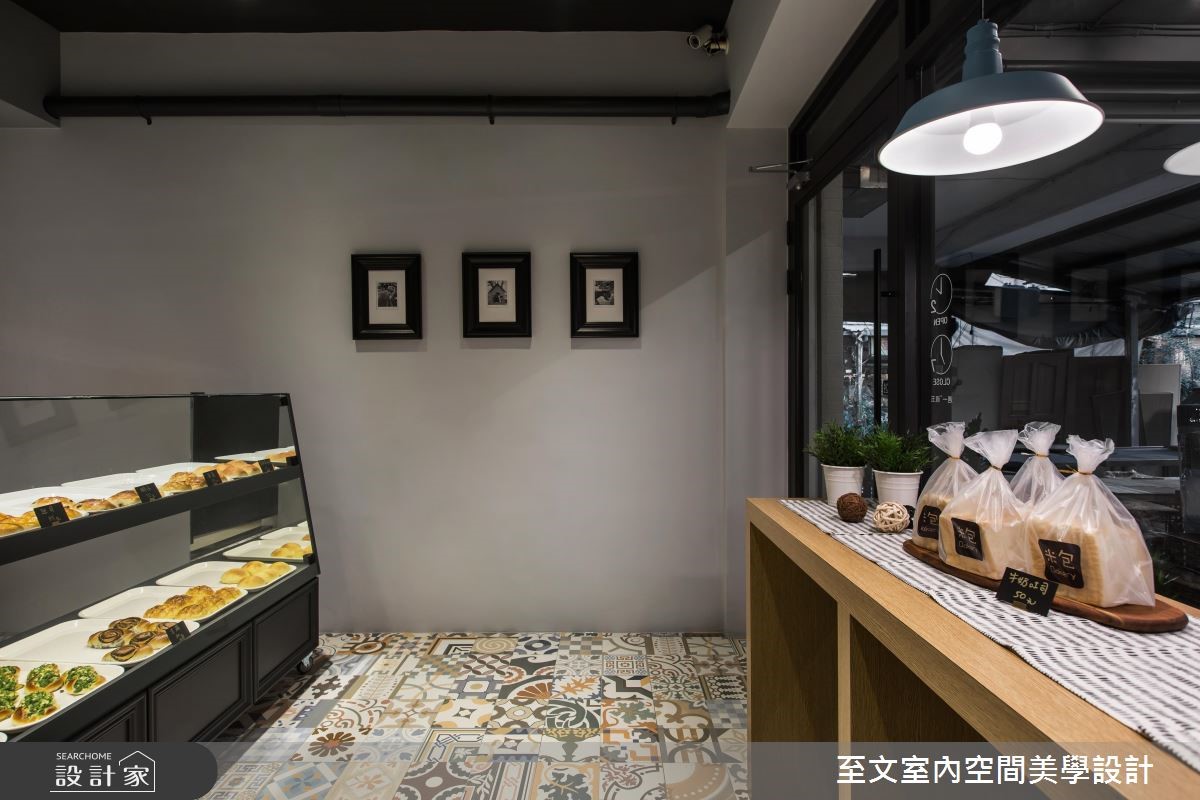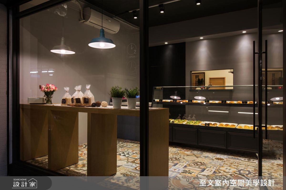 屋龄超过 40 年的老鐘錶行,将改造为年轻夫妻创业的梦想起点,也期待给家人更好的生活环境,他们委託至文室内设计团队将长型老房改造为麵包店,并在后方保留长辈的居住空间,让创业梦想和亲情可以一併实现在 27 平米空间里。以 Loft风格为主轴,设计师将长型老屋分为三个区块,前段作为麵包的销售展示和烘焙区,属于家人的居住空间则安排于中、后段,透过玻璃隔断的穿透性,为室内带进明亮而充沛的日光,也让麵包店看起来更加清爽、整洁,一旁则以深灰色调的墙面色彩,则赋予了文艺气息,搭配两盏吊灯、画作的点缀,显现温暖人文的质感。地面满满铺上绚丽的花砖,成为令人惊豔的视觉焦点,并在麵包、蛋糕的展示柜细节处加入线板设计,添注欧美风情。小编的最爱夫妻两人的创业麵包店,在设计师的巧思设计下,结合家居生活和店面机能,打造出小巧而温馨,也很有品味的麵包烘焙坊。