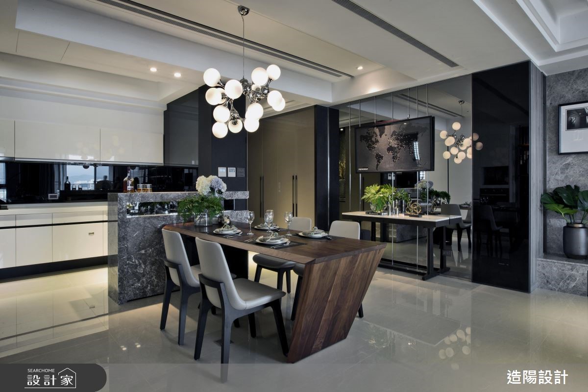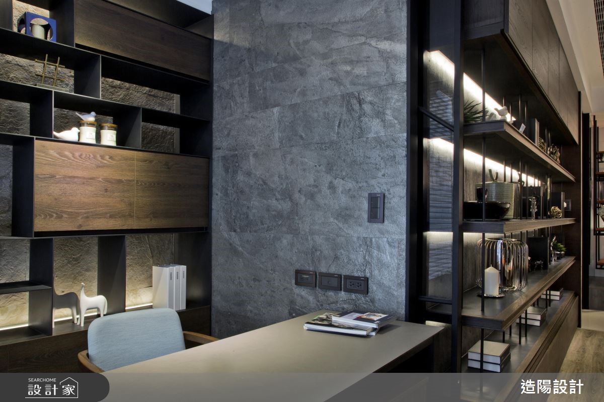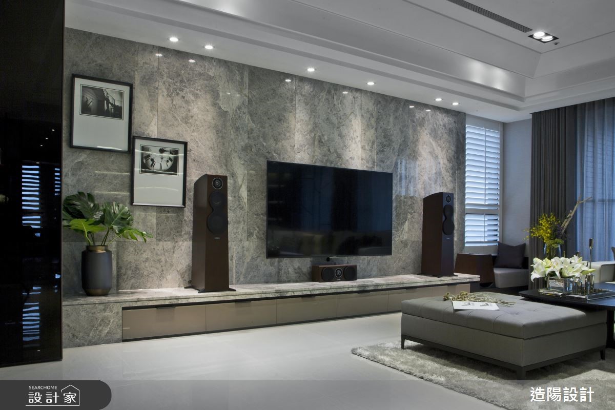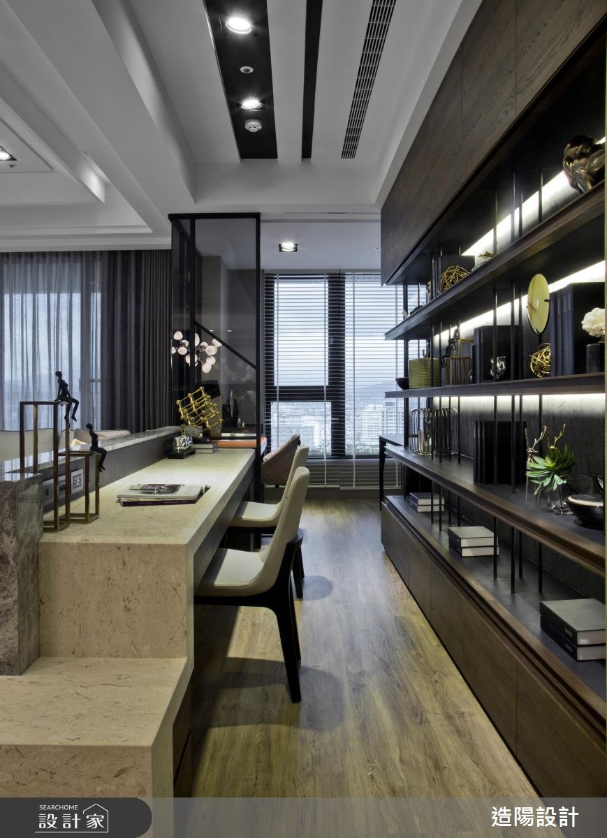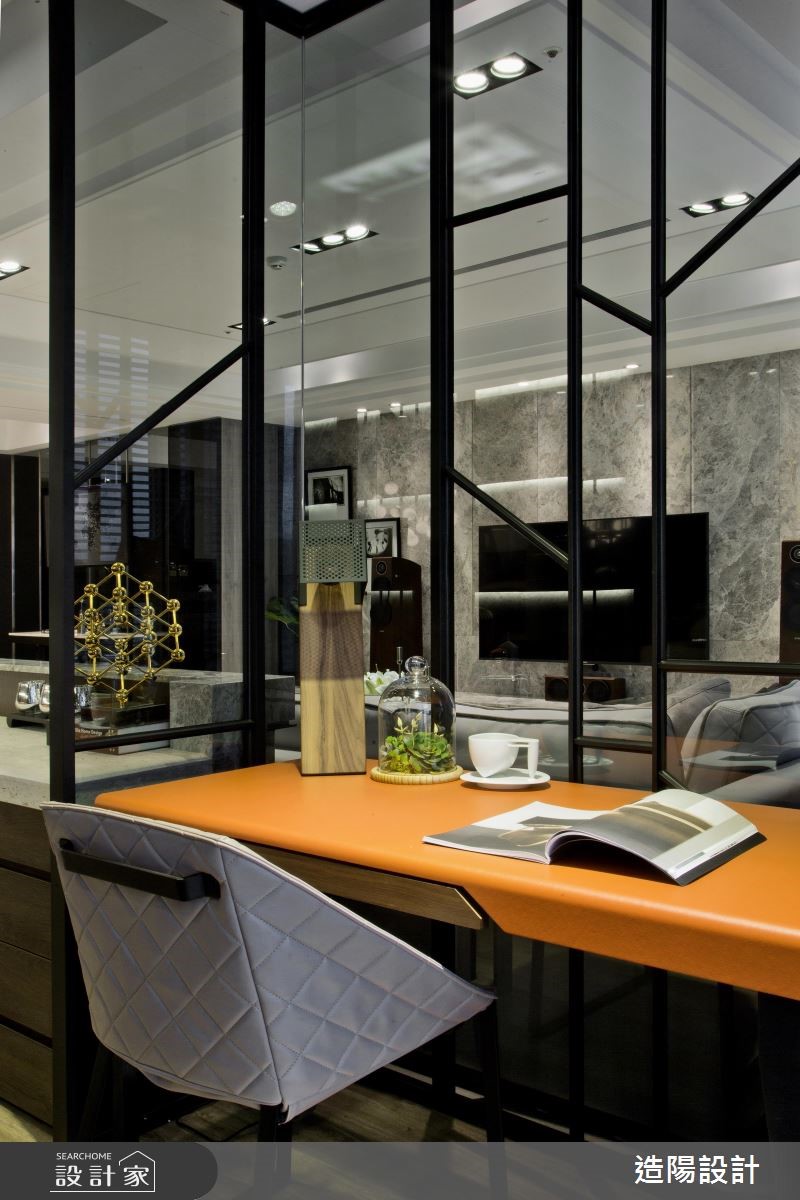 254平米的现代风大宅,设计师以现代人文风格定调整体,并融入十字轴线动线规划,既不失开放性,也将每个领域明确定义,同时给予沉静的灰、黑色调安排,适度佐以软件、灯光等细节,萃取现代时尚的调性,快跟着小编一起来看看吧!设计师首先调整格局,将一间居室更改为开放式阅读书房,再拆解厨房隔断,让吧檯、客厅、餐厅相互串联分布于公领域,形塑开放宽阔的视野,打造出绝佳的款待聚会空间;同时引用大器的大理石材,建构伫立于玄关、客厅之间的电视墙,透过精準明确的线条构划,呈现俐落大方的性格,让立面宛如一道画屏,成为步入居家的一幅气派端景;书房,则规划整排收纳柜,兼具展示收藏功能,使书房不但是阅读空间,也达成居宅内的装饰意义;而安排在同一轴线的男、女主人共有小型书房,则藉由特殊造型铁框玻璃推拉门区分领域,搭配拓彩岩的运用,营造时尚人文氛围!小编的最爱 设计师精準掌握屋主喜好,透过细腻线条、精湛工法的演绎,使种类多样的异材质可完美共融于同一空间内,展演出家的恢弘气度!