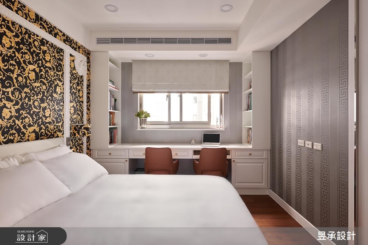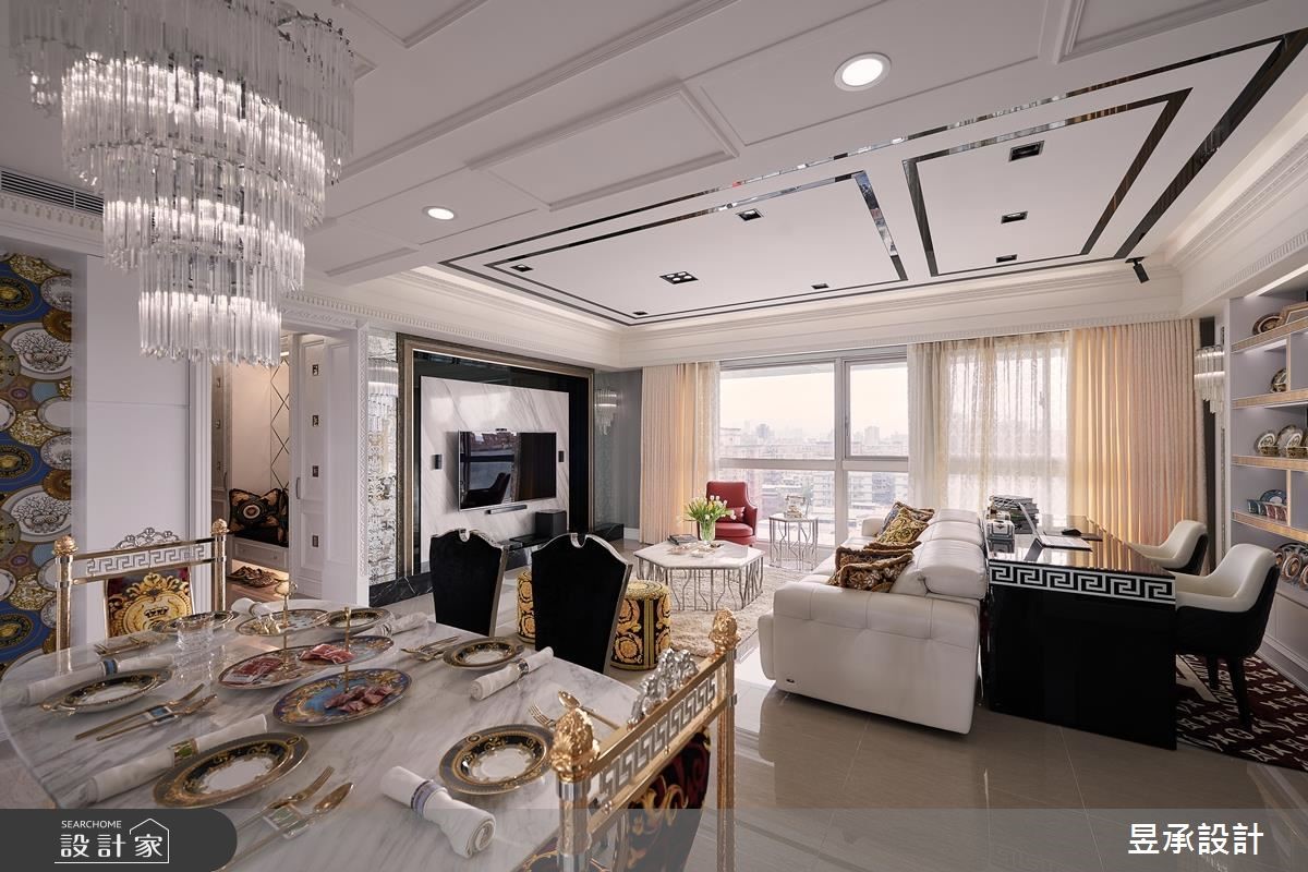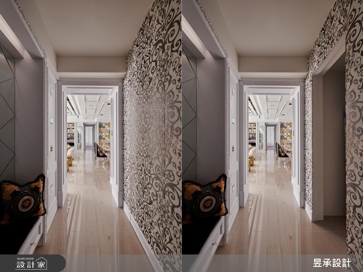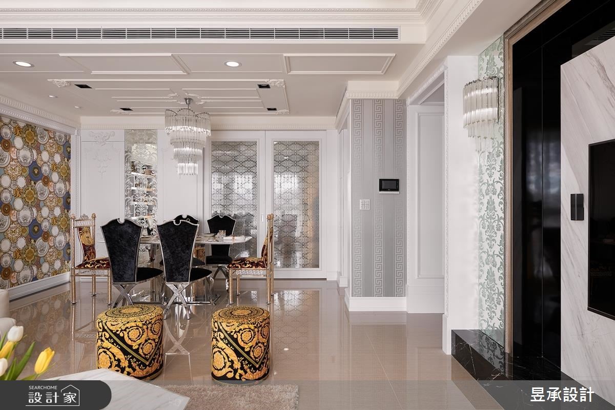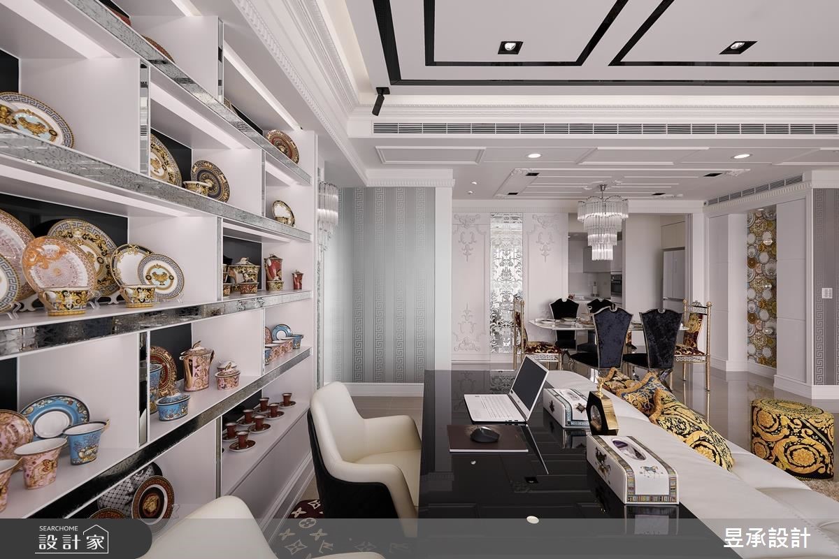 198平方米的新古典大宅,以屋主最喜爱的新古典风格为基调,搭配着做工精致的家具、材质、工艺细节,呈现出大器而华丽的居家样貌,并透过适度的留白,在生活和装饰表现之间取得和谐的平衡。从玄关处开始便开启了华丽序幕,玄关墙面以菱形镜面切割,再搭配线板外框佐饰、黑绒绷布坐垫等,营造大器奢华的质感。公共空间包涵客厅、书房、餐厅等功能性,采开放式设计的空间更在天花板加入黑镜及层叠的线板装饰,使空间更显挑高;电视墙则运用黑镜、天然石材的异材质混搭,外部加入双层画框线板和古典雕花明镜,在沉稳大器中,也融入了细腻精致的新古典内涵。餐厅与餐厨之前,藉由玻璃双开推拉门,达到开放、隐私的弹性转换,也达到了延伸空间感的视觉效果,餐厅加设水晶吊灯营造奢华餐饮氛围,一旁的古典雕花壁板及镜面设计,则巧妙地隐藏了盥洗区的入口。主卧室运用线板、银蓝色墙纸打造出低调优雅的氛围,床头处并隐藏收纳空间,创造实用效益;小孩房则以精致亮丽的墙纸塑造视觉焦点,搭配书桌、收纳等配置,丰富私领域空间的机能性。小编的最爱书房色彩以简约的黑白灰色彩为主轴,提升空间的时尚感,后方并安排有开放式的展示柜体,使屋主的精心收藏成为生活中的华丽风景。