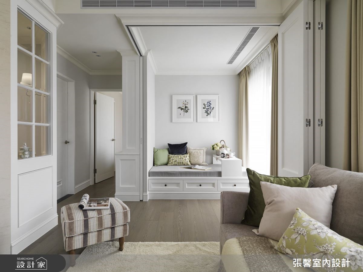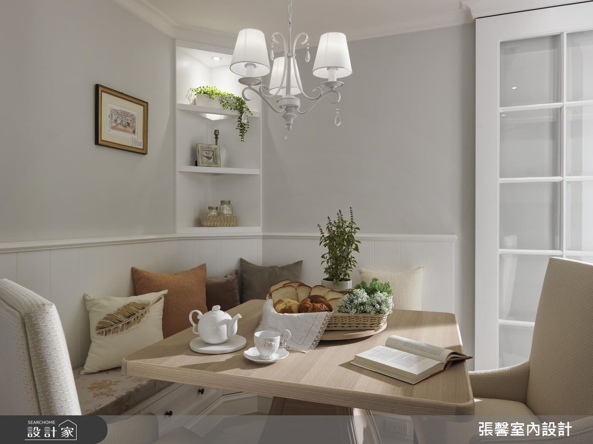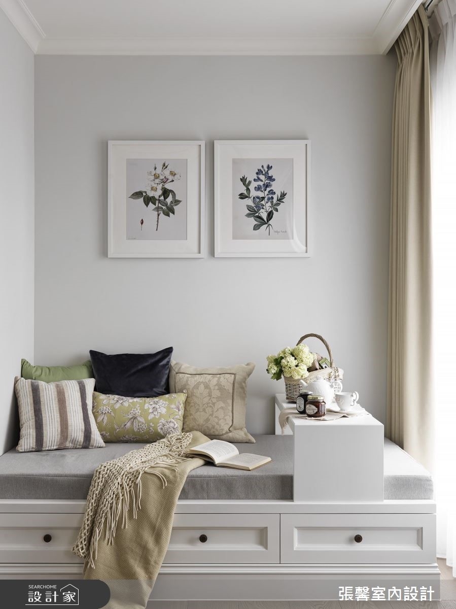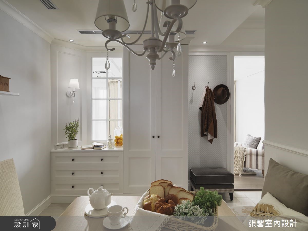 经常往返国内外的屋主夫妻俩,渴望回到台湾后能入住在度家般的空间里,成为一处惬意的退休宅。因此,藉由恬静的美式风格,大量的白色壁面,加上浅色调木纹的家具软件搭配,形塑无压、惬意的放鬆家屋。户外暖阳映照在网纱窗帘的质量上,筛出轻柔、自然的唯美光晕,洒落在木纹肌理的茶几、粉色调与线条造型的沙发上,以及渐层色感的花瓶、跳色抱枕上,酝酿一股閒适的度假氛围;玄关处以浅色木地板铺陈,与室内的深色木纹界定分明,微型的领域里纳入穿鞋椅、衣架,鞋柜表面佐入穿衣镜机能,丰盈家的实用特性;乾净、简约的线板造型遊走在客厅里,轻柔配色的家具、家饰,花艺与画作的局部妆点,交织出宛如浪漫春日的生动景緻;狭长的公领域里,循着既定的大樑结构,创造L型移动的推拉门装置,不仅美化结构柱,更打造一块可享受午茶或优閒时光的飘窗区;餐厅以灰白色调为基底,温润的木纹餐桌,搭配典雅的花纹坐垫,调和温馨的用餐氛围,仅透过一小道玻璃窗隔,窥见客厅的动向,洁白的窗景营造,挹注优雅、动人的家屋想像。