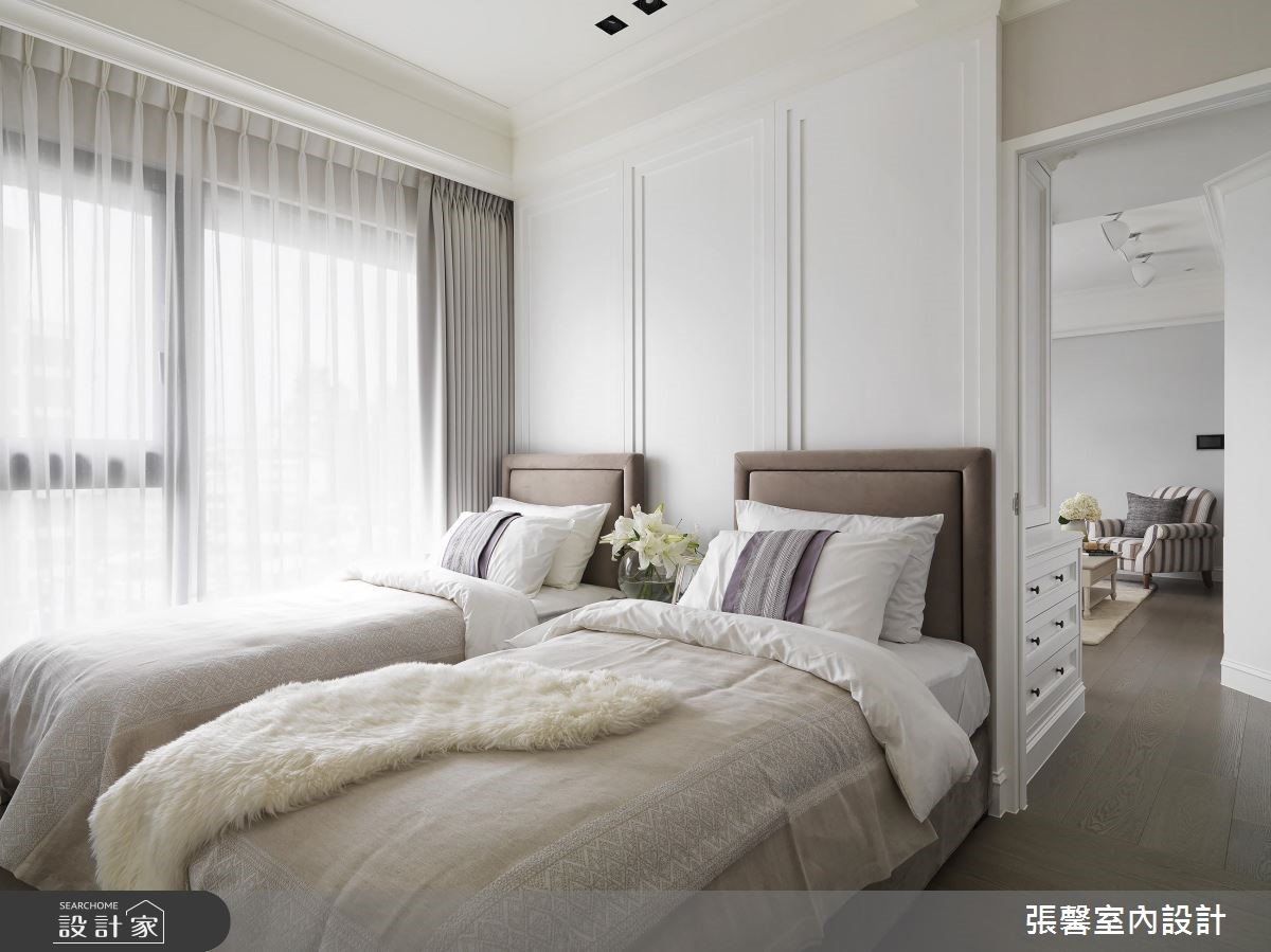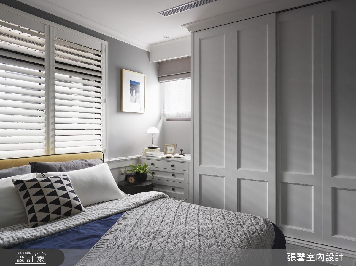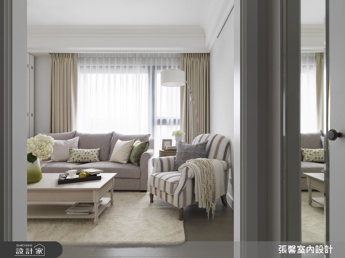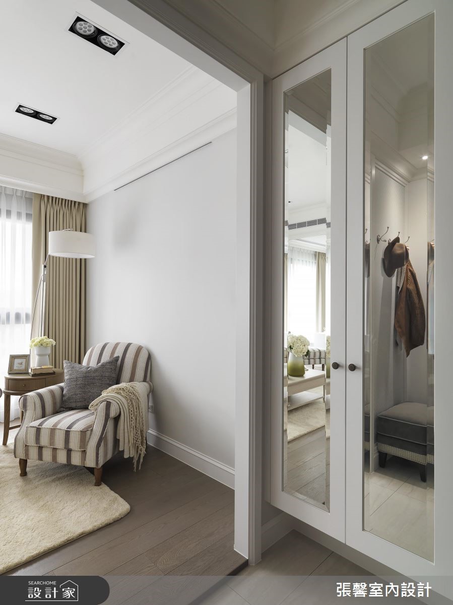 经常往返国内外的屋主夫妻俩,渴望回到台湾后能入住在度家般的空间里,成为一处惬意的退休宅。因此,藉由恬静的美式风格,大量的白色壁面,加上浅色调木纹的家具软件搭配,形塑无压、惬意的放鬆家屋。户外暖阳映照在网纱窗帘的质量上,筛出轻柔、自然的唯美光晕,洒落在木纹肌理的茶几、粉色调与线条造型的沙发上,以及渐层色感的花瓶、跳色抱枕上,酝酿一股閒适的度假氛围;玄关处以浅色木地板铺陈,与室内的深色木纹界定分明,微型的领域里纳入穿鞋椅、衣架,鞋柜表面佐入穿衣镜机能,丰盈家的实用特性;乾净、简约的线板造型遊走在客厅里,轻柔配色的家具、家饰,花艺与画作的局部妆点,交织出宛如浪漫春日的生动景緻;狭长的公领域里,循着既定的大樑结构,创造L型移动的推拉门装置,不仅美化结构柱,更打造一块可享受午茶或优閒时光的飘窗区;餐厅以灰白色调为基底,温润的木纹餐桌,搭配典雅的花纹坐垫,调和温馨的用餐氛围,仅透过一小道玻璃窗隔,窥见客厅的动向,洁白的窗景营造,挹注优雅、动人的家屋想像。