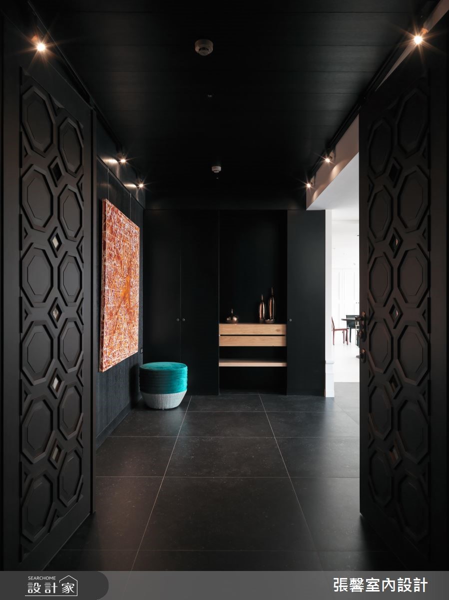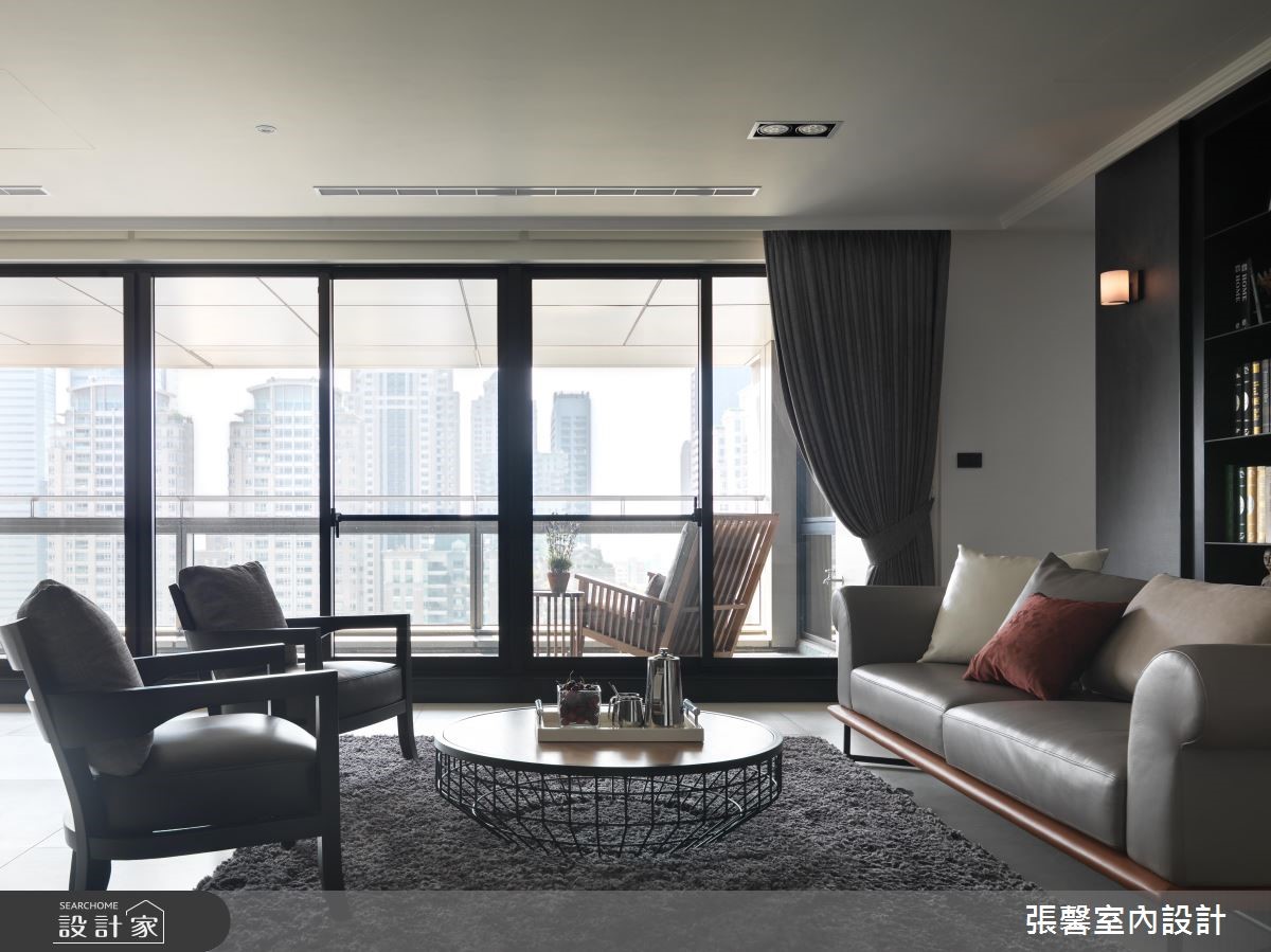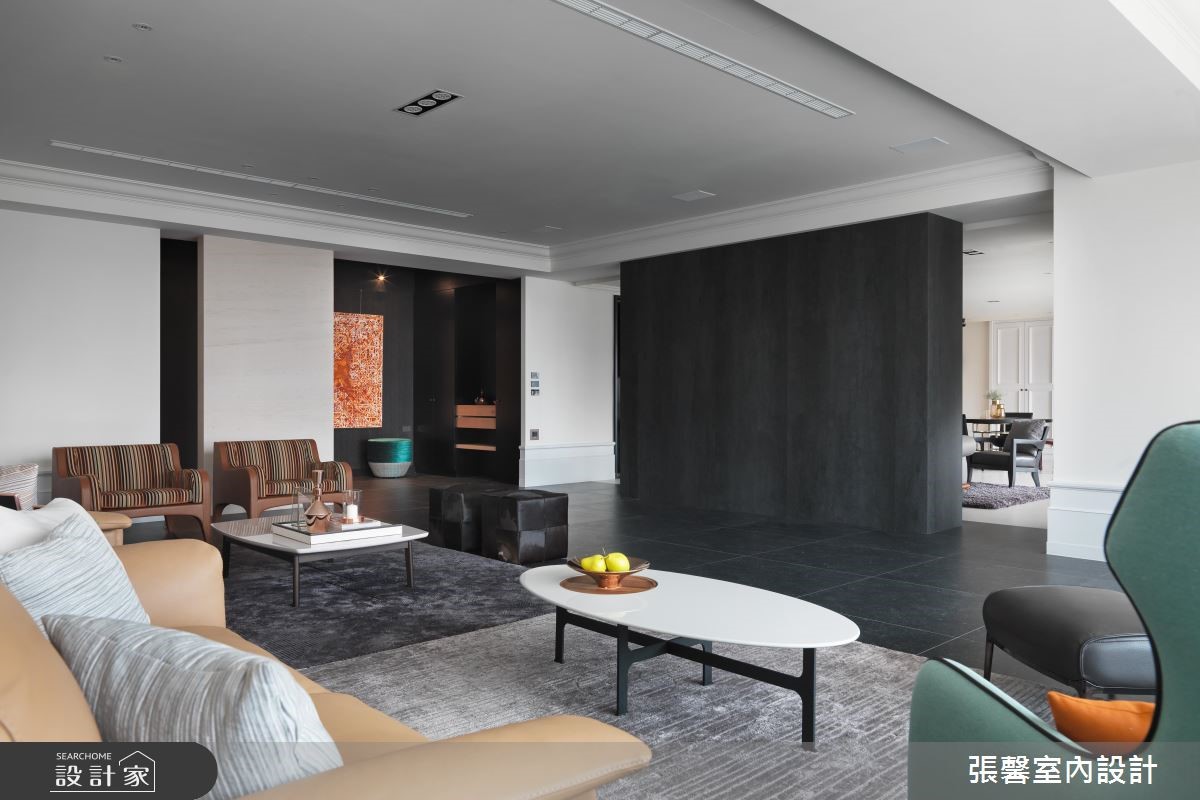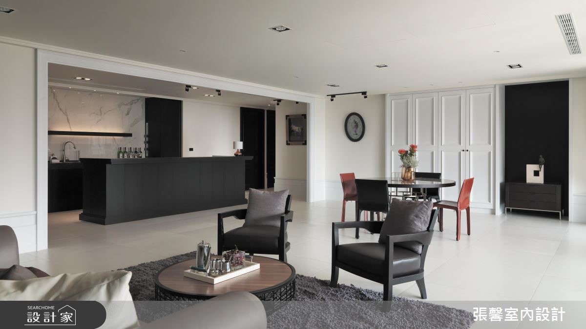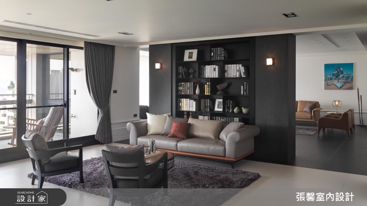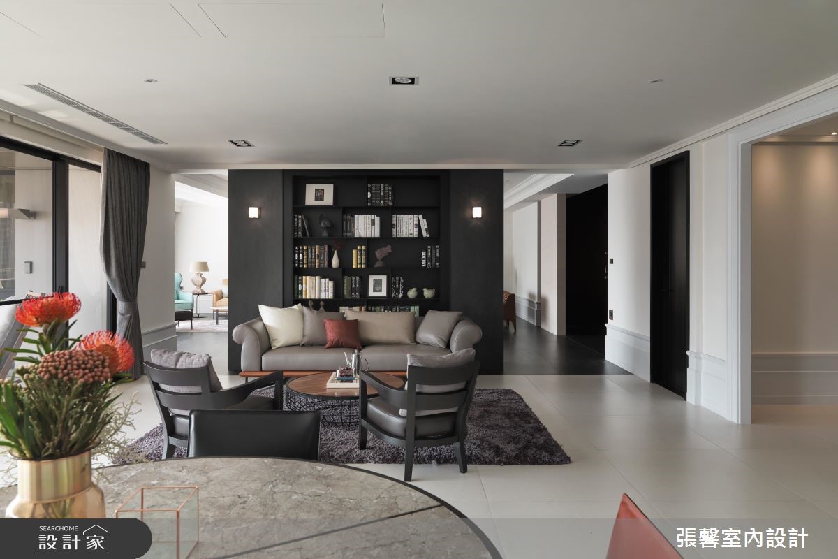 利用分明的黑白色调,交织出俐落、时尚感的风格宅邸,伴随轻透日光洗礼,提升视觉明亮度,也让家增添温度;搭佐现代品味的的家具与软件,揉和皮革、石材、木作与铁件的自然气息,激盪出优雅非凡的大宅风範。自然纹路的深色地坪从玄关处蔓延开来,大门尽头以木作平台创造出视觉端景,另一侧则以绒布质感的古典穿鞋椅,搭配大面艺术画作,明亮、大胆的用色替内敛、低调的空间增添无限生气。大量的白色调成为公领域基底,延伸出大尺度的豪宅气势,并藉由黑色调描绘出视觉层次,进而达到流畅的动线转折;公领域里,严选暖色调的家具家饰配搭,注入家的人文质量,沉稳原木质感的书墙成为客厅与书房的分水岭,这道屏隔机能的墙体,留出两侧行走动线,除了创造日常生活的便利,更延伸不同的场域造景;书墙处摆设质感沙发、单椅,构筑一处与家人谈心、阅读的书香领域。小编的最爱从客厅、阅读区、餐厅到卧室,形塑一整面日光窗景,让暖阳恣意融入室内;客厅设置一处阳台,可欣赏远方的歌剧院建筑,同时眺望户外的美丽景致。