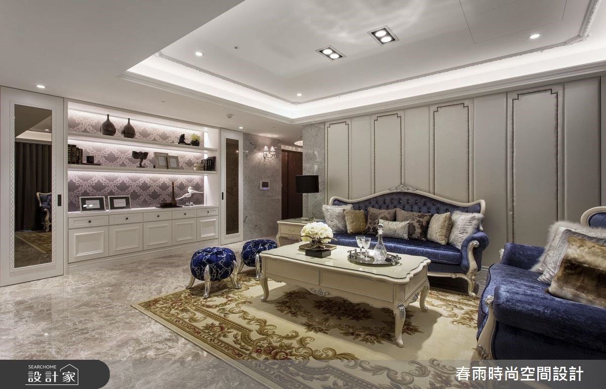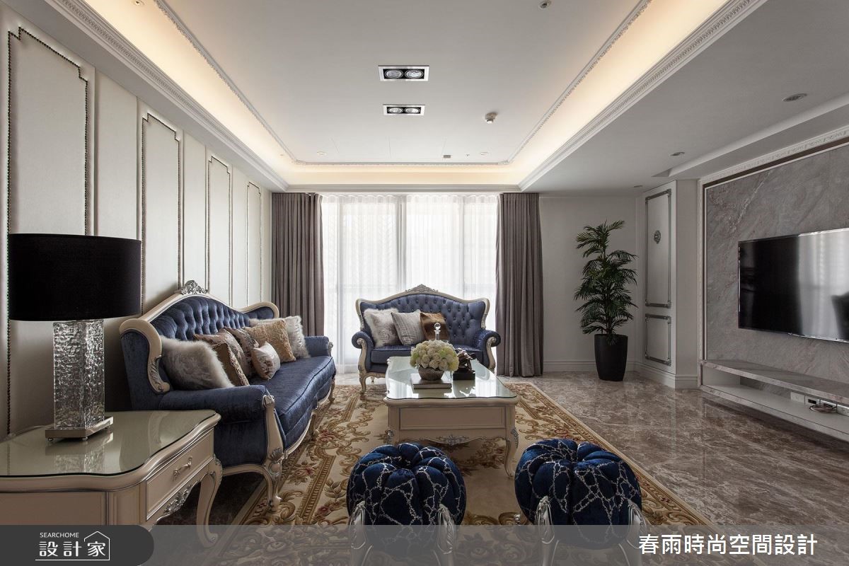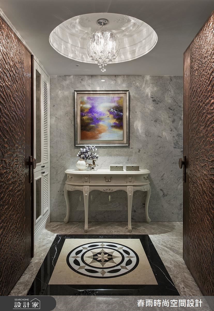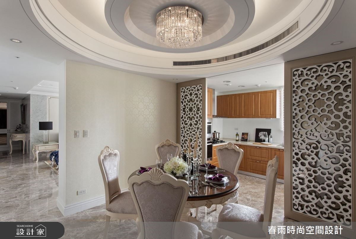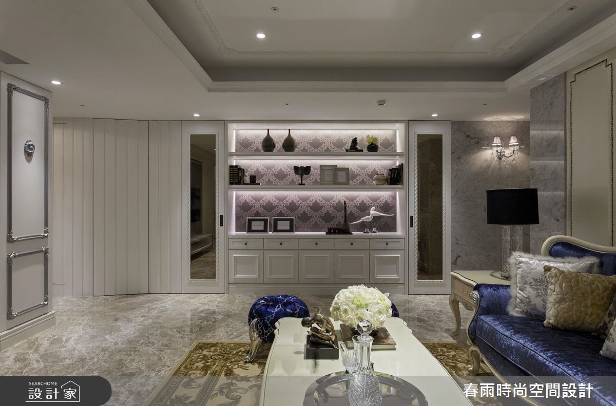 165平方米大宅,设计师加入合宜的动线与格局,以古典线条作为基础,搭配线板变化与家具陈列,挹注新古典风格并兼顾实用机能,营佈出豪邸的大器质韵,快跟着小编一起来看看吧! 玄关加入百叶窗门与镜面构组的鞋柜,同步带出收纳、穿衣镜机能,并佐以大理石地板和水晶吊灯,强调新古典的入门气势;客厅区,採以大理石打造电视墙,穿插茶镜与立体线板饰边,凸显立体醒目的主墙表情,沙发墙则採以皮革包覆,在白色背景之下,烘托蓝色典雅沙发的美好韵致,同时在客厅旁,善用柱体深度,规划展示层架与门片收纳柜,让整道立面容纳量十足,搭配古典壁板的修饰,化身实用兼具质感的墙体风貌;餐厅区域,则规划向上挑高的圆型穹顶,拉抬场域气度,延伸至厨房内,则可见完善的柜体配置,在深色木质柜体的铺排中,彰显独到的空间美感,实现风格与机能的双重期待!小編的最愛主卧床头加入细緻绷皮增添视觉立体度,搭佐壁灯光影烘托,显出空间气质,步入更衣间内,更给予大量实用柜体安排,呈现出精品店般的高级质感!