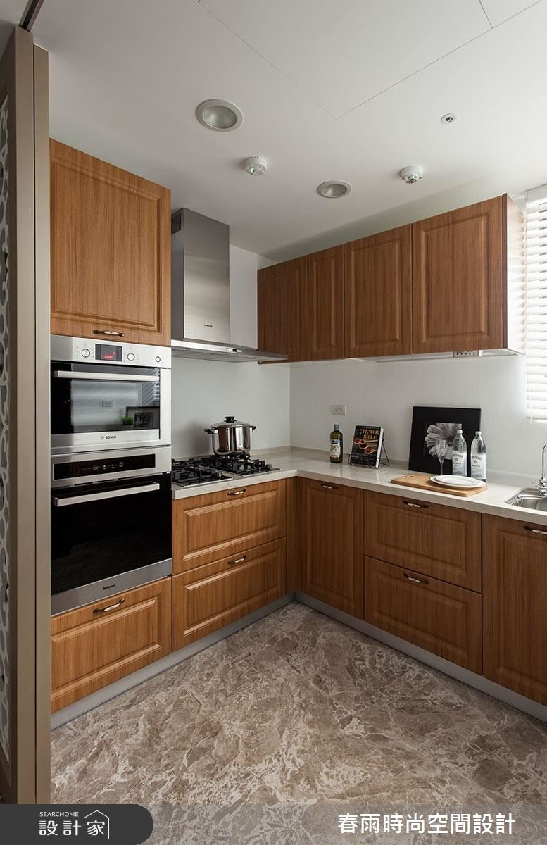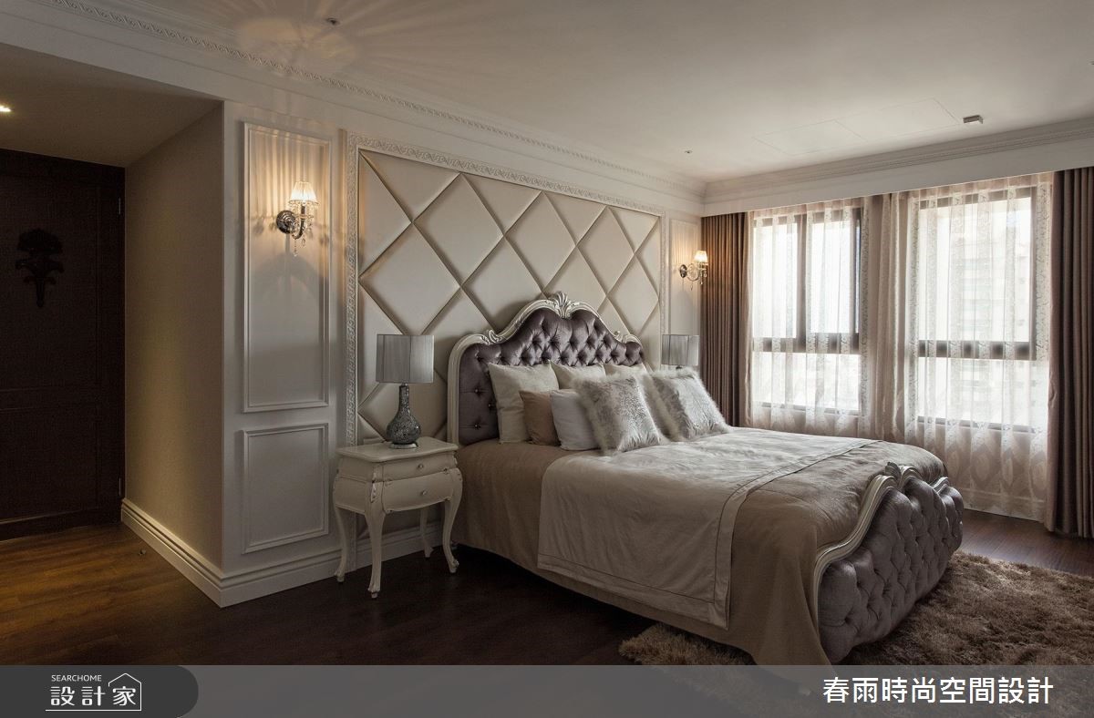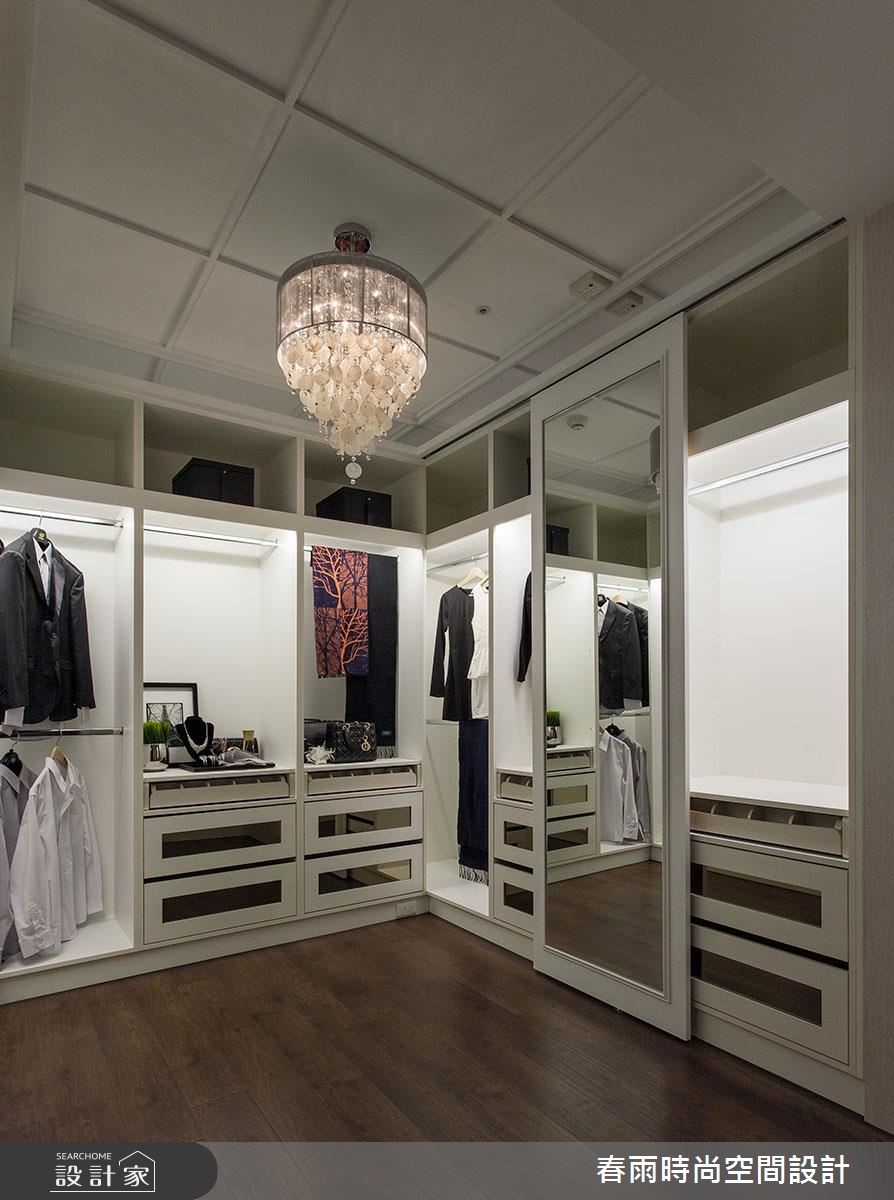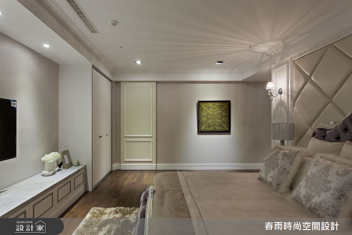 165平方米大宅,设计师加入合宜的动线与格局,以古典线条作为基础,搭配线板变化与家具陈列,挹注新古典风格并兼顾实用机能,营佈出豪邸的大器质韵,快跟着小编一起来看看吧! 玄关加入百叶窗门与镜面构组的鞋柜,同步带出收纳、穿衣镜机能,并佐以大理石地板和水晶吊灯,强调新古典的入门气势;客厅区,採以大理石打造电视墙,穿插茶镜与立体线板饰边,凸显立体醒目的主墙表情,沙发墙则採以皮革包覆,在白色背景之下,烘托蓝色典雅沙发的美好韵致,同时在客厅旁,善用柱体深度,规划展示层架与门片收纳柜,让整道立面容纳量十足,搭配古典壁板的修饰,化身实用兼具质感的墙体风貌;餐厅区域,则规划向上挑高的圆型穹顶,拉抬场域气度,延伸至厨房内,则可见完善的柜体配置,在深色木质柜体的铺排中,彰显独到的空间美感,实现风格与机能的双重期待!小編的最愛主卧床头加入细緻绷皮增添视觉立体度,搭佐壁灯光影烘托,显出空间气质,步入更衣间内,更给予大量实用柜体安排,呈现出精品店般的高级质感!
