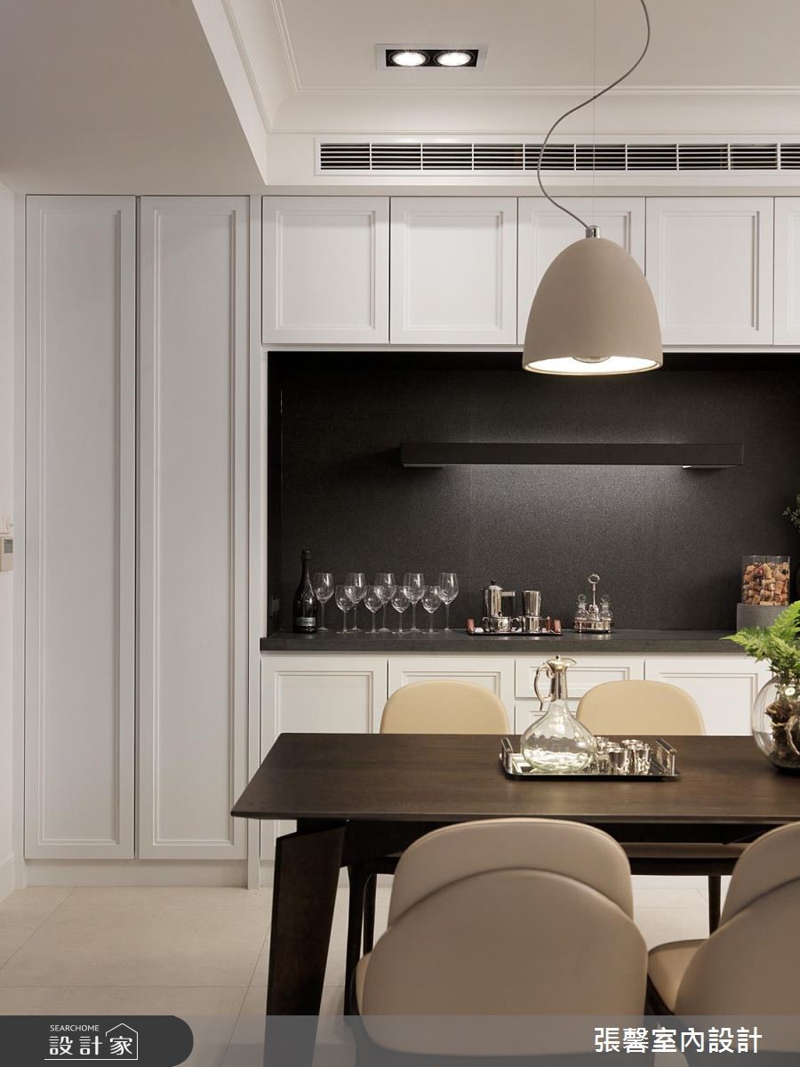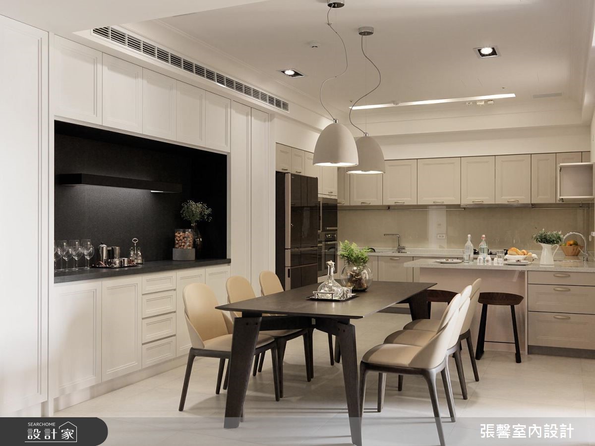轻洒白、卡其色等淡雅色系于空间里,创造出暖调的美式风格,借由纯净石材、黑色调的铁件刻划出俐落的居家风貌,呼应屋主对家的想像与期待,将富有温度与视觉张力的元素相融,室内空间更具有凝聚力。轻柔淡雅的色系展现惬意无压的气息,成为公领域唯一的美学风格。淡淡的大地色石材打造整面电视墙,注入家的情感与温度,两侧以轻量化的喇叭电器设备,搭佐下方纯白的视听机柜,极简线条替空间营造出轻盈无压之感;客厅里摆设弧形线条的沙发设计,让家人在看电视或互动中,情感更为凝聚;延续俐落的美式线条,融入开放式的厨房设计里,客、餐厅之间以格纹推拉门界定,让餐厨领域更保有完整空间,宽敞的位子增设中岛吧台,实现女屋主的梦想厨房;靠近餐厅壁面的备餐柜以黑色衬底,与周围的白色线板形成鲜明对比,烘托优雅且内敛的屋主特质,而深咖啡色的原木餐桌摆设,挹注深厚的家人情感。小编的最爱以黑白色调打造简洁俐落的美式风格,加强收纳机能也成为空间的设计核心,从餐厨空间到书房领域,藉由线板造型的门片与开放隔板纳入丰富的收纳量。
