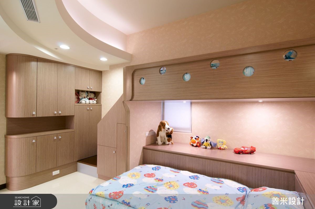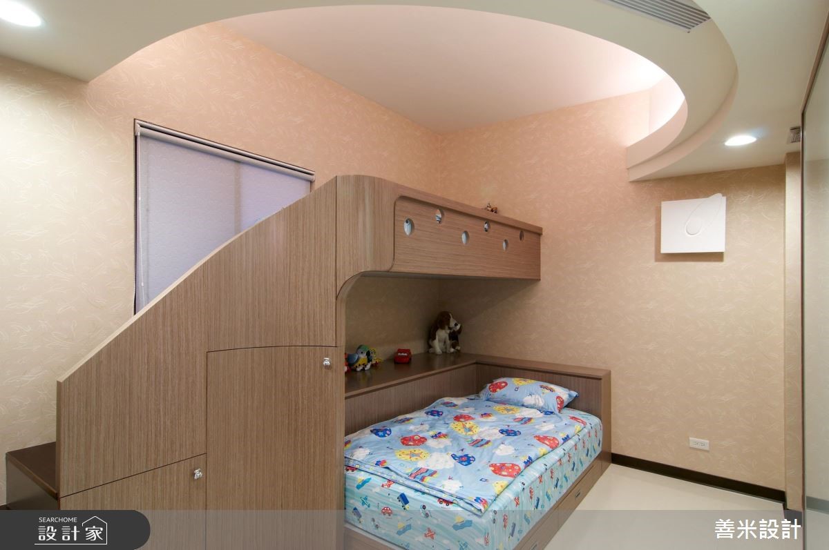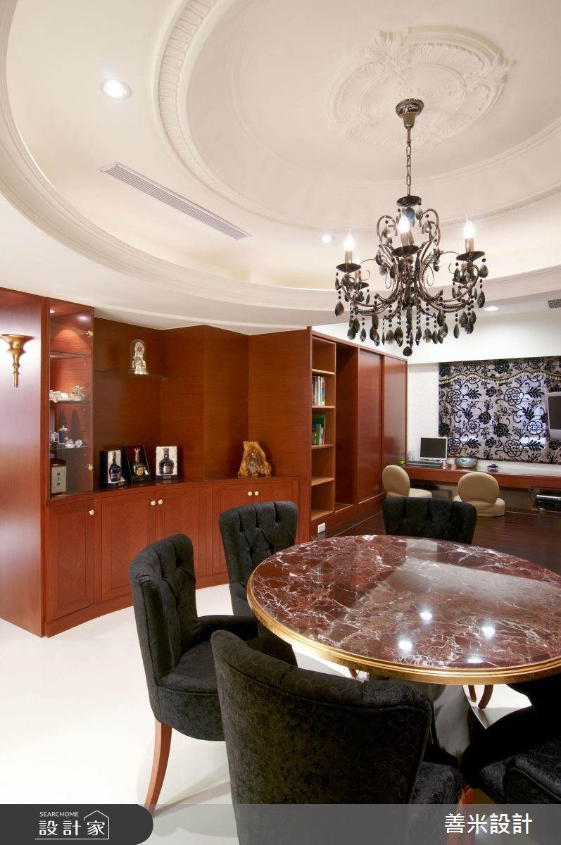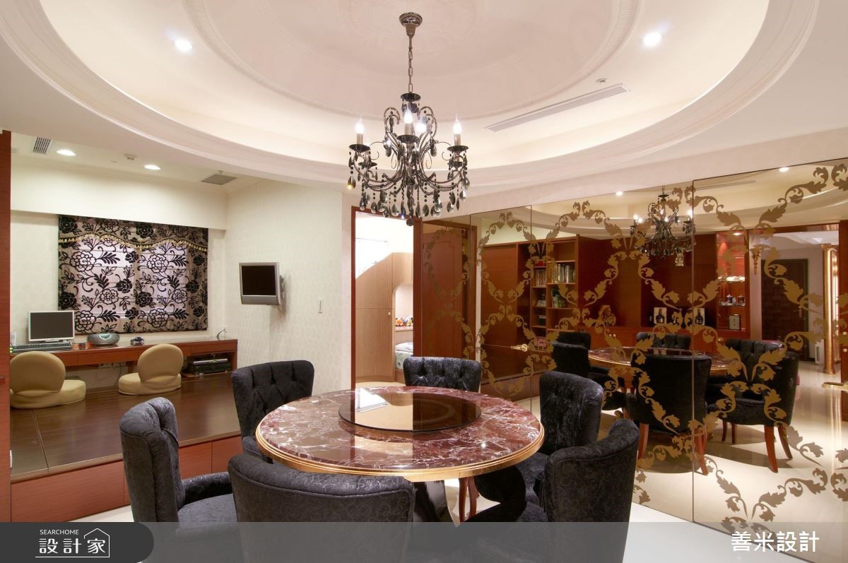 本案为一位于台湾132平方米、3室2厅的新房,採欧式古典风设计,并运用黑、金、红三个色调作延伸。天花板上有盏烛台式水晶灯,沙发则用鲜明的金、黑配色,黑云石大理石电视墙、暗红色的实木家具凸显出尊贵感;餐厅天花板上的黑色水晶灯,和客厅的白色水晶灯形成对比,大片经磨砂处理的镜面、繁複的纱帘设计,在在展现设计师对于细节的注重。镜头转进主卧,床头雕樑画栋般的设计配上银白色的绷板、实木衣贵和客厅的贵气乡呼应。儿童房则贴心以简约中带点活泼为设计主轴,并技巧性地运用弧形收纳柜和天花来展现整体感。主要建材:黑云石大理石、樱桃红大理石、彷古金箔、镶崁玻璃、实木雕刻。