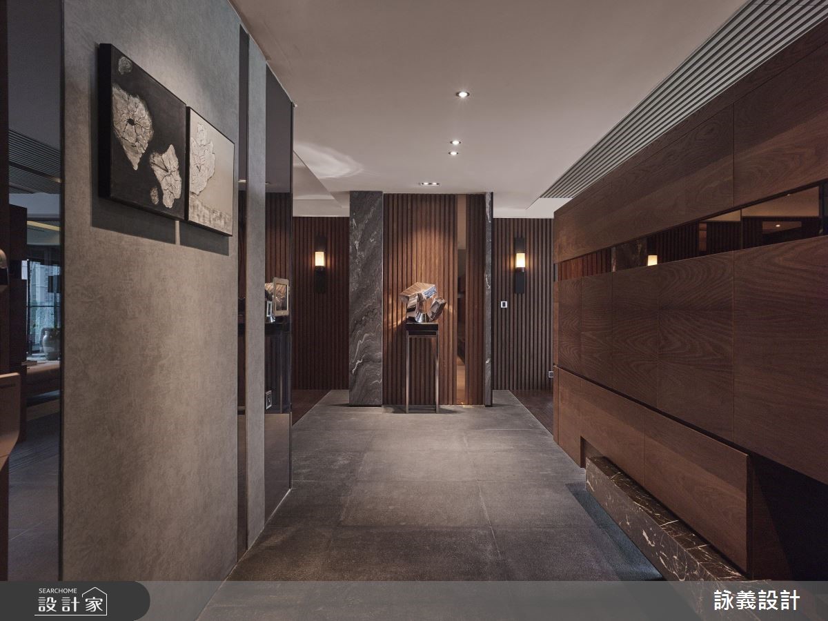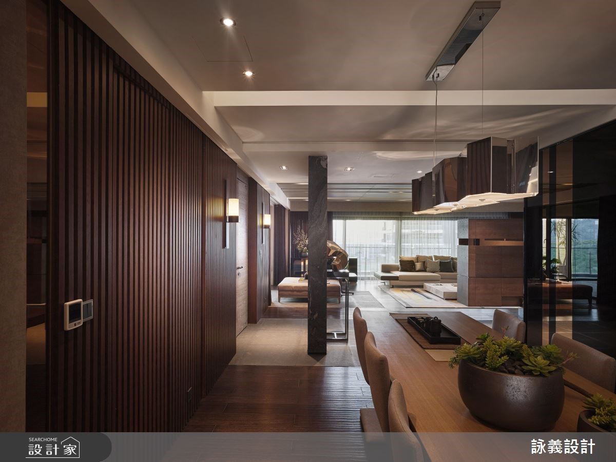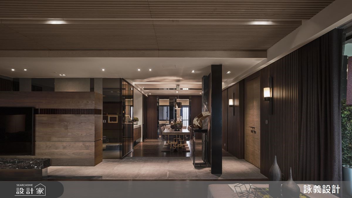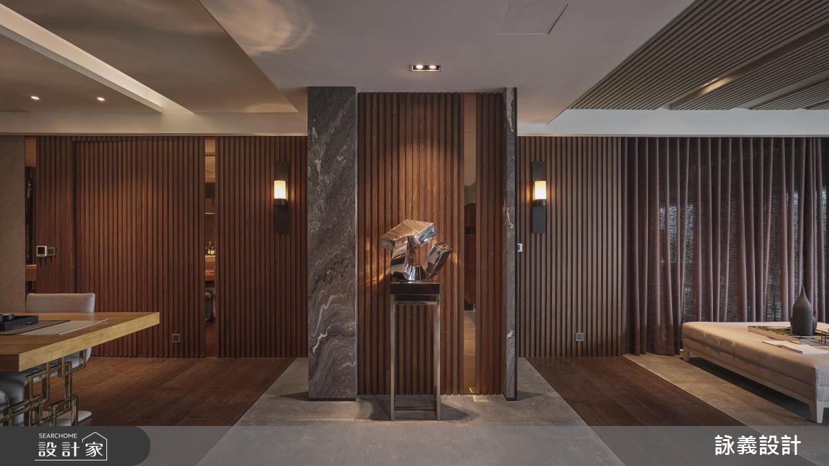 沉稳的大地色系铺陈开来,细腻的木纹结构堆叠出壮阔的天花板造型,与隔栅造型的格屏、壁面造型相互呼应,且延伸一室渐层的美学风采;搭佐石材、镜面与铁艺的现代感建材,俐落的线条描绘出独特的屋主性格,更丰盈室内居家设计的视觉展现。深色石材铺陈玄关空间,天花板以嵌灯为照明,导引一条通往公领域的索引,电视墙背面以巨型木作堆叠出屏风机能,两侧镜面材质的妆点,视觉延伸感让空间营造出更开阔气度,视觉的尽头以木作隔栅与石材打造出风格立面,细緻感的矮柜上摆设艺术雕塑品,形塑端景造型;天花板以细长的木纹线条铺陈,视觉不断延伸、堆叠,形塑壮阔气度,加上大面採光的优势,自然光映照在天花板镜面质材,创造出丰富的光影变化;玄关端景墙的另一侧为餐厅,深色木纹地板铺陈与隔栅壁面造型,加上原木餐桌与木作柜体设计,鲜明的纹理与色泽调和出温润的用餐氛围。小编的最爱整体空间以简约用色、掌握细緻的建材变化,刻划出深刻且蕴含人文情怀的简约风尚。