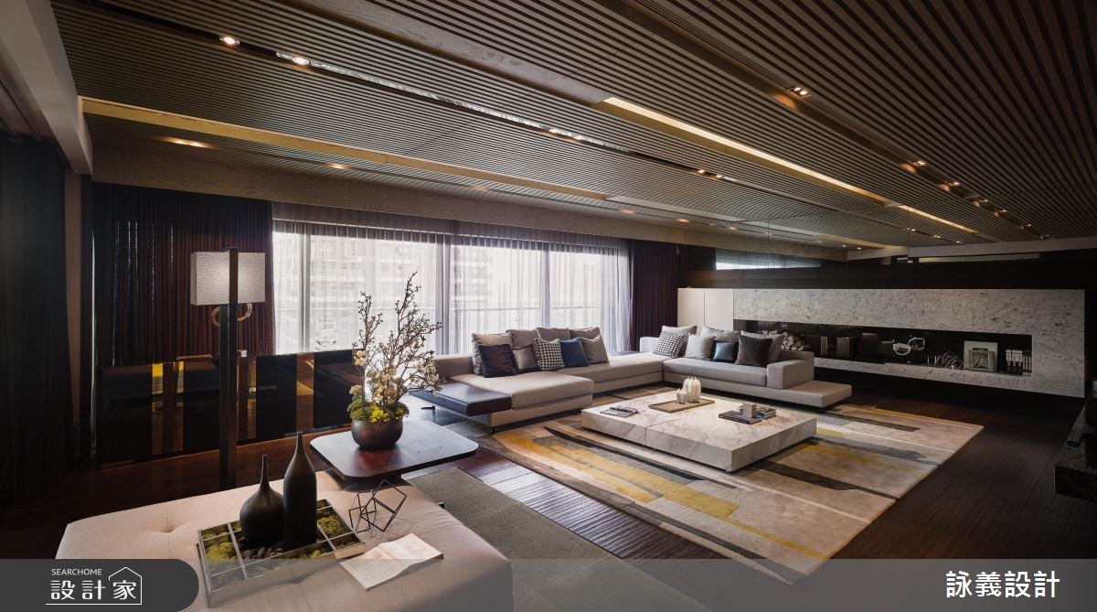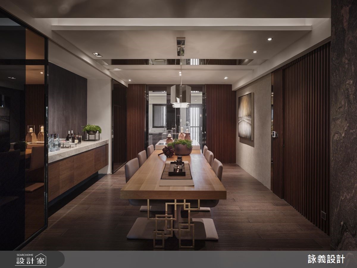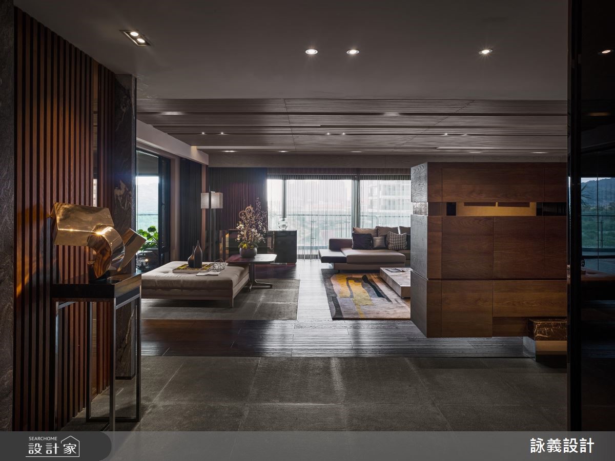 沉稳的大地色系铺陈开来,细腻的木纹结构堆叠出壮阔的天花板造型,与隔栅造型的格屏、壁面造型相互呼应,且延伸一室渐层的美学风采;搭佐石材、镜面与铁艺的现代感建材,俐落的线条描绘出独特的屋主性格,更丰盈室内居家设计的视觉展现。深色石材铺陈玄关空间,天花板以嵌灯为照明,导引一条通往公领域的索引,电视墙背面以巨型木作堆叠出屏风机能,两侧镜面材质的妆点,视觉延伸感让空间营造出更开阔气度,视觉的尽头以木作隔栅与石材打造出风格立面,细緻感的矮柜上摆设艺术雕塑品,形塑端景造型;天花板以细长的木纹线条铺陈,视觉不断延伸、堆叠,形塑壮阔气度,加上大面採光的优势,自然光映照在天花板镜面质材,创造出丰富的光影变化;玄关端景墙的另一侧为餐厅,深色木纹地板铺陈与隔栅壁面造型,加上原木餐桌与木作柜体设计,鲜明的纹理与色泽调和出温润的用餐氛围。小编的最爱整体空间以简约用色、掌握细緻的建材变化,刻划出深刻且蕴含人文情怀的简约风尚。