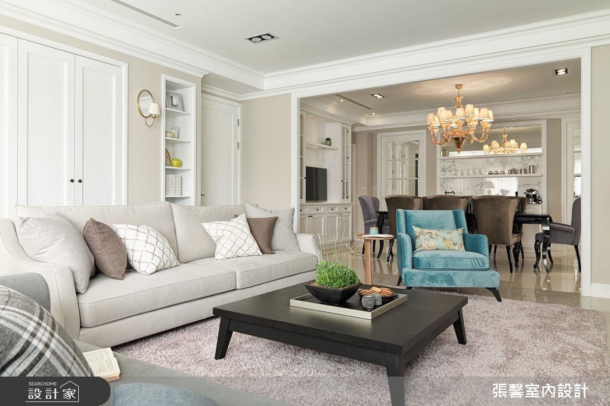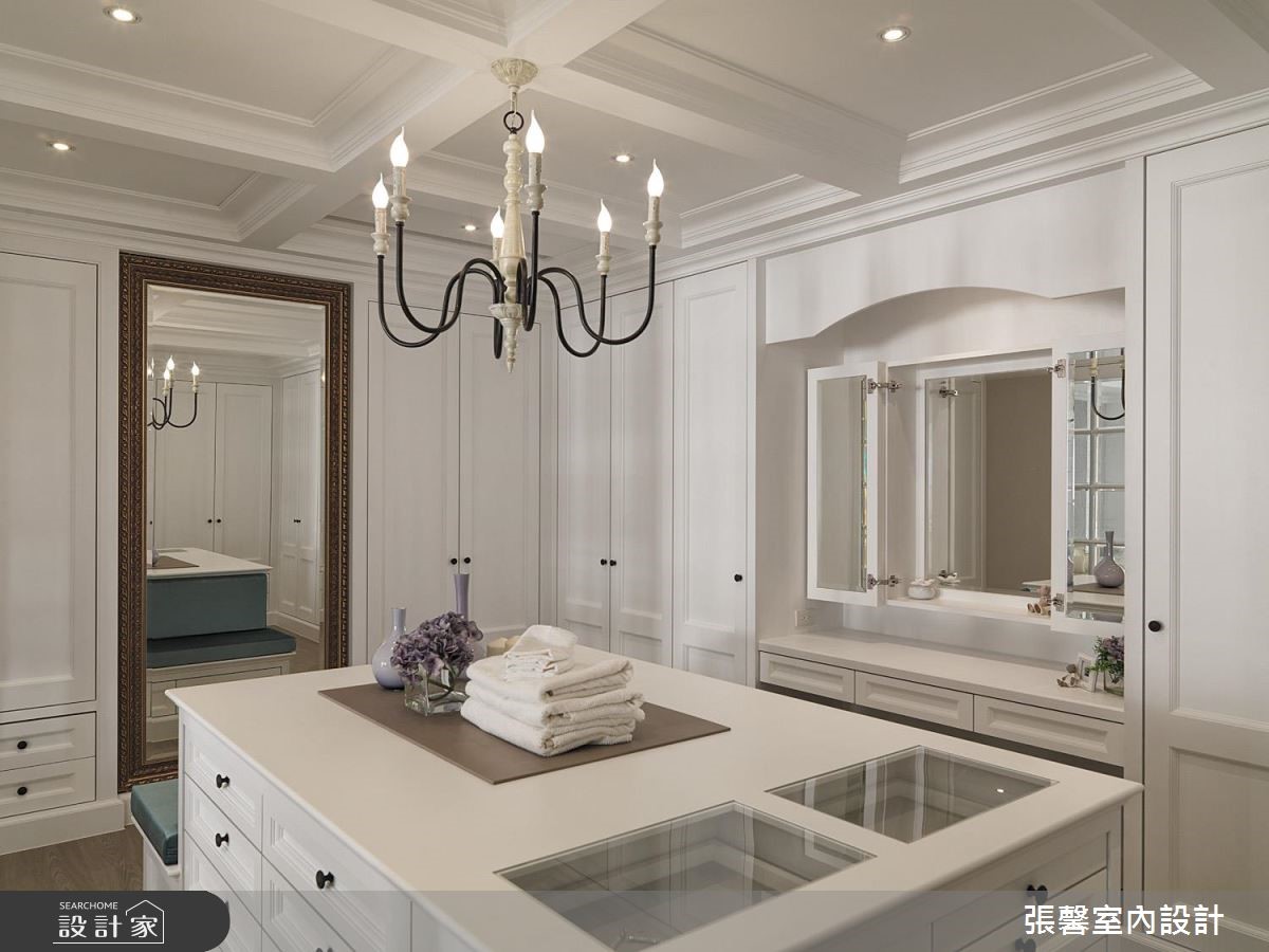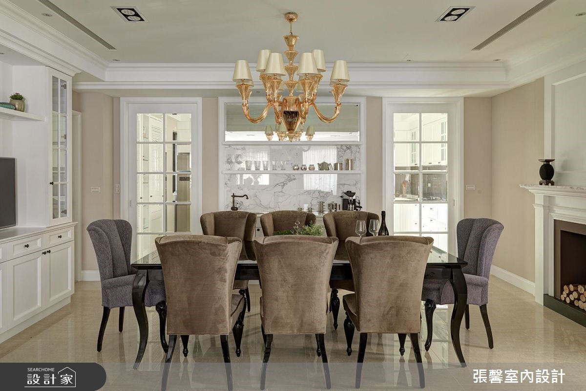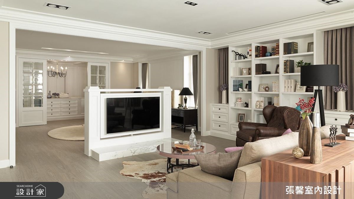360 平米大宅是夫妻的两人世界,虽基地宽阔明亮,但屋形狭长、边间格局些许畸零。经由张馨设计团队矫正后,修饰了长屋的空荡感受,更注入华而不奢的美式经典元素,形塑大宅气度。公领域为开放设计,凸显了美式宅邸的深邃与气派,设计师巧妙在场域过道之间,以收框的设计手法串连客厅与餐厅,使长型屋不显过度空阔,佐以美式经典元素堆叠,更彰显精緻细节。墙面、家具软件与抛光石英砖地板大都採杏仁、雾乡色调,搭配柜体与天花板的简约线板设计,显得温馨且富有温度;壁炉设计、微奢吊灯与大理石则营造了绝代风华。独立厨房巧用纯白玻璃门片引光、保持通透与明亮,完备的 L 型厨房搭上中岛吧台,彷彿进入美国纽约曼哈顿的豪华宅邸。由于美式家居的公私领域分明,设计师特别打造起居室与办公室,以简洁的现代风尚为主。小编的最爱主卧结合了起居室与大型更衣间机能,以电视墙区隔休閒与睡眠场域,更铺设木地板营造温润气息;更衣间塗刷纯白色调,搭配中岛收纳凸显宛如纽约上城的优雅气息。