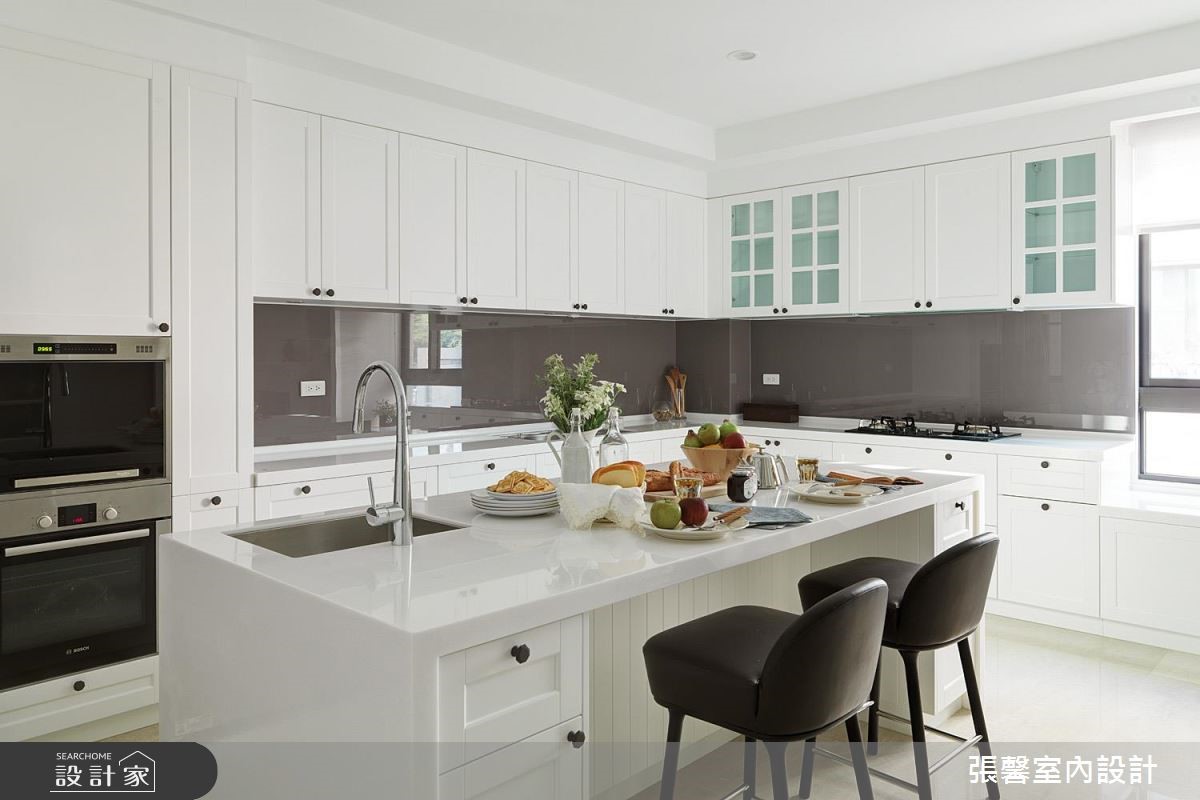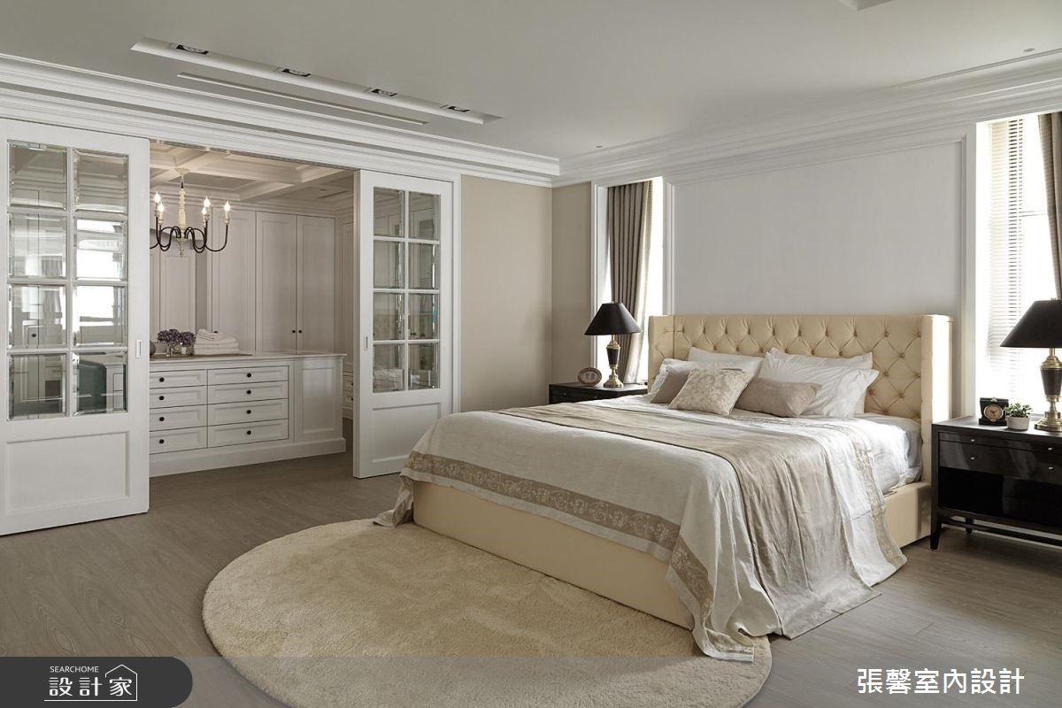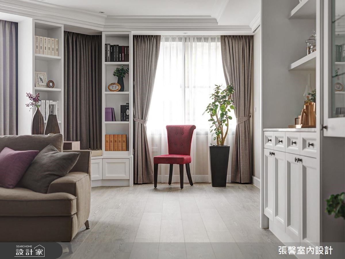 360 平米大宅是夫妻的两人世界,虽基地宽阔明亮,但屋形狭长、边间格局些许畸零。经由张馨设计团队矫正后,修饰了长屋的空荡感受,更注入华而不奢的美式经典元素,形塑大宅气度。公领域为开放设计,凸显了美式宅邸的深邃与气派,设计师巧妙在场域过道之间,以收框的设计手法串连客厅与餐厅,使长型屋不显过度空阔,佐以美式经典元素堆叠,更彰显精緻细节。墙面、家具软件与抛光石英砖地板大都採杏仁、雾乡色调,搭配柜体与天花板的简约线板设计,显得温馨且富有温度;壁炉设计、微奢吊灯与大理石则营造了绝代风华。独立厨房巧用纯白玻璃门片引光、保持通透与明亮,完备的 L 型厨房搭上中岛吧台,彷彿进入美国纽约曼哈顿的豪华宅邸。由于美式家居的公私领域分明,设计师特别打造起居室与办公室,以简洁的现代风尚为主。小编的最爱主卧结合了起居室与大型更衣间机能,以电视墙区隔休閒与睡眠场域,更铺设木地板营造温润气息;更衣间塗刷纯白色调,搭配中岛收纳凸显宛如纽约上城的优雅气息。