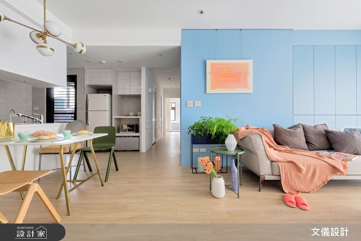 身为日式花艺老师的屋主,钟情法式空间的浪漫想像,因此结合19世纪日本主义与欧洲艺术的文化内涵,转化为室内的法式线板与日式俐落的线条、图腾,让法日精湛的美感相融。从玄关开始,浅色木纹的地坪铺叙一室,白色系的收纳柜结合开放与封闭收纳,打破制式的规矩,转角以自然枝幹贯穿原木平台,上方摆设花艺之作,形塑和风艺术端景之美。自然光随着网纱窗帘筛洒一地,让空间里的缤纷色系更加鲜明、耀眼,公领域里更让蓝与白色调成为唯一的风格表述,整片沙发背墙漆上水蓝色调,一旁配置四排收纳机能,其柜体间自然流露的沟缝,刻划出视觉层次;壁面另一侧的亮橘色画作,彷彿太阳般绽放温暖热度,加上花卉绿意的点缀,彷彿置身在鸟语花香的大自然里;电视墙以白色为基调,无大费周章的装修,仅以线板简单描绘原生壁面,平台上随着风格器皿或是物件摆设,挹注人文气质;以中岛简单界定出餐厨领域,餐桌椅则藉由简约的线条描绘,俐落的线条之中更展现轻盈视感,体验惬意无压的家居风格。小编的最爱主卧室里以裸色系为主,展现春天般的时尚质感;女儿房里则佐入绿色调,且结合睡眠与工作区,让生活美感与机能兼备。