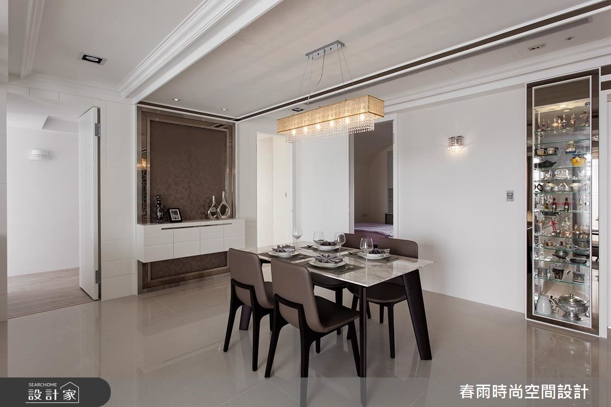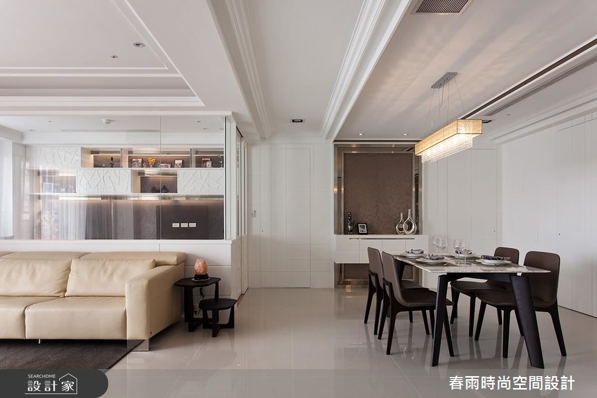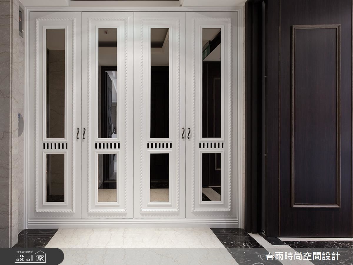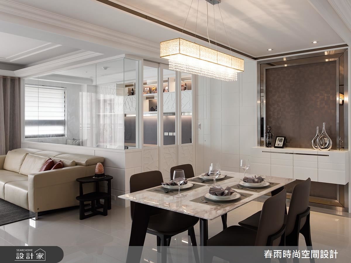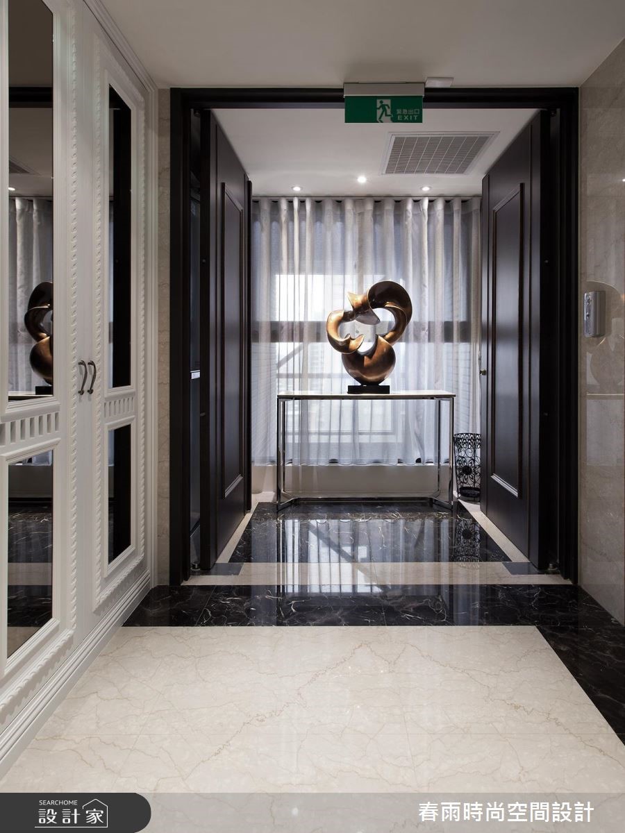 165平方米大宅,设计师採以清玻形构书房隔断,缔造公领域的通透视野、延伸居家尺度,同时加入精巧的收纳技法,搭配着简约的轻古典底蕴,演出优雅而舒适的生活境界,快跟着小编一起来看看吧! 玄关区,以双色大理石铺陈地板,搭配艺品人文端景,创造耀人大器的入口场景,并于墙面加入茶镜饰花滚边柜,置入充实且美形的收纳机能;公共区域则透过清玻璃的设定,汇聚客厅与书房窗光,营造明媚敞亮的场景,电视墙与机柜檯面皆採银狐大理石建构而成,彰显天然的石材纹理,衬佐镜面与水晶灯的妆点,带出新古典的精緻感;餐厅区则规划展示平台,形塑用餐区的主景,并弱化周边门片的存在感,打造干净简约的立面风情,一旁更加入玻璃橱窗设计,展示出生动的居家段落;主卧给予轻盈的浅木色,搭配紫色的床头绷皮与窗帘,铺陈出低奢质感,同时配置大面积衣柜、与一体成形的书桌,缔造美感、机能兼具的居室效益!小編的最愛主卧床头加入细緻绷皮增添视觉立体度,搭佐壁灯光影烘托,显出空间气质,步入更衣间内,更给予大量实用柜体安排,呈现出精品店般的高级质感!