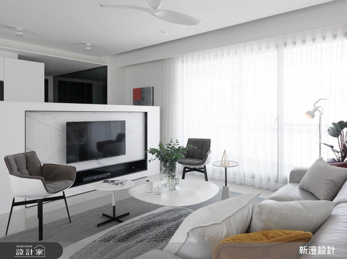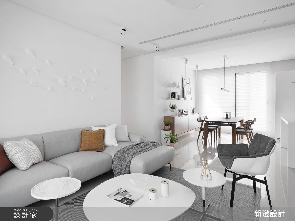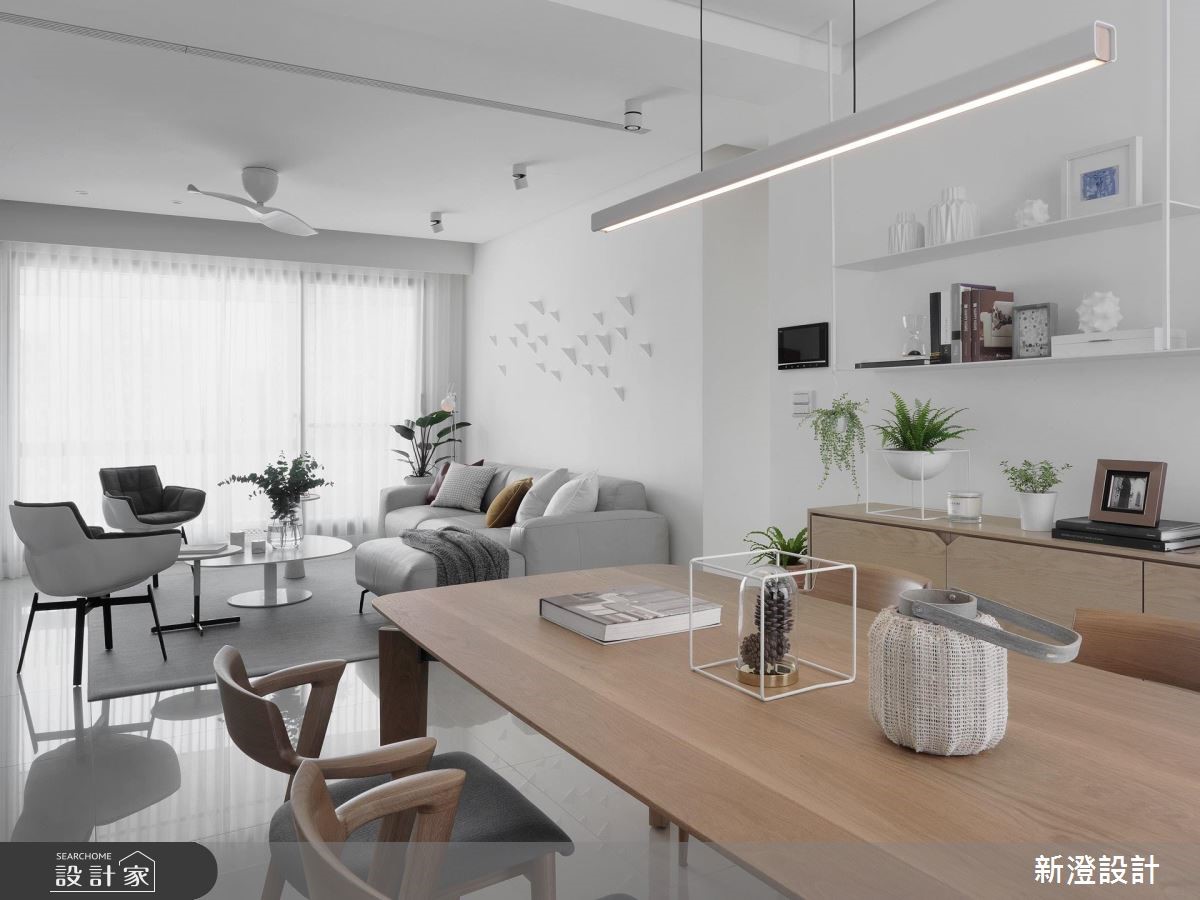 为了喜欢简约、清爽感的屋主,这处155 平米的新成屋,以清新的纯白色作为主色调,完美衬托了由落地窗进驻的明亮采光,再搭配完备的居家机能规划,让居家空间感觉更加纾压和放松。开放式设计的公共空间,设计师透过灵活的动线串联客厅、餐厅、厨房等区域,让居家视野得以连贯,创造出宽敞的空间感,并利用不做满的大理石电视墙、中岛、餐桌等,确立各个空间的范畴。餐厅选用木质餐桌和餐椅,并运用木质柜体结合白色悬吊式层架,展现出轻盈而温润的视觉感受,并达到了收纳的机能效益。居室后方的大幅背墙设计,也相当令人惊艳,运用如自然石材的纹理,以及立体的凿纹效果,为墙面添注丰富的视觉效果,在收纳部分,居室内也设有独立的更衣、梳妆空间,形构完整而舒适的私领域面貌。小编的最爱简约、清爽的白色系,营造出纯净没有杂质的视觉感受,搭配温润的浅色木质,让整个空间洋溢着清新又舒适的生活气息。