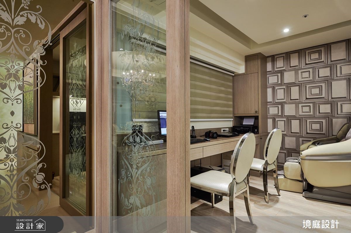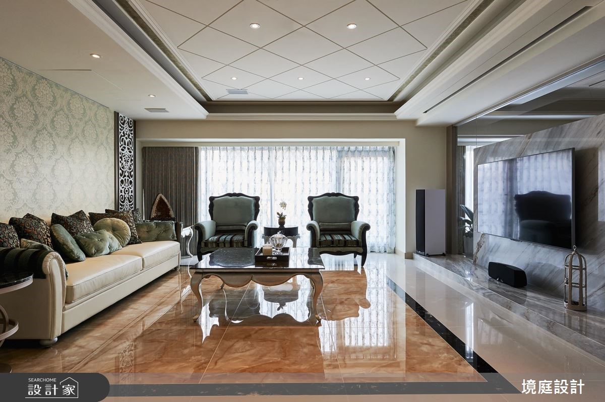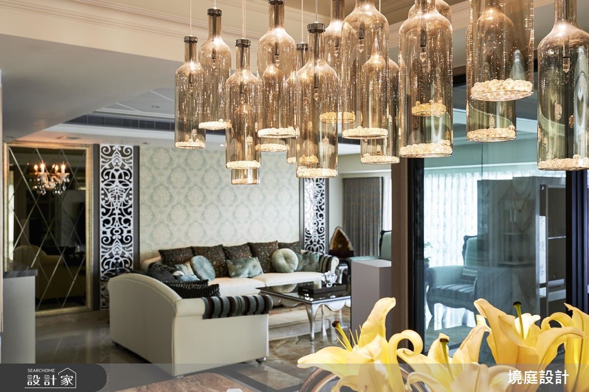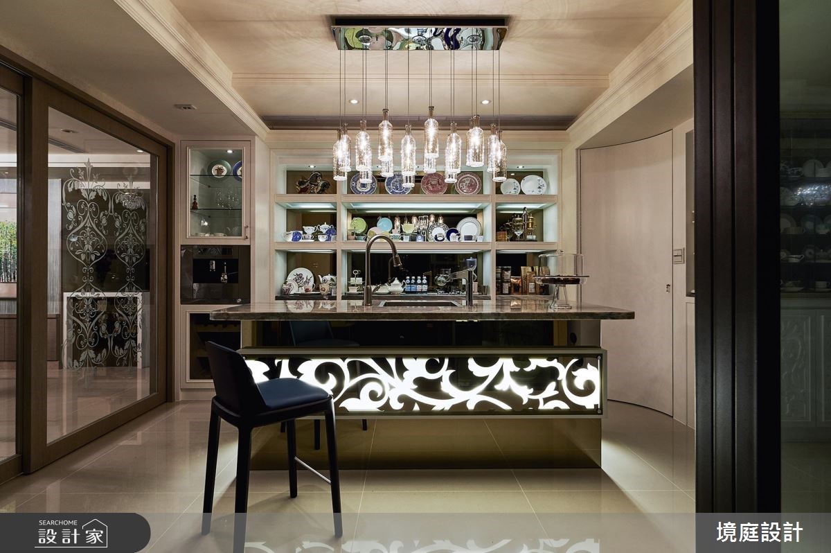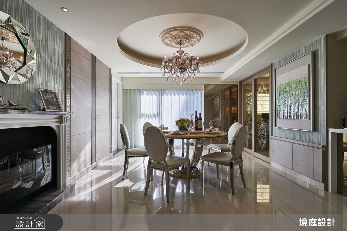 396 平米的新古典大宅,设计师透过雕花图腾、细緻镜面、家具软件等铺排,打造出时尚精緻却丝毫不显沉重的空间印象,彰显出雍容的宫廷风範,快跟着小编一起来看看吧!玄关区,摆置了屋主收藏的艺术珍品,作为入门的视觉端景,伴随着光源烘托与细腻的地坪建材,彰显大器端庄的第一印象;客厅则让电视墙呈现透空型式,保有前后光线的流动,并陈列新古典家具,结合墙纸与菱型图腾,开启优美的生活场景;餐厅则在蓝绿色主调之下,展现清新年轻的印象,一旁则巧妙加入壁炉设计,带出宫廷的时尚风采,同时规划一座吧檯,将收纳结合装饰,打造一整道可摆放杯盘的展示立面,而天花的玻璃酒杯悬吊灯饰,则出奇不意增添半空中的趣味亮点;私领域,则依循每位使用者的个性,展现不同的独特品味,无论是壁面、柜体或色彩分佈等细节,都加以巧思雕琢,流露舒适兼具雅致的气息!小编的最爱因应屋主需求,特地于客厅电视墙后方规划一处日式禅风空间,有别于新古典风格的精緻,这里显得清爽而纾压,成为生活中泡茶小歇的绝佳领域!