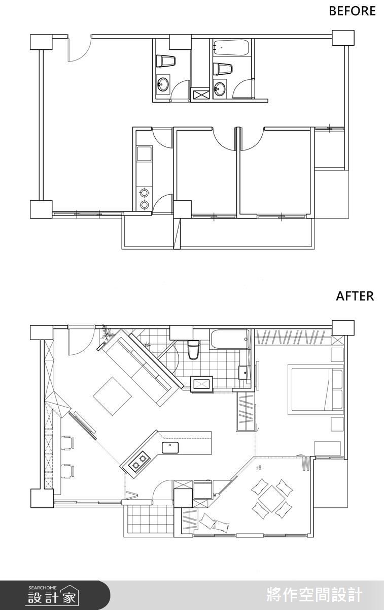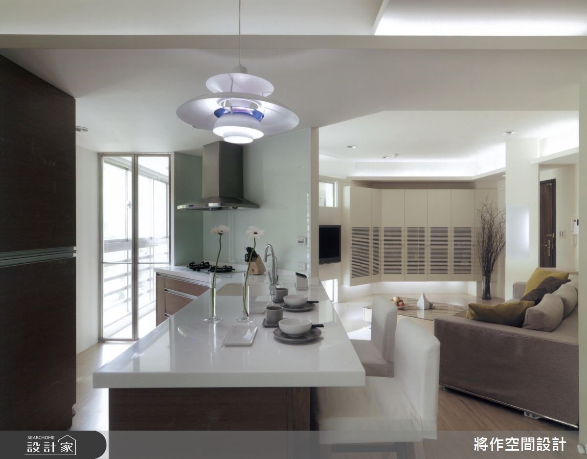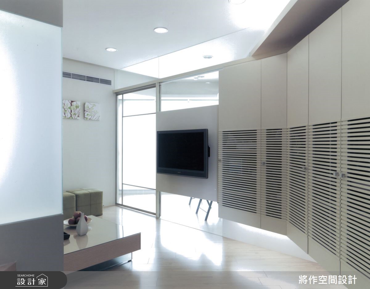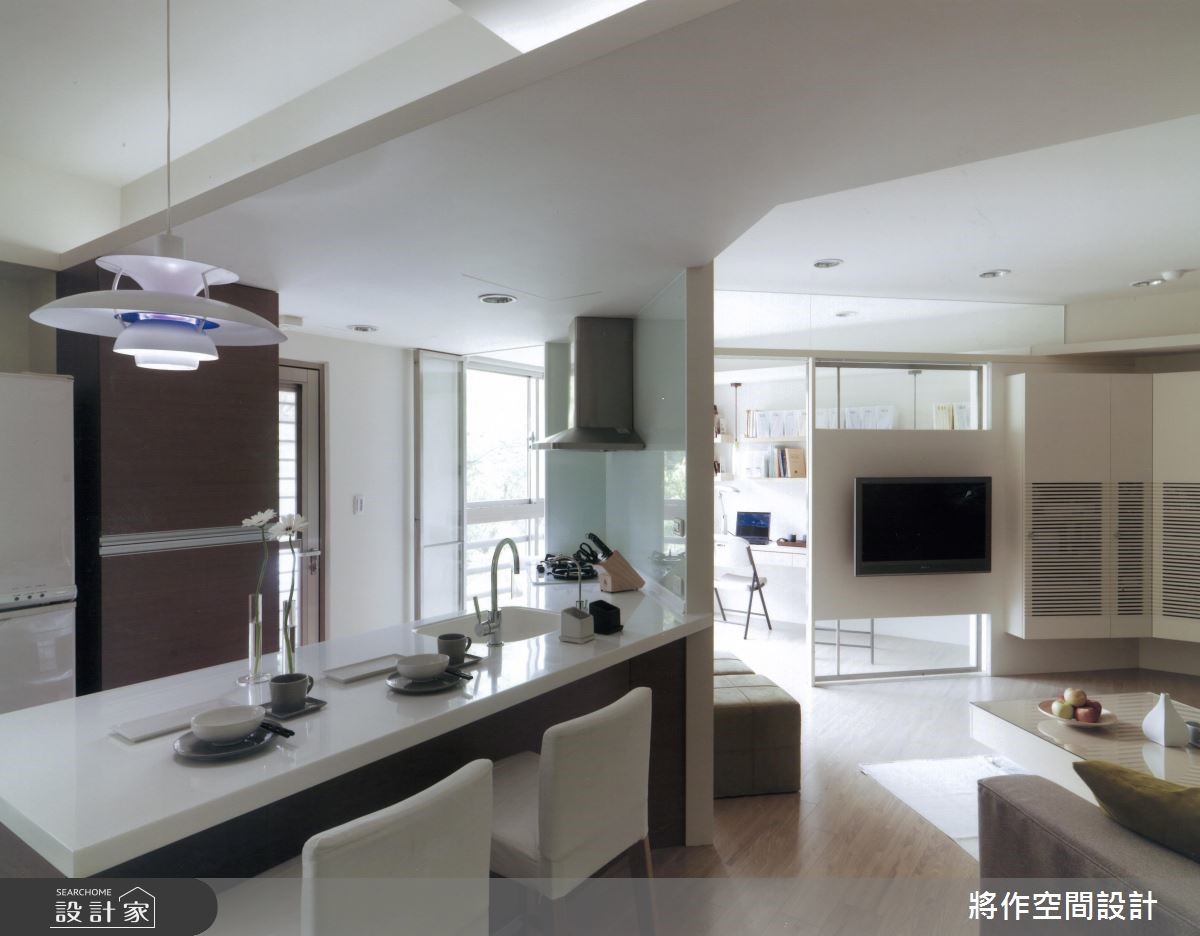 坐拥优美景观的73平方米空间,设计师于室内加入简约风格,并重新配置格局,不仅在有限场域内打造大三房,也拆除隔墙,重新定义每个区块,促使採光流动与情感交流,型塑出美感、机能都满分的生活视野,快跟着小编一起来看看吧!沿着 45 度角的玄关架构步入空间,可见到延伸的柜体铺排,并刻意以悬浮手法将量体轻量化,搭配着底部灯光的烘托,兼具机能与轻盈质感;客厅则呈方正格局,让电视墙结合清透隔断,引入大量的自然光照,促成明亮敞阔的厅区视野,也替后方双人书房揽进更大的空间感,不因空间侷限而变得压迫;紧邻于一侧的餐厨吧檯,取代了传统的餐桌,透过斜切角度的檯面规划,让动线更显顺畅无碍,开启交流互动的生活情境;寝卧则结合架高地板的多功能起居室,之间採用轻巧的折叠推拉门做界定,除了拓大房内可使用範围,也让阳光可相互交流,开启更舒适的私领域视野!小编的最爱设计师顺应不规则的格局条件,针对空间盲点加以改造,重新分配出合宜的佈局,呈现出最适合居住者的机能动线!