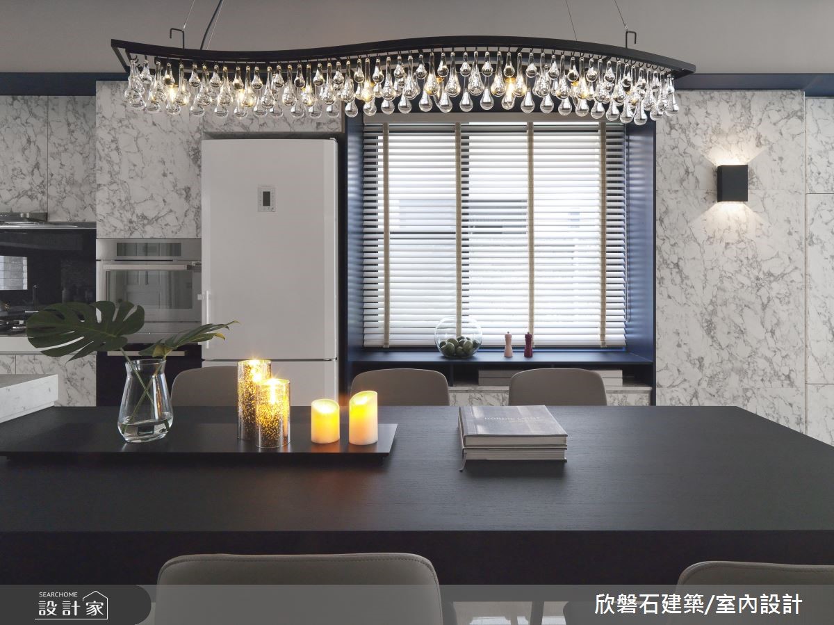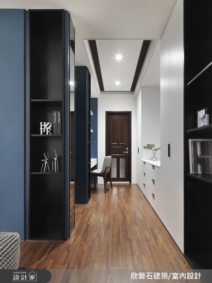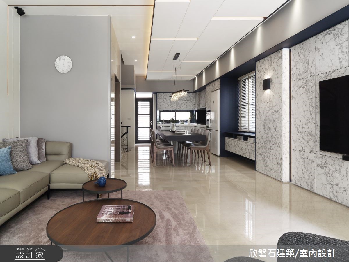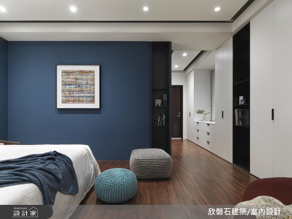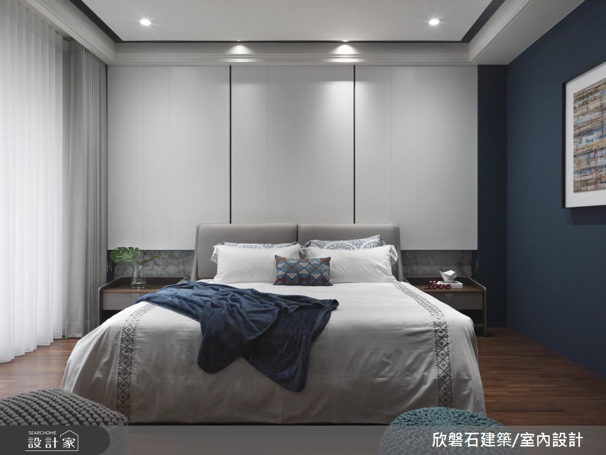 根据设计家 2018 装修趋势报导,大理石成为最受欢迎的建材之一,从 2015 年起,在各式精品配件、甜点领域都颇受欢迎,近年室内装修也搭上这波大理石风潮,欣磐石设计团队在本案运用大量的大理石元素,创造高端时髦气息。本案将重点放在公领域,利用纯白色调与俐落线条烘托挑高空间的优势,鲜明的黄色线条由墙面推展到天花板,搭配内嵌间接照明的局部降板,营造立体前卫的端景。带有卡拉拉白大理石纹路的墙面自电视墙一路延伸至开放餐厨空间,与餐柜面板及中岛吧台相互呼应,形塑了时尚且富有质感的氛围。针对色彩搭配与家具挑选,将冗赘的线条与彩度降至最低,更加凸显现代风格的特色。小编的最爱主卧以沉稳的天鹅绒蓝作为主色,更在床头点缀大理石元素,达到风格吻合的目的;因为平方米数足够,更结合阅读、休憩等书房机能,提供宽裕的起居空间。