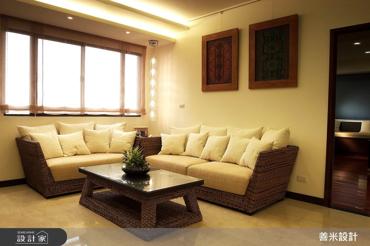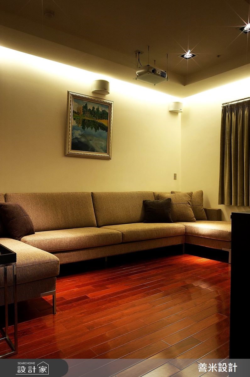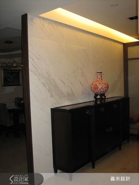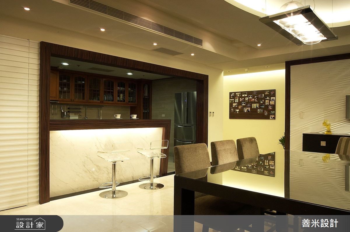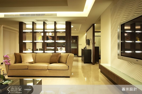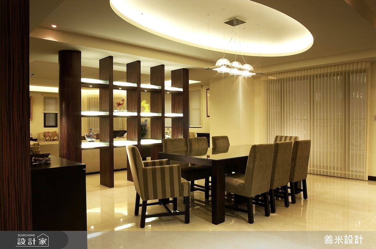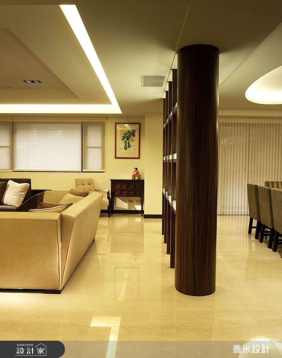 一家四口入住在开阔的5房3厅隔局里,设计师利用现代风格描绘室内,创造出干净、俐落的空间感受,客、餐厅之间藉由木作展示柜界定,营造出半开放式的隔断技法,注入艺术美学,而穿透的视觉感受更让领域间产生对话与互动。 玄关处以石材壁面为底,搭配深咖啡色系的木作矮柜与鲜豔彩度的中式瓷器,随着间接照明的映照下,形塑东方意象之美,创造绝佳的迎宾美学。整体空间以白色为基底,简约又不失大器风範,局部则利用深色调做为对比搭配,烘托出内敛、沉稳的空间感受,ㄧ扫单调的视觉造型;电视墙以白色的造型波浪板衬底,营造出渐层视感,皮革沙发的安排下,展现高贵、尊爵的非凡气质;大型木作的开放展示柜让客、餐厅领域分明,同时随着层架上艺术品的更替,调和人文艺术之美;餐厅区的天花板以弧形勾勒层次,搭配简约线条的吊灯,流露出大器之姿;餐桌一旁还规划吧檯,让领域机能更显完善,是屋主休閒午后的好去处,也是接待三五好友的绝佳领域。小編的最愛设计师运用和谐的搭配手法,带出家居独到的空间特色,而最令我嚮往的,尤其浴室空间感良好且淋浴设备多变,更具备宽阔的浴缸,营造出舒适无限的使用体验!
