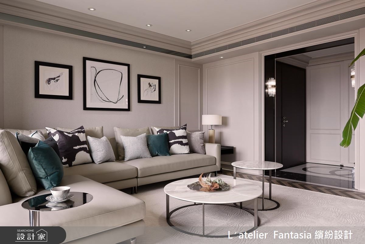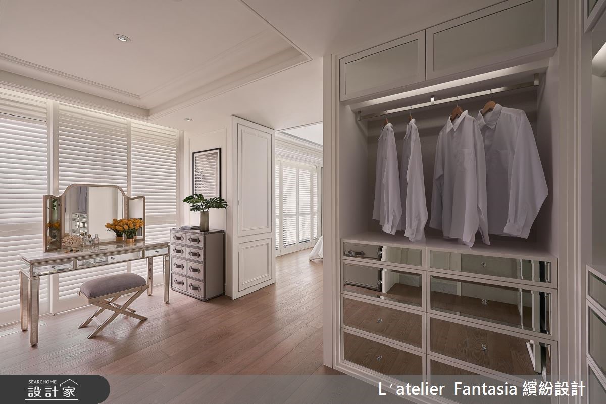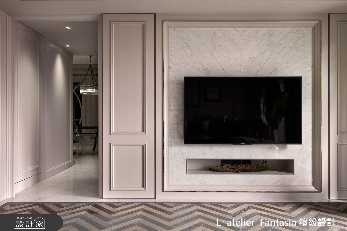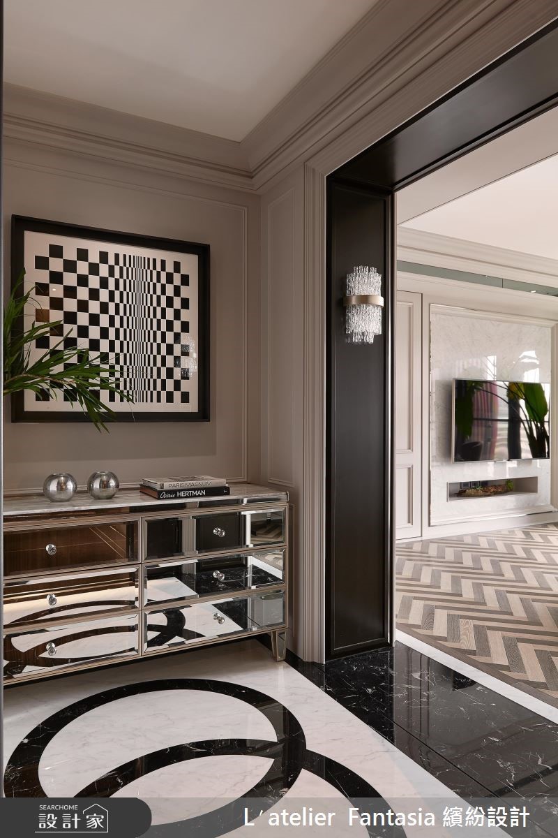135平方米的二手房屋龄 7 年,屋况皆还在优良範围内,缤纷设计团队看见了採光与格局方正的基地优势,注入优雅纯净的新古典风格,为屋主夫妻打造经典生活!玄关比照欧美大宅,以独立设计佐端景墙,打造内外场域分野,黑白拼花大理石以及镜面材质玄关柜形塑了精緻且高档的迎宾景象。利用门框造型以及线板串接公领域的立面样貌,更以镜带与天花线板结合,营造俐落且简约的清爽感受,与以往的奢华概念截然不同。针对色彩搭配,设计师採用低彩度的白、灰与大地色系,搭配相当时髦的大理石、金属元素以及植栽,增添了前卫的现代氛围。小编的最爱设计师将夫妻二人的私领域空间拉大,主卧囊括了宽敞的更衣间与梳妆台,以色调缤纷粉嫩的墙纸增添童趣感,更在更衣间区域加入收纳镜柜以及优雅的单品,两人皆能拥有充裕的换装空间。