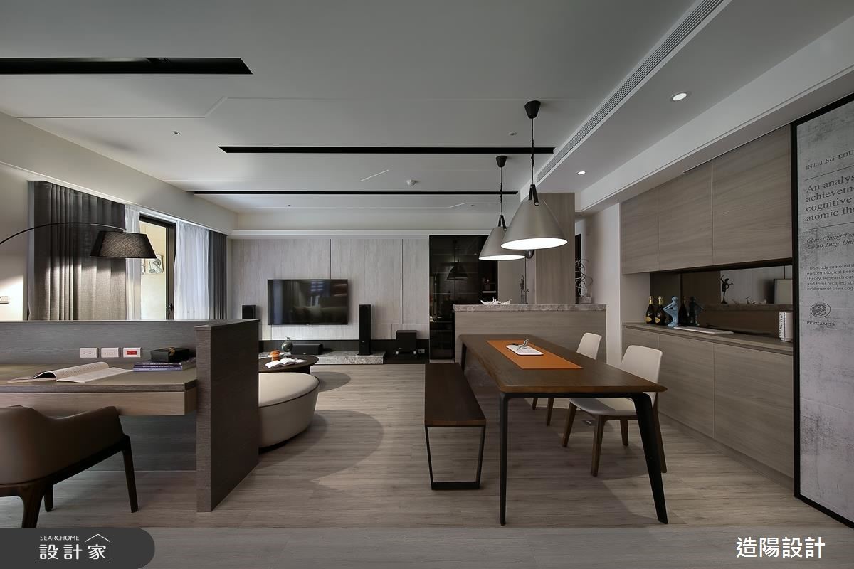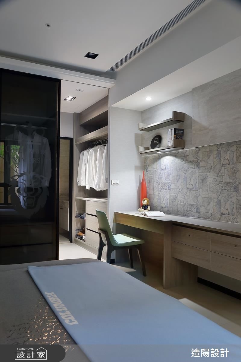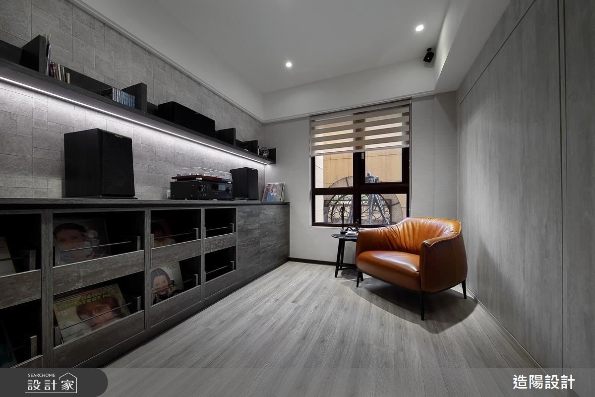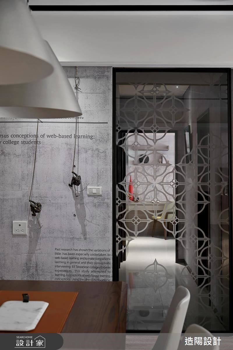 185 平米现代风家居,屋主身为教育博士,本案除了作为单身宅自住之外,还希望可将空间做为学术研讨使用,除此之外,也期待可符合自身兴趣,打造一间独立的黑胶唱片室,快跟着小编一起来看看吧!在客厅设计上,运用了不少线条比例分割,传递着屋主喜爱的现代风简洁风格,并配置佈满绿意植栽的大露台空间,使研习学生多了可休憩的活动领域,并串起着公领域生活机能;餐厅墙面则巧妙选用仿清水模壁布,将屋主的发表论文,以烙印型式作为主墙表情,并装饰小铁人象徵努力不懈的往上攀爬,诠释屋主的教学与研究热忱,一旁连结清玻隔屏推拉门,以艺术喷纱图案做视觉妆点,细腻地呈现风格特色;而卧房内,则划分为睡眠、书房与更衣领域,透过柜体的安排,合宜安排每道机能;黑胶室内,更配置了隐藏式上掀四件套,让空间随时可变为临时客房使用,网罗更多弹性主题!小编的最爱 主卧床头墙採以素雅灰色裱布处理,加上垂坠的吊灯设计,让有睡前阅读习惯的屋主,更能放鬆度过美好夜晚,床尾墙面更铺陈世界地图墙纸,展现个人远大的志向与努力成就!