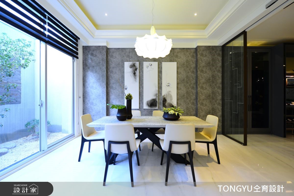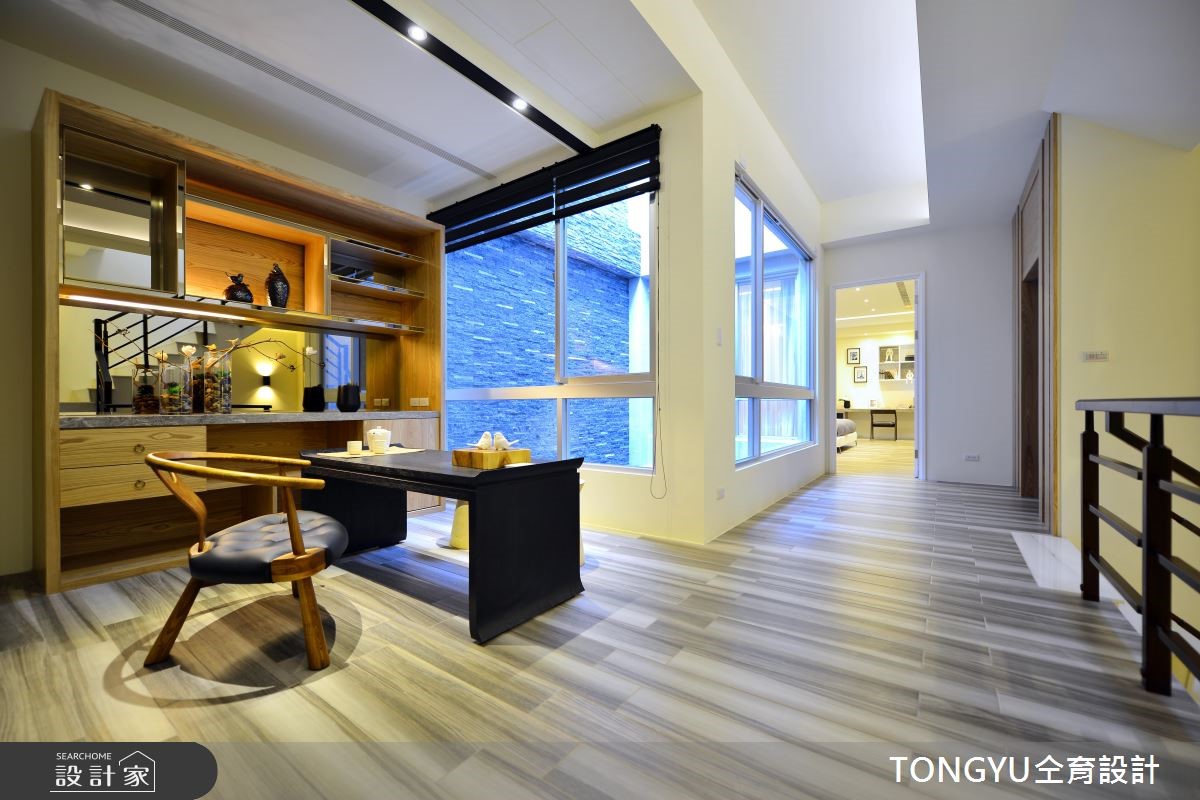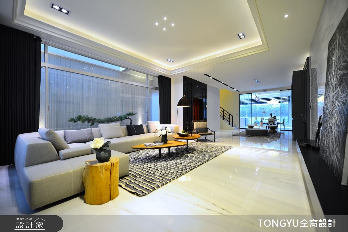 现代风人文居所,以「休閒」、「现代」、「人文」为设计主轴,选配存在感十足的特色傢饰,结合现代简约创作手法,辅以在地人文气息,呈现宜人舒雅的好宅。公共区域採开放式设计,将吧檯放置在公领域中心,作为连接客、餐厅桥樑,巧妙将不同机能的区域相互连结,同时扩大各区块使用範围。设计师运用灰玻、黑镜、大理石等黑灰白色系搭配,为公领域打造低调奢华的质感氛围,并运用木色系桌椅,增添一丝温暖气息。另外,透过玻璃穿透,除了能一赏庭院景观,巧妙让室外绿意及日光延伸入内,增添活力感。私领域的部分皆採用木质地板,并运用简约设计呈现放鬆纾压氛围。在内敛简约、融合质樸自然与开放光线的空间,使人思虑顿时沉澱,并将烦嚣抛诸脑外。小编的最爱楼梯一上来的平台,打造成开放式书房或是休憩空间,将视觉感放大,发挥空间机能同时作为各楼层相互交流的公共区域。