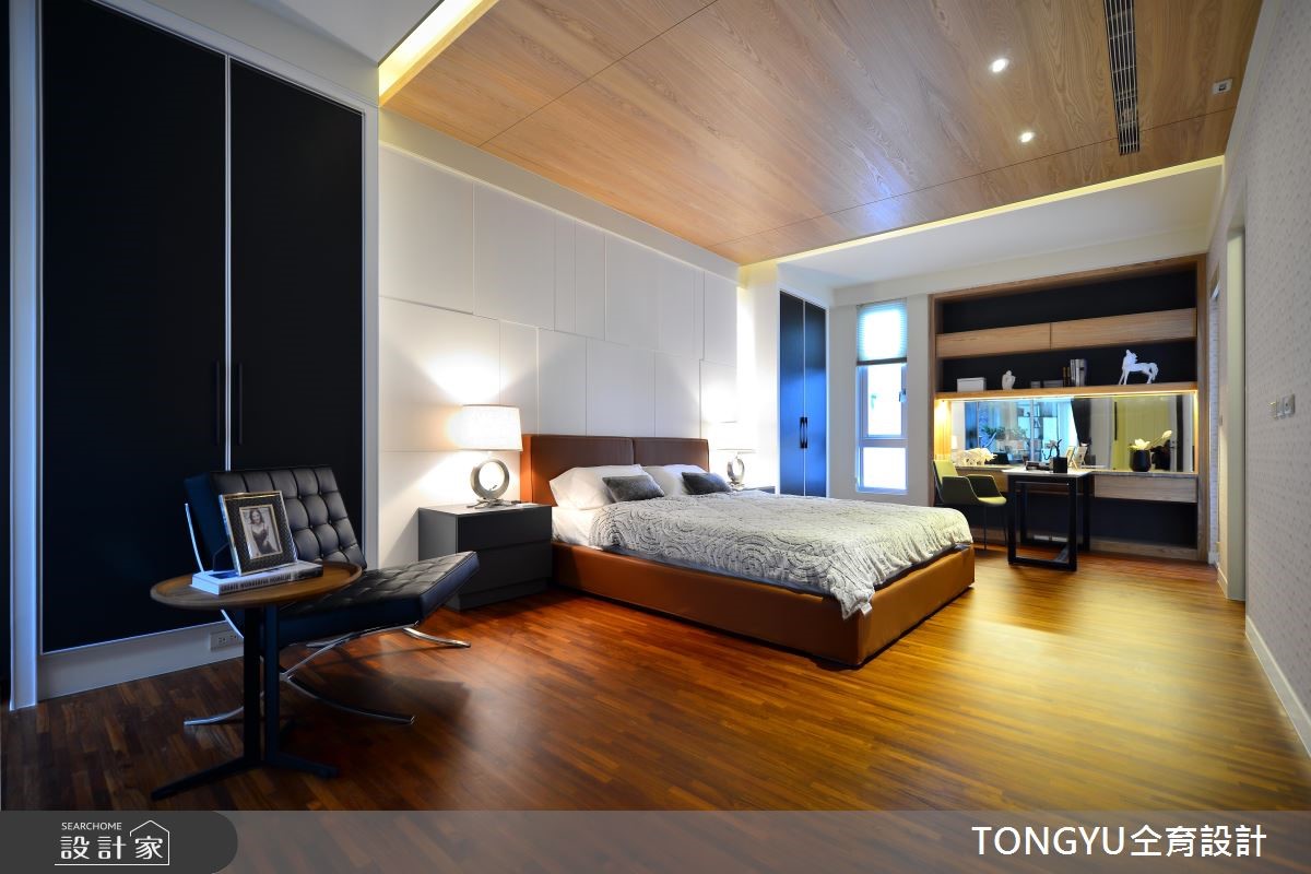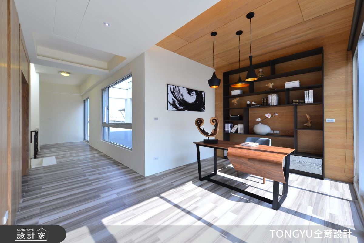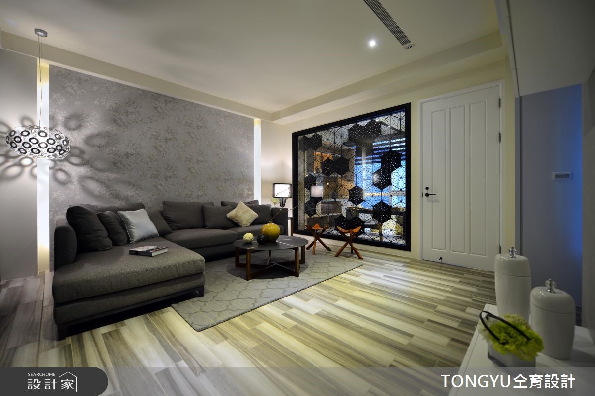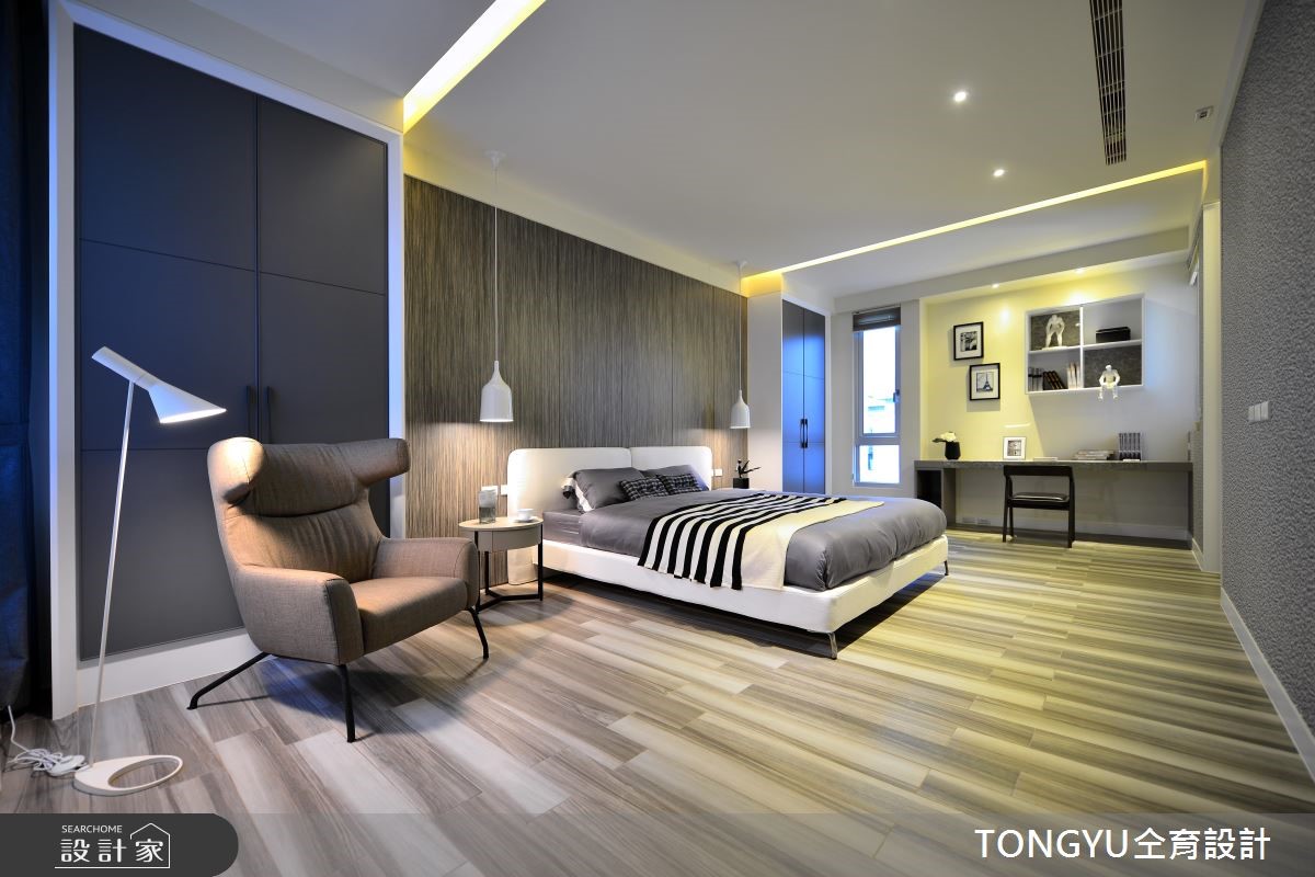 现代风人文居所,以「休閒」、「现代」、「人文」为设计主轴,选配存在感十足的特色傢饰,结合现代简约创作手法,辅以在地人文气息,呈现宜人舒雅的好宅。公共区域採开放式设计,将吧檯放置在公领域中心,作为连接客、餐厅桥樑,巧妙将不同机能的区域相互连结,同时扩大各区块使用範围。设计师运用灰玻、黑镜、大理石等黑灰白色系搭配,为公领域打造低调奢华的质感氛围,并运用木色系桌椅,增添一丝温暖气息。另外,透过玻璃穿透,除了能一赏庭院景观,巧妙让室外绿意及日光延伸入内,增添活力感。私领域的部分皆採用木质地板,并运用简约设计呈现放鬆纾压氛围。在内敛简约、融合质樸自然与开放光线的空间,使人思虑顿时沉澱,并将烦嚣抛诸脑外。小编的最爱楼梯一上来的平台,打造成开放式书房或是休憩空间,将视觉感放大,发挥空间机能同时作为各楼层相互交流的公共区域。