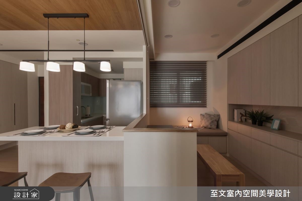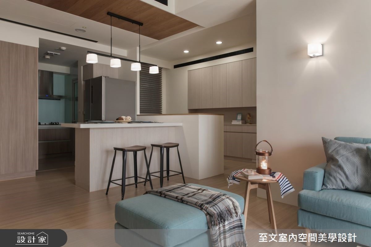 已届退休年龄的屋主夫妻,为了给未来的自己安定的生活环境,选择了拥有河景、周边机能完善的86平米二手房,惟原始装修过度花俏且天花板高度压迫。至文装修团队为夫妻俩重整风格与动线、增添收纳,创造崭新的生活样貌。首先,由于夫妻二人皆偏好简单、清爽的风格,设计师拆除繁複设计,在天地壁採用大量木元素搭配灰、白色调,营造温馨宜人的北欧样貌。以木皮局部点缀的天花板,佐以电视主墙的仿清水模塗料,更让空间跳出日式风味。接着,针对动线问题,由于原始公领域并未预留餐听位置,厨房收纳更不敷使用;因此设计师以附有收纳的吧台替代餐桌,并拆除厨房与书房的玻璃隔断,达到空间释放、视觉放大的目的。由于屋主重视收纳机能,因此设计师特别自玄关打造大面积收纳柜,与电视墙机柜接合;书房墙面、吧台下方也以柜底为主,提供充裕空间。小编的最爱卧房採简约线条与色调勾勒,收纳柜面改以织纹取代,达到增添空间高级感目的,让私领域展现富有层次的暖度。