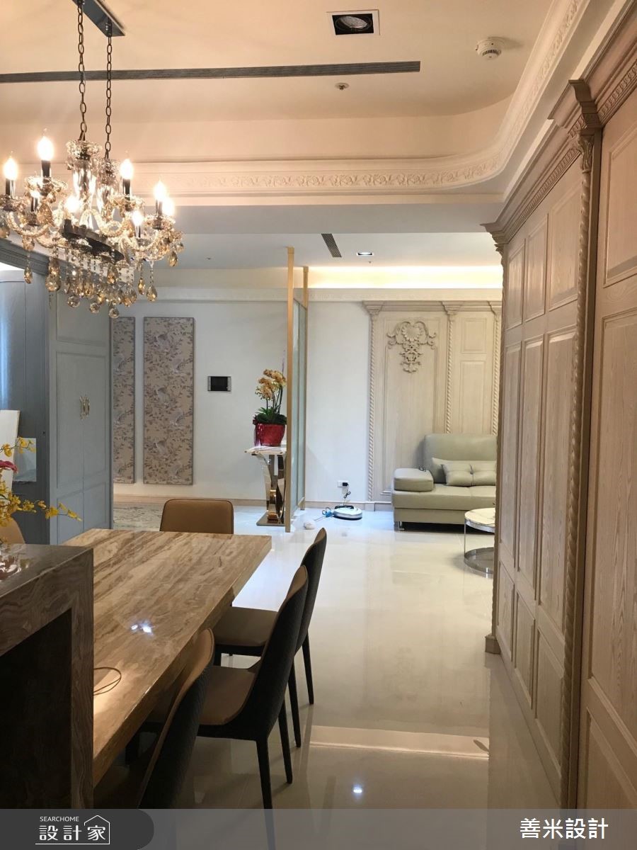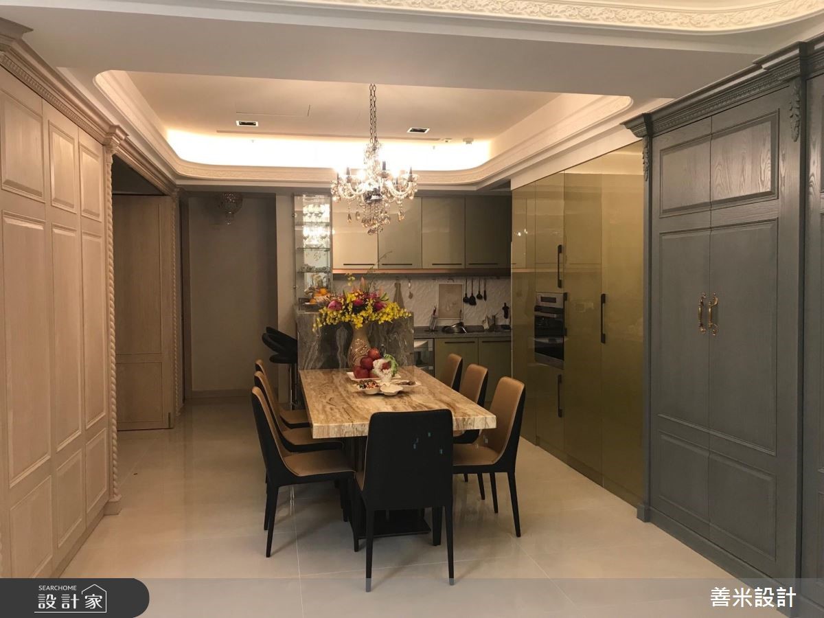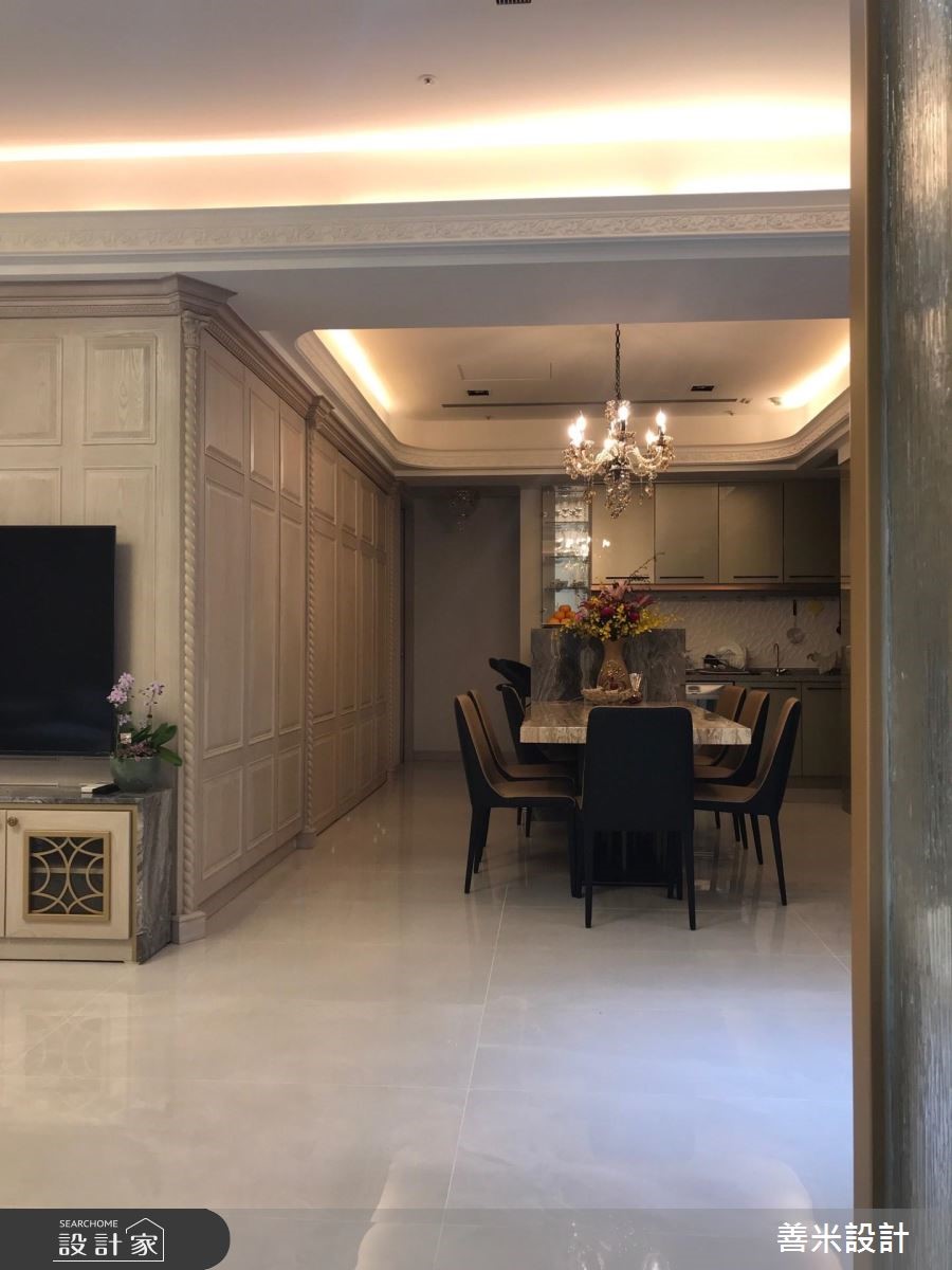 设计师融合欧式古典与现代风格,透过风格的多重混搭,精準掌握屋主一家的各自喜好,契合家族成员们的各自想望,描绘出理想的居家轮廓,快跟着小编一起来看看吧!玄关,铺陈马赛克图腾地砖,搭配三幅古典花纹画框凝聚端景,形成气派又典雅的入口场景;公领域,则加入洗白的仿旧感木皮,并妆点欧式斜角线板,搭配天花悬吊的古典灯饰,成就优雅和谐的大器视野,电视墙更结合透明清玻展示柜,用以陈列精緻收藏,彰显屋主的生活品味;并运用开放式格局放大空间感受,流畅串联玄关、客、餐厅等场域,凝聚更密切的互动情境,餐厅区则加入古铜金门片、石材餐桌等缔造材质的丰富层次,成就一家人连繫感情的最佳场域;主卧,延续了公领域的木质设计,在床头两侧装饰璀璨壁灯,搭以欧式线板包覆装饰,显出高贵的墙面风采!小编的最爱 设计师透过浅木色连贯公、私领域,再搭上魅力单品,使空间充满着高雅却亲民的氛围,完成一家人的生活愿景!