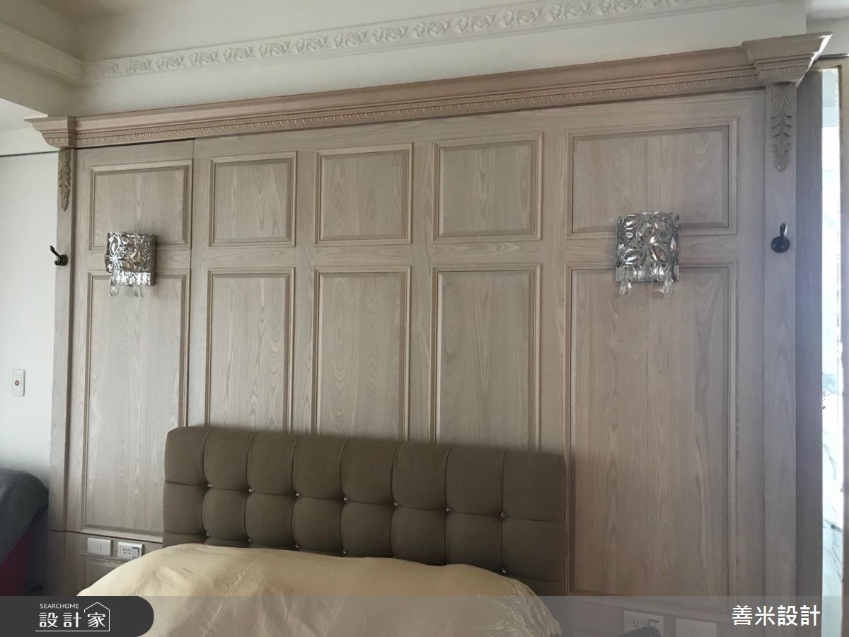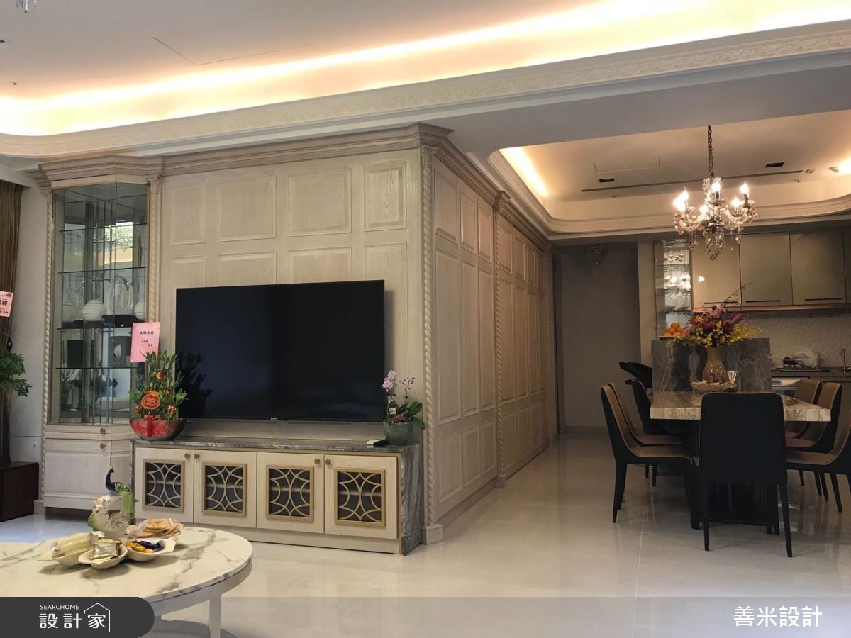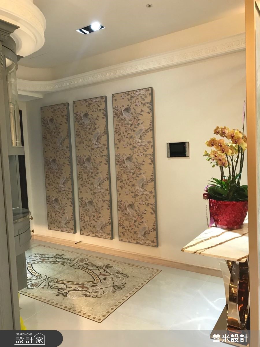 设计师融合欧式古典与现代风格,透过风格的多重混搭,精準掌握屋主一家的各自喜好,契合家族成员们的各自想望,描绘出理想的居家轮廓,快跟着小编一起来看看吧!玄关,铺陈马赛克图腾地砖,搭配三幅古典花纹画框凝聚端景,形成气派又典雅的入口场景;公领域,则加入洗白的仿旧感木皮,并妆点欧式斜角线板,搭配天花悬吊的古典灯饰,成就优雅和谐的大器视野,电视墙更结合透明清玻展示柜,用以陈列精緻收藏,彰显屋主的生活品味;并运用开放式格局放大空间感受,流畅串联玄关、客、餐厅等场域,凝聚更密切的互动情境,餐厅区则加入古铜金门片、石材餐桌等缔造材质的丰富层次,成就一家人连繫感情的最佳场域;主卧,延续了公领域的木质设计,在床头两侧装饰璀璨壁灯,搭以欧式线板包覆装饰,显出高贵的墙面风采!小编的最爱 设计师透过浅木色连贯公、私领域,再搭上魅力单品,使空间充满着高雅却亲民的氛围,完成一家人的生活愿景!