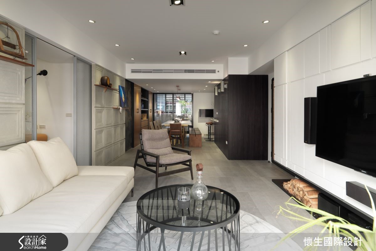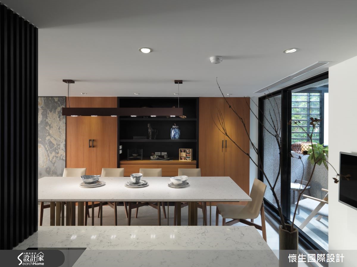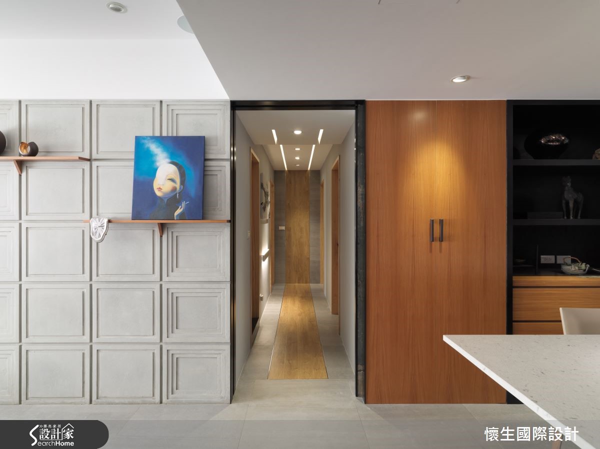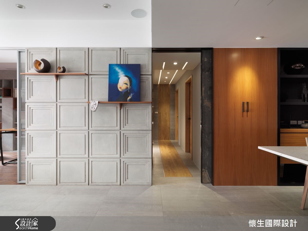 264 平米酒店风人文宅邸,透过格局重整,将三十年以上老屋改头换面,呈现简约质感气息,并利用异材质及灯光等搭配,明亮空间,开拓视野,营造静谧纾压家居氛围。入门后,映入眼帘的清水模沙发背墙,利用隔板放置特色艺术品,成功化身端景墙。客厅区白色电视主墙兼具隐形收纳机能,且利用大面积白色系透亮空间视野。书房规划在客厅沙发后方,採用网格隐形推拉门做隔断,将书房独立于公领域,同时可作为多功能客房。餐厨区中岛设计成小吧台,并选用长形餐桌,方便屋主招待客人时使用。阳台位在餐厨区旁,落地窗推拉门设计,为空间注入更多自然光源,让光线流畅于公领域。公、私领域以隐藏门区隔,同时作为屏风,大门打开时,不让视线穿透入私领域空间。连接公、私领域的廊道,利用灯光线条、地平方米及墙面异材质组合,将视觉延伸入内。卫浴间,以瓷砖呈现卫浴间质感,并利用特色镜面丰富空间层次。小编的最爱小孩房皆利用大胆创意,设计出色彩缤纷及特色墙面收纳柜,呈现活泼氛围。并利用有限的空间以隐藏式设计或是一体成形的木板,俐落空间视觉,并增加收纳机能。
