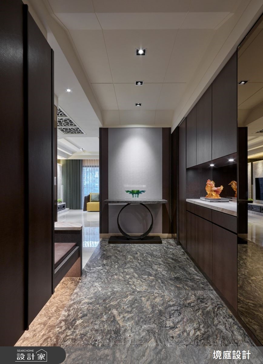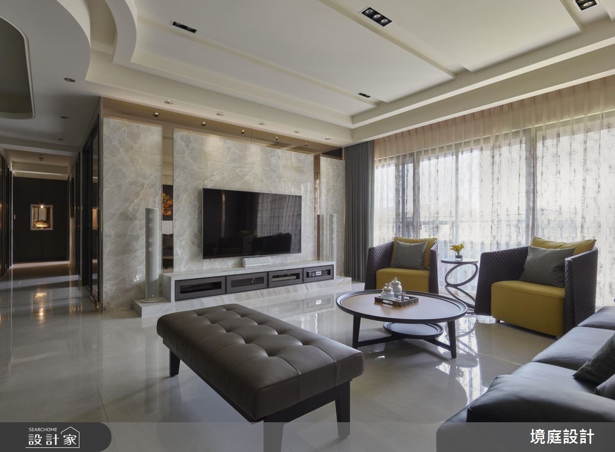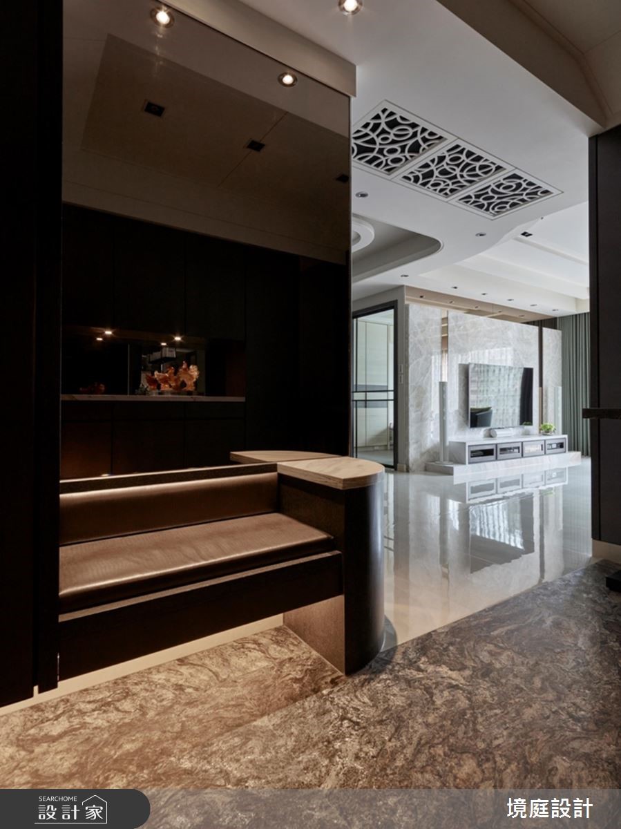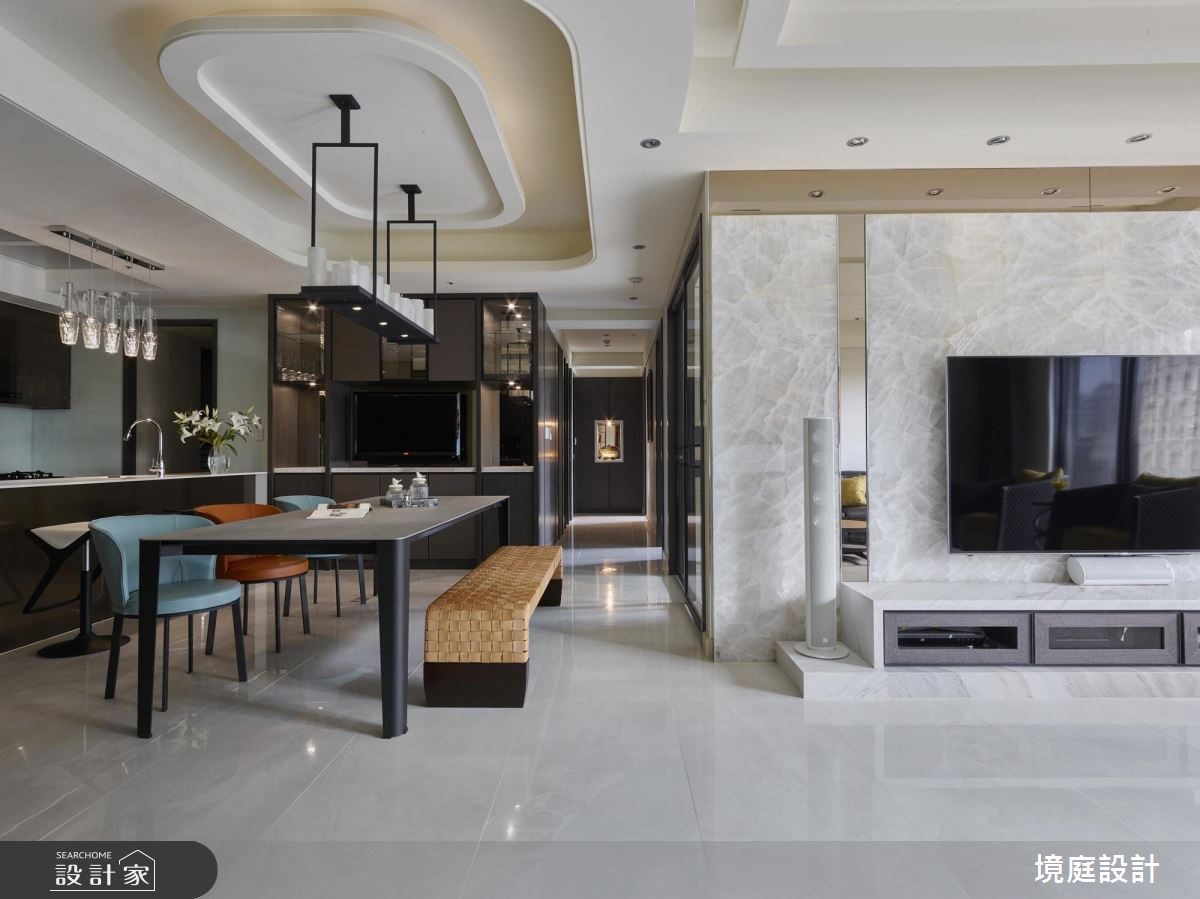 设计师透过精品混搭设计概念,引用多元建材营造空间层次,且同步悉心摆置陈设软件,衬出居宅的奢华风情,快跟着小编一起来看看吧! 玄关,采以金色大理石铺陈地面,立面则加入茶镜拓宽空间感,达到延长与拉宽尺度的效果,同时安排穿鞋椅机能,满足生活实用性;客厅区域,以沙发背墙挂画作为主要核心,发展出周边设计,并让电视主墙采石材做基底,拼接镀钛、茶镜等精致建材,创造时尚的多元层次;厨房采以开放式格局,别出心裁地以金属色泽定调,厨具面板安排不锈钢面板,透过材质堆栈丰富场域表情,天花更做出特别造型与客厅形成差异,定义不同区块的主题;私领域,依循男女主人的需求,规划双主卧型式,在床头分别铺叙金属质感壁纸或木质语汇,缔造各有特色的氛围情境!小编的最爱 同时规划一间多功能室,利用可掀式床组将机能隐于墙体之内,让空间使用更具弹性,美学与功能性兼备!