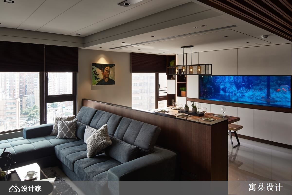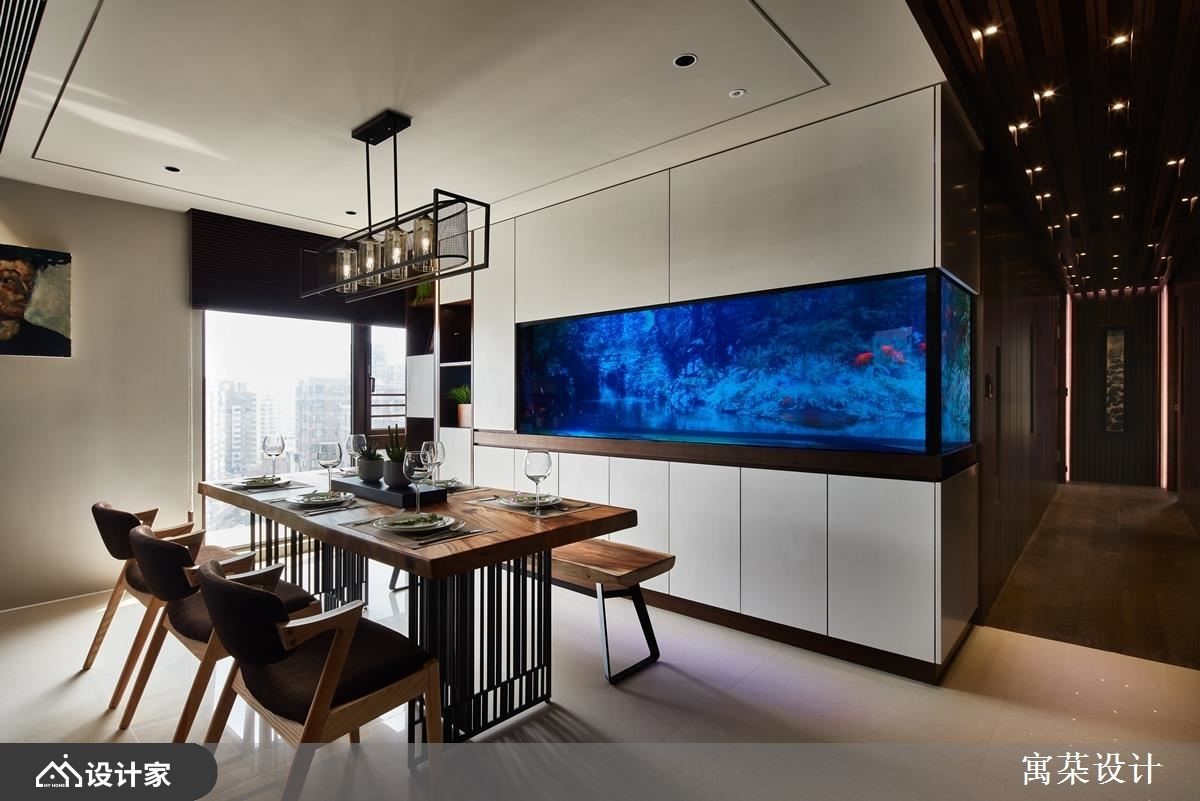 设计师改变132 平方米居家格局,将四居室改为三居室,并增设一间更衣间,同时依循男主人梦想,在餐厅置入一个大鱼缸,透过水族箱的聚焦魅力,营造木质居宅的疗愈气氛,快跟着小编一起来看看吧!公领域透过材质、色彩与光源的晕染,勾勒现代简约的居家轮廓,廊道部分则以格栅天花、繁星灯光加以缀饰,并铺陈深木作线条延伸走廊视野,客厅电视墙援引石材铺陈大器视感,并镶嵌金属饰条修饰沟缝,营造时尚精致感;餐厅与客厅之间,则配置矮墙兼备餐柜两用隔断,划出开放串联的情境,并将蓝色鱼缸嵌墙,凸显水族箱的沉静魅力,让人可在此获得视觉舒缓;主居室,延续沉淀心情的木皮肌理,以皮革铺设床头,彰显现代典雅的风韵,床头后方更隐藏更衣空间,大幅提升寝卧机能!小编的最爱 设计师透过格局分配、材质颜色,以及造型线条的勾勒,凸显出恰到好处的视觉份量,使居住者不只看得见美感,更摸得到满满的居家质量!