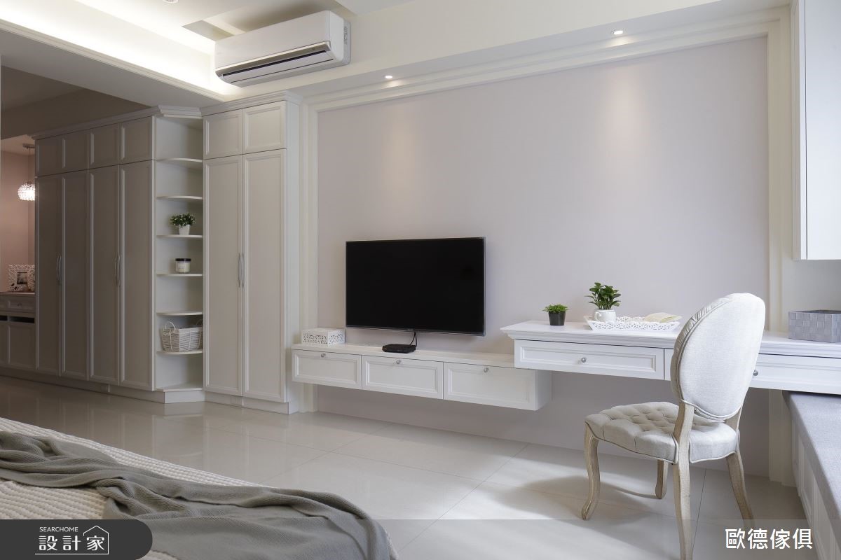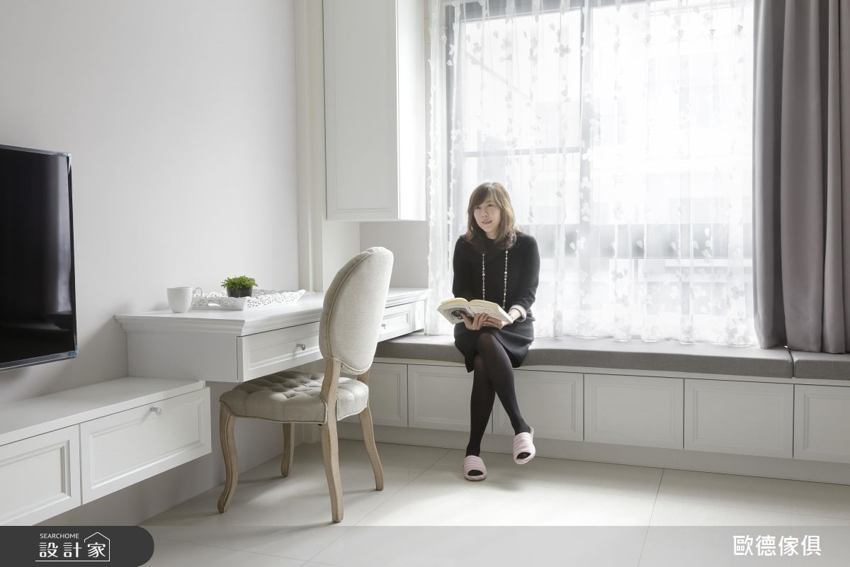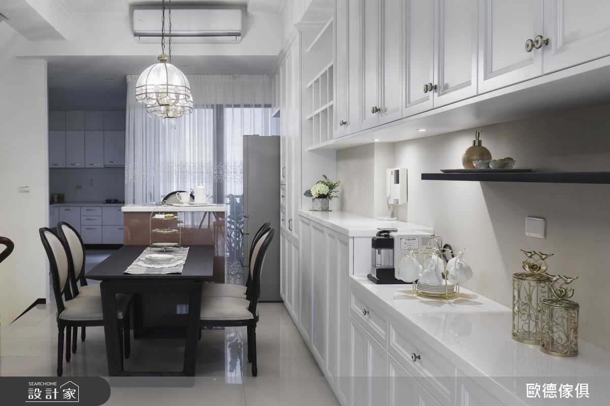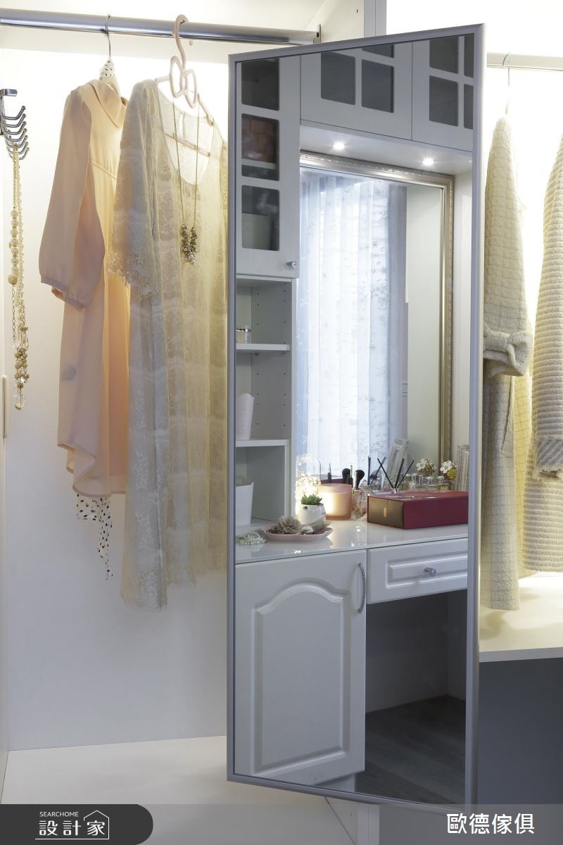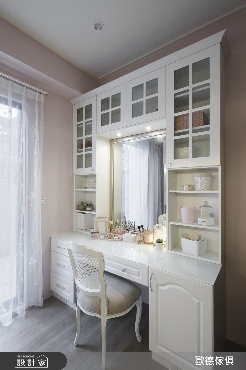 系统家具在室内设计已逐渐晋升为美型可高于机能的地位,欧德设计团队为一家三口的 165 平米量身打造,克服了屋型狭长、採光以及单层面积有限的困扰,完成了简约清新的浪漫美式风格。由于屋主喜爱优雅的美式风格,加上扣掉仅有前后採光以及单层面积不大的问题,设计师将大量纯白线板应用在柜体与天花板,搭配裸色调,营造简约淡雅的气息,更放大视觉感受。依据屋主的生活习惯,以白框玻璃推拉门串连客厅与餐厨空间,打造随心自如的开放设计。餐厅以白色木作打造迷你中岛吧台,是女主人平时最能放鬆的空间。针对主卧设计,设计师于壁面与软件注入浅紫色调,增添了浪漫柔美的氛围,更于窗边设置飘窗,同时兼具观景与收纳机能。小编的最爱设计师特别为女主人打造了梦寐以求的独立更衣间,墙面漆上粉红色,并在 L型衣柜内部设置大面旋转镜,可随时抽出整体仪容,美观又具机动性。