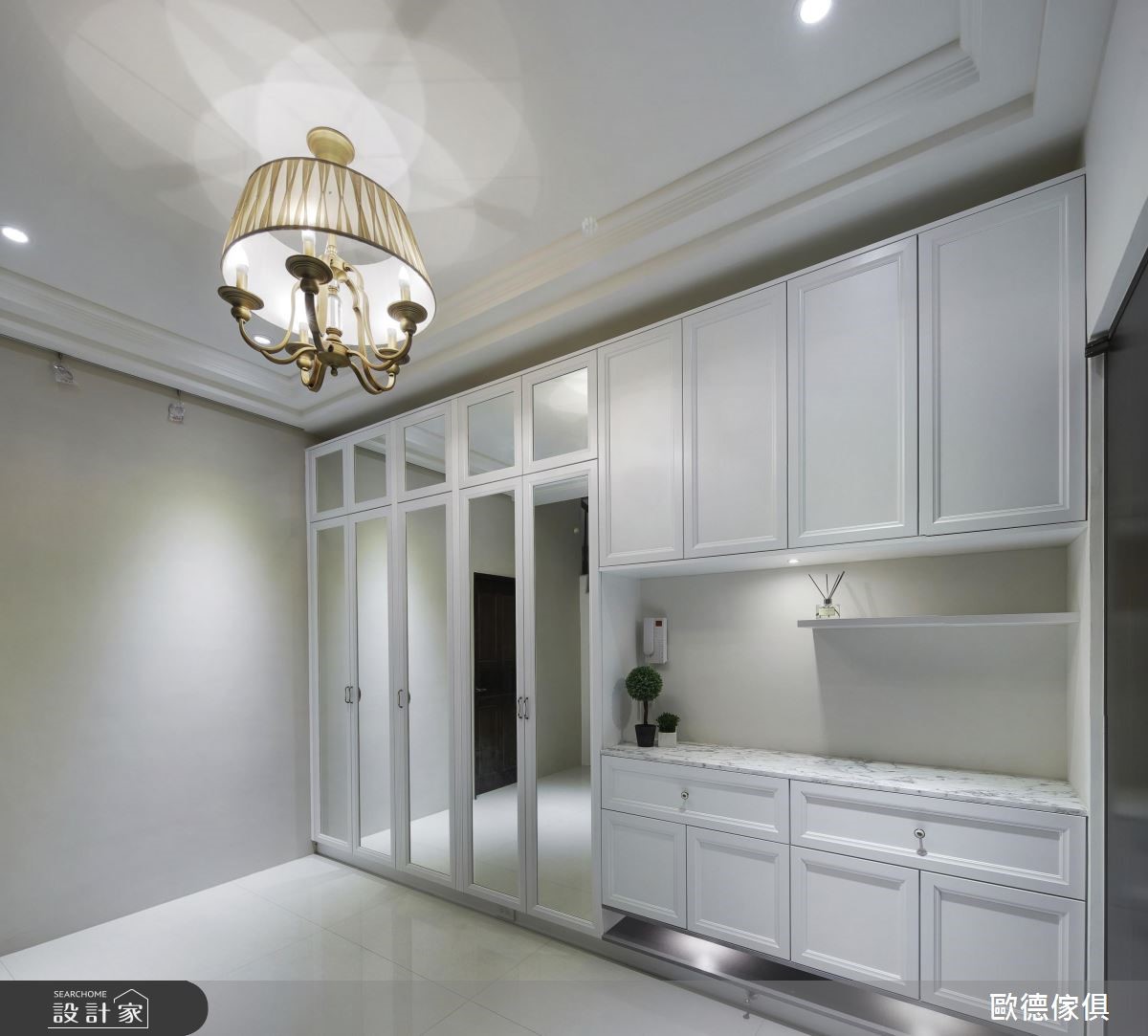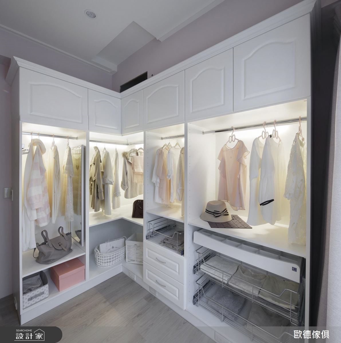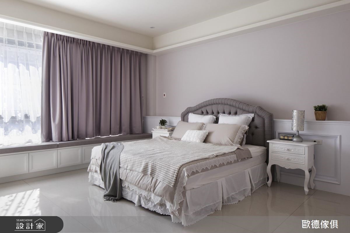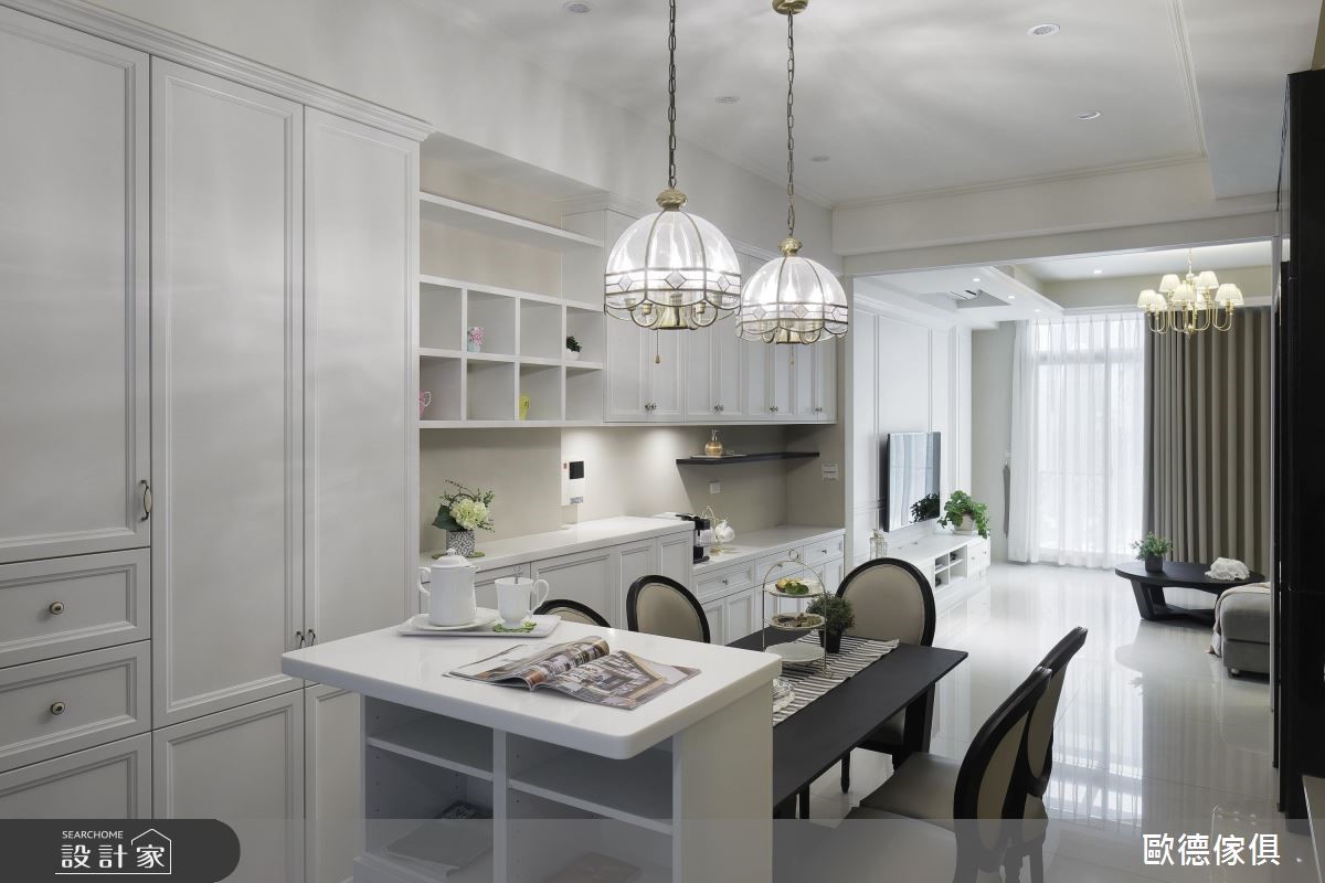 系统家具在室内设计已逐渐晋升为美型可高于机能的地位,欧德设计团队为一家三口的 165 平米量身打造,克服了屋型狭长、採光以及单层面积有限的困扰,完成了简约清新的浪漫美式风格。由于屋主喜爱优雅的美式风格,加上扣掉仅有前后採光以及单层面积不大的问题,设计师将大量纯白线板应用在柜体与天花板,搭配裸色调,营造简约淡雅的气息,更放大视觉感受。依据屋主的生活习惯,以白框玻璃推拉门串连客厅与餐厨空间,打造随心自如的开放设计。餐厅以白色木作打造迷你中岛吧台,是女主人平时最能放鬆的空间。针对主卧设计,设计师于壁面与软件注入浅紫色调,增添了浪漫柔美的氛围,更于窗边设置飘窗,同时兼具观景与收纳机能。小编的最爱设计师特别为女主人打造了梦寐以求的独立更衣间,墙面漆上粉红色,并在 L型衣柜内部设置大面旋转镜,可随时抽出整体仪容,美观又具机动性。