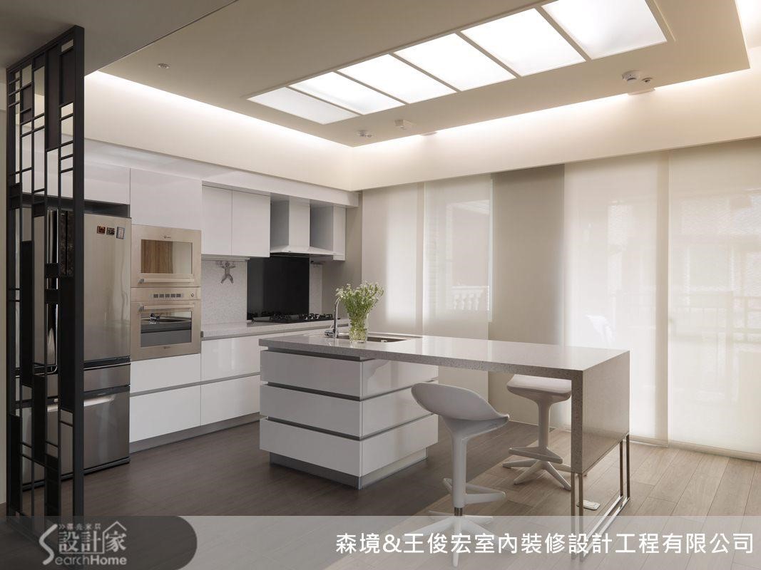 餐厨区以简约利落设计为主,除了落地大窗纳入采光,天花则加入流明设计,让阴暗空间更加明亮。沿墙设置L型的操作平台,也增设小型中岛,营造机能性高的用餐空间。