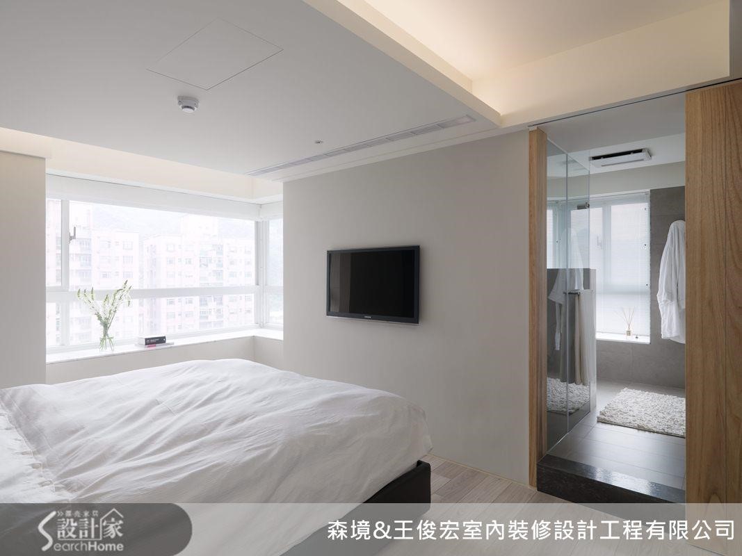 主卧卫浴些微更动,使卫浴门片与电视墙齐平,视觉更为俐落,卧室动线也更为流畅。卧室地面延续了公共区域的浅色木板地板,搭配白色衣柜与电视墙面,透过木质元素点缀,轻盈却不失温润感。