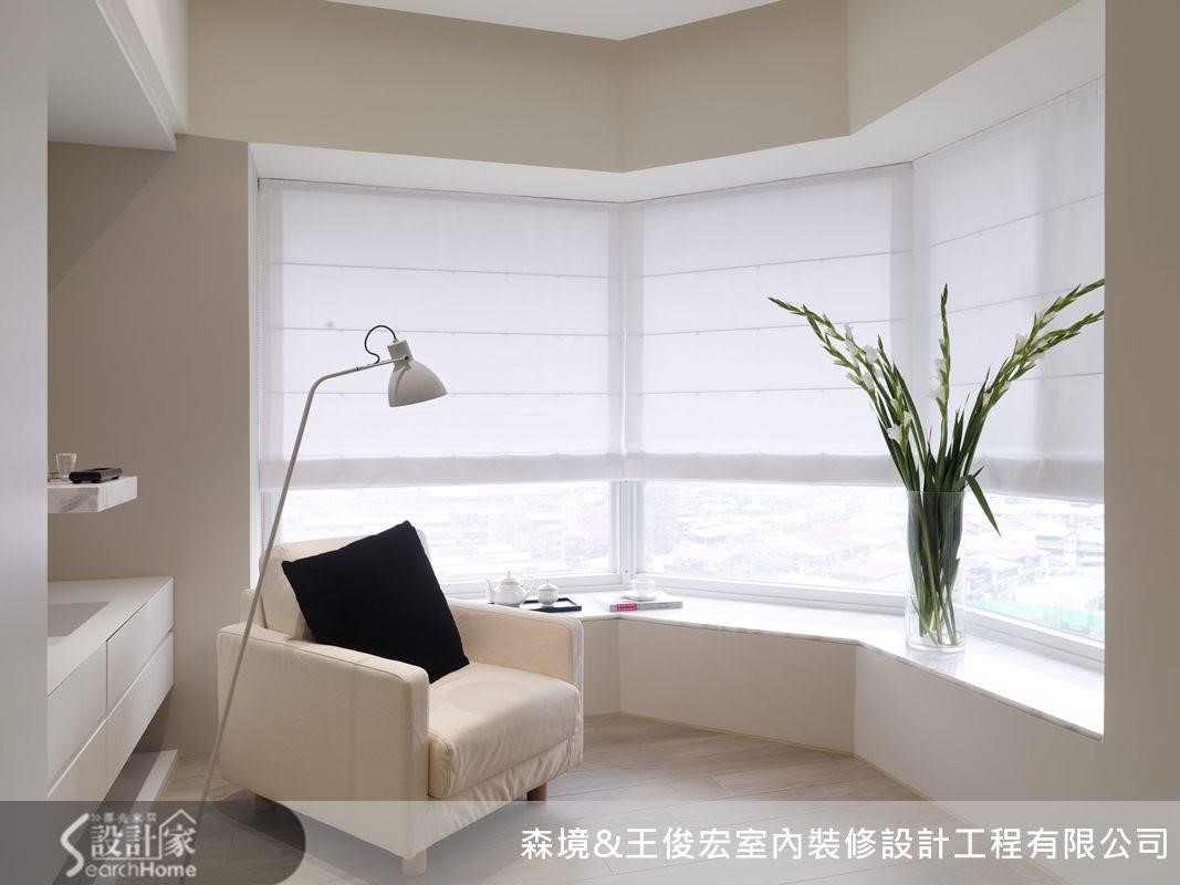 由于临窗处的空间为不规则状,较难利用,因此此区刻意架高地板,并增设飘窗。让屋主可以全然放松,享受都市景色与日光温暖,白色窗台搭配着白色罗马帘与绿植,无疑是小憩休息的悠闲角落。