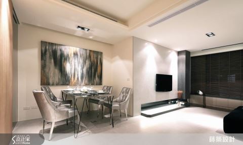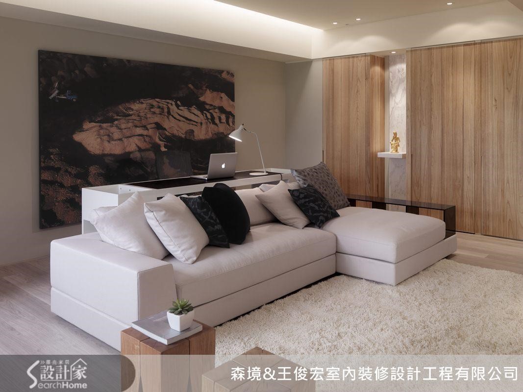 客厅与工作区合并,不仅强化空间的机能性,让动线流畅外,视觉上也显得开放通透。L 型白色沙发与简约的电视墙相映,诉说自然惬意的生活精神;而工作桌后方的抽象画作,则突显居住者的艺术美感。
