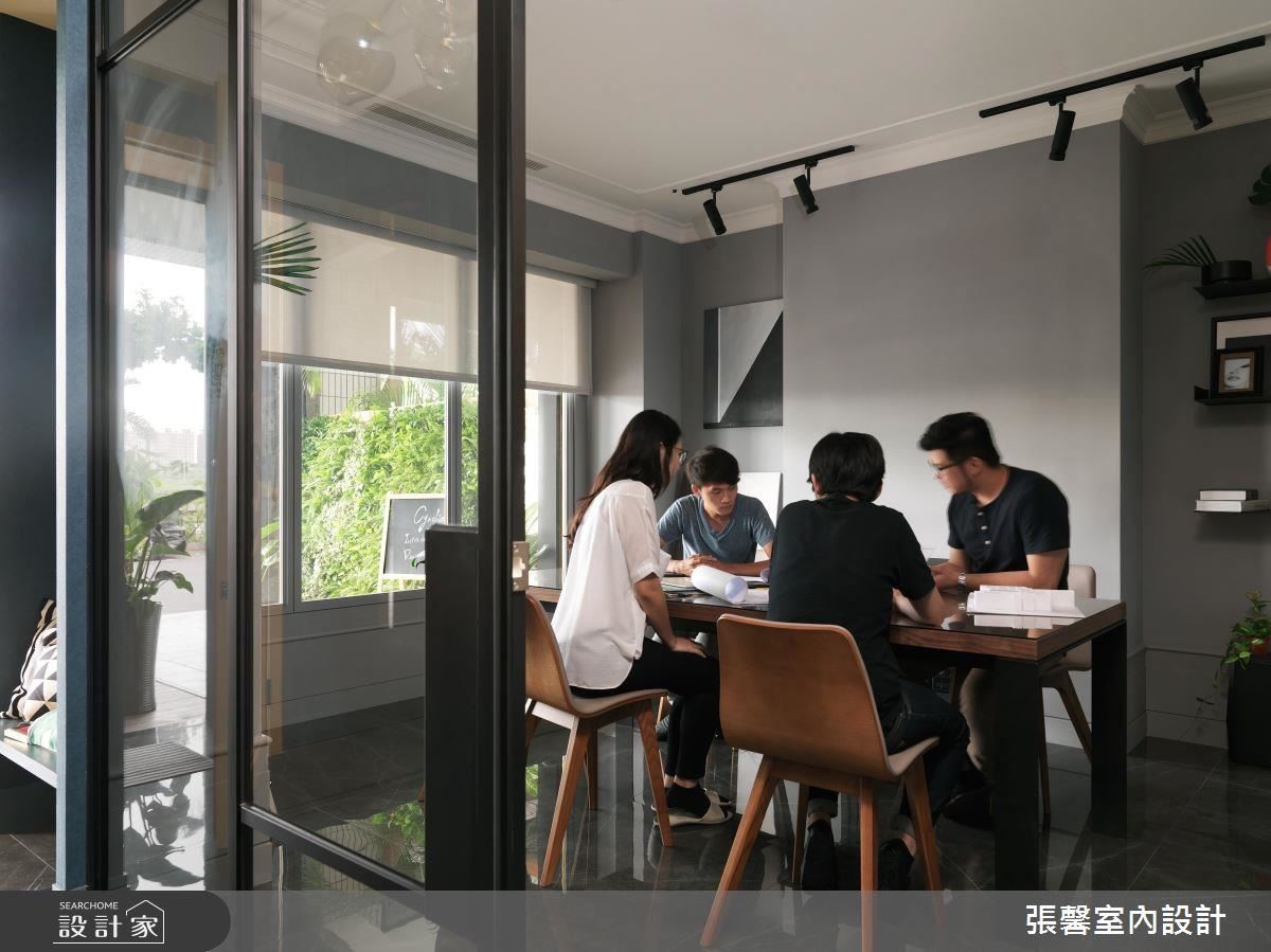 一楼左侧的会议室,采用轻透隔断导引充沛光线,营造精神奕奕的场域观感,让充满正面能量的环境氛围,成为设计计师们集思广益的园地。
