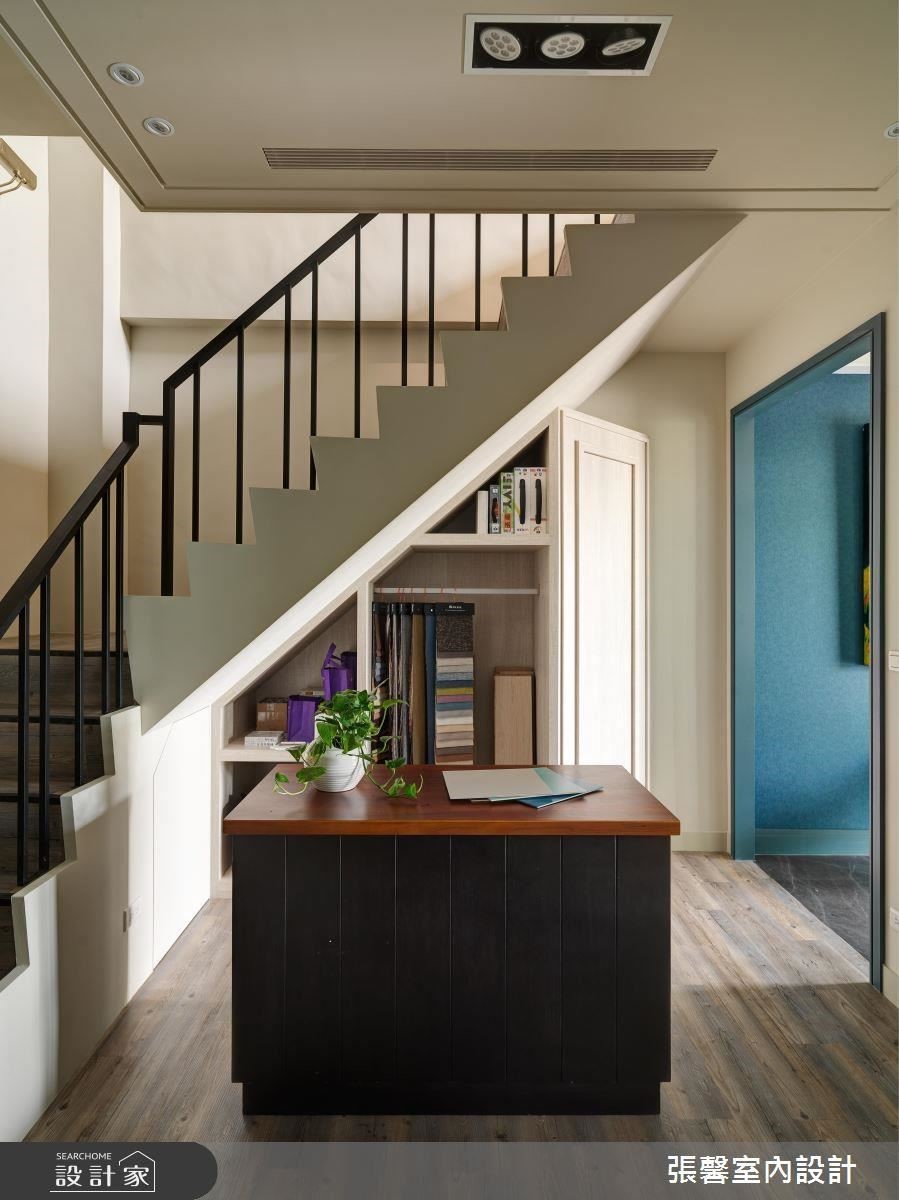 除此之外,另在楼梯旁安置一座轻食区中岛台,除了当作同仁们闲暇休憩的场域,当在此工作的设计师们缺乏灵感时,也可以至此边吃边讨论。楼梯下方并规划收纳机能,让零碎空间也能发挥使用效率。