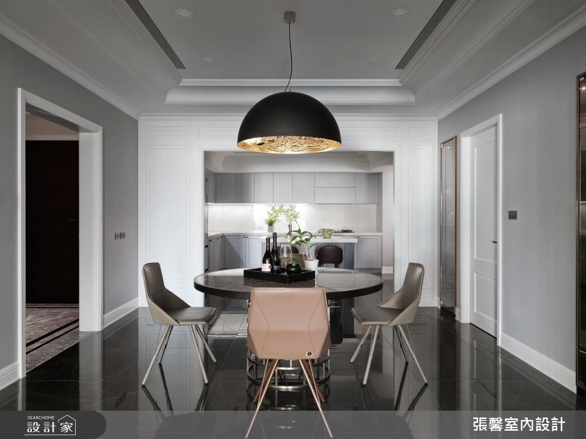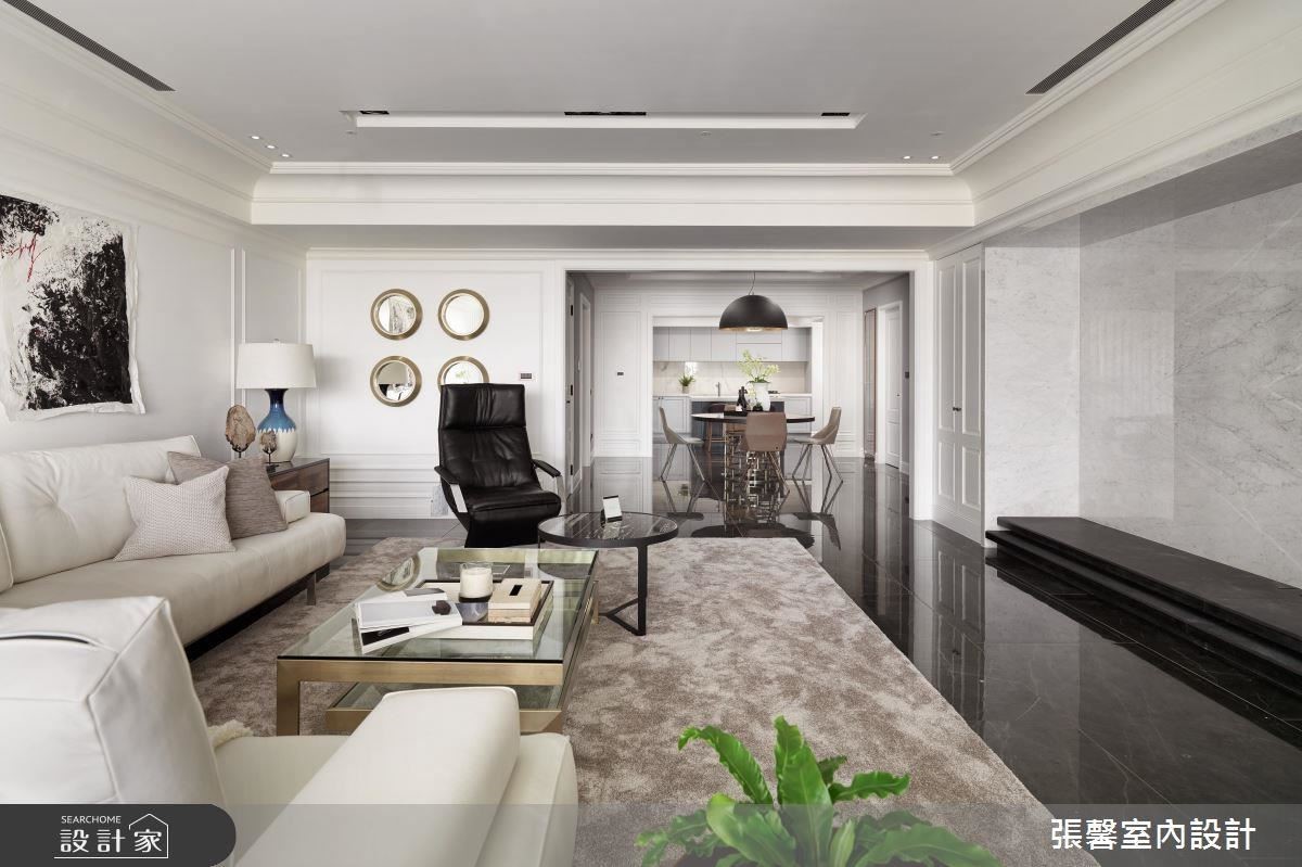 透过设计师的巧思,融合美式古典细节的现代宅,呈现优雅时尚的氛围;而且原本因为大梁横亘,让空间显得突兀而压迫的客厅,巧妙运用古典线板的收框修饰,不仅化解问题,更营造出独具美感的丰富层次。